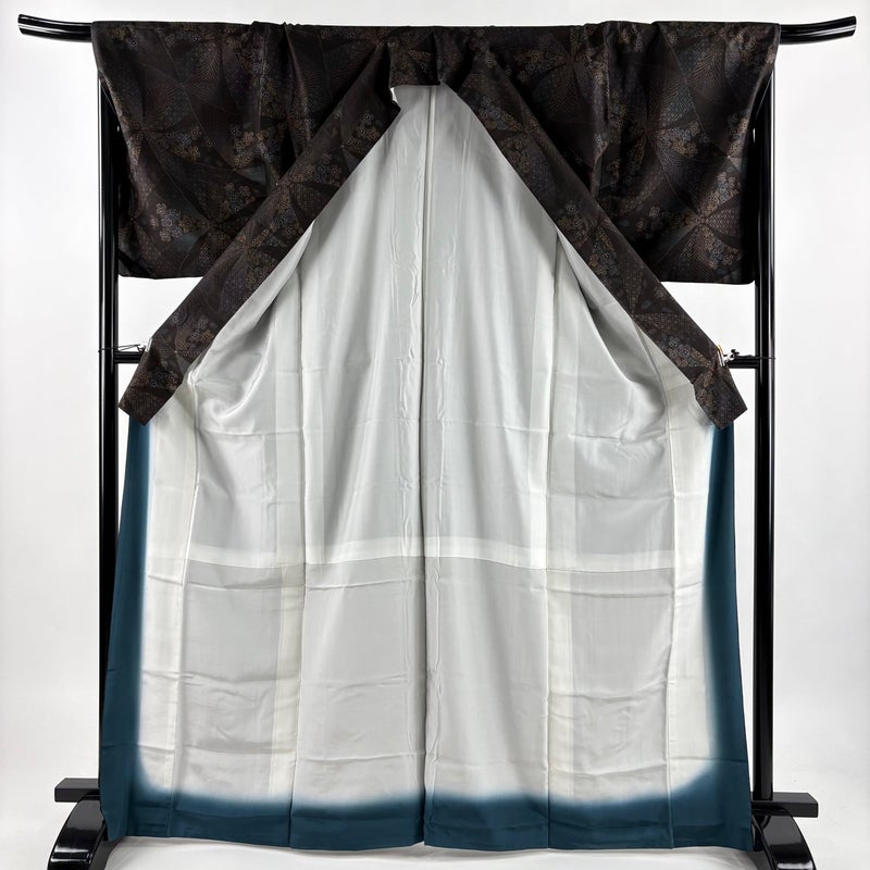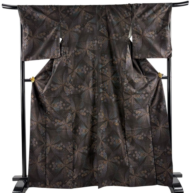 【着物ランク】名品 【素材】正絹 【身丈】約168cm 【裄丈】約68.5cm 【袖丈】約52.5cm 【袖幅】約35cm 【前幅】約25cm 【後幅】約30.5cm 【サイズ】L 【着物仕立て】袷 【着用時期】10~5月 【状態ランク】ランクB 【着物着用シーン】気軽なパーティー、観劇、食事会、正月、気軽なお茶会、街着