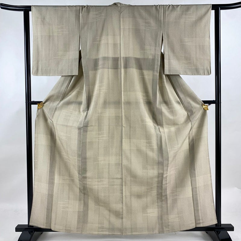 【着物ランク】名品 【素材】正絹 【身丈】約161.5cm 【裄丈】約62cm 【袖丈】約49.5cm 【袖幅】約32.5cm 【前幅】約23cm 【後幅】約28.5cm 【サイズ】S 【着物仕立て】単衣 【着用時期】6/9月 【状態ランク】ランクA 【着物着用シーン】気軽なパーティー、観劇、食事会、正月、気軽なお茶会、街着