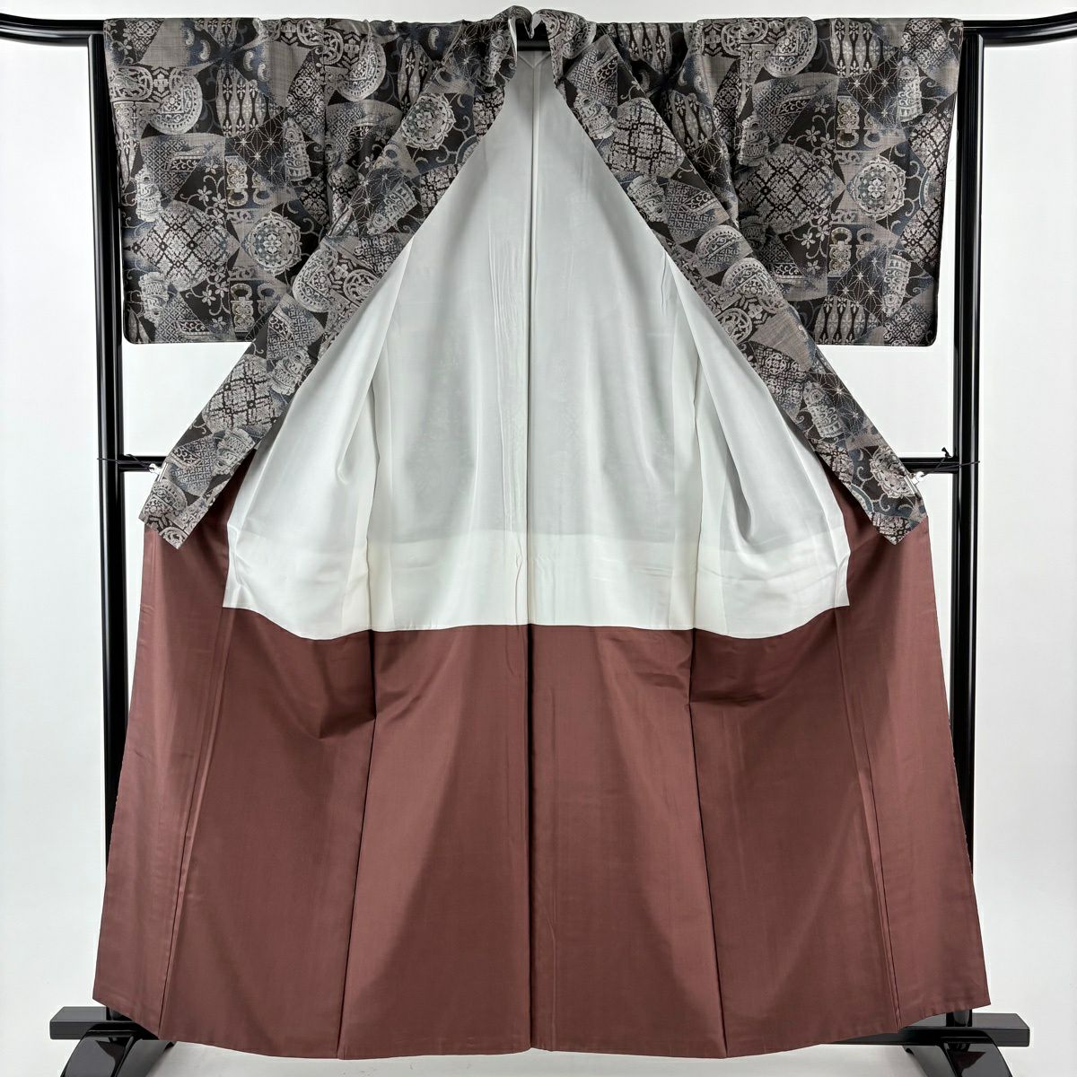 他の画像を見る 【美品】 大島紬 身丈160.5cm 裄丈66cm M 袷 純泥染 十八算 12マルキ 永長洋一 ほていや 落款あり 証紙あり 華文 器物 墨色 正絹 逸品 ¥ 182,800 税込 在庫切れ