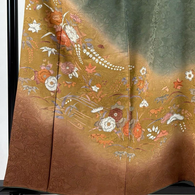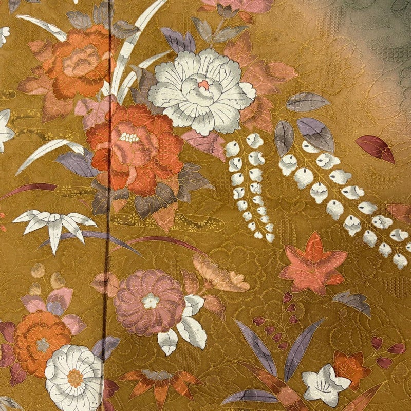 【着物ランク】秀品 【素材】正絹 【身丈】約159.5cm 【裄丈】約66.5cm 【袖丈】約48cm 【袖幅】約35cm 【前幅】約28cm 【後幅】約32cm 【サイズ】M 【着物仕立て】袷 【着用時期】10~5月 【状態ランク】ランクC 【着物着用シーン】披露宴、パーティー、式典、食事会、お茶会、正月