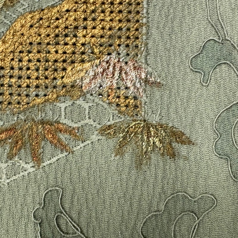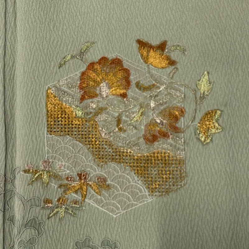 【着物ランク】秀品 【素材】正絹 【身丈】約153cm 【裄丈】約63cm 【袖丈】約45cm 【袖幅】約32cm 【前幅】約25.5cm 【後幅】約30cm 【サイズ】S 【着物仕立て】単衣 【着用時期】6/9月 【状態ランク】ランクB 【着物着用シーン】披露宴、パーティー、式典、食事会、お茶会、正月