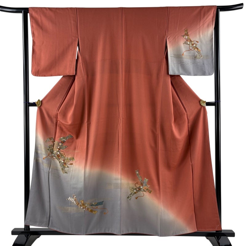 【着物ランク】秀品 【素材】正絹 【身丈】約158cm 【裄丈】約63cm 【袖丈】約49cm 【袖幅】約33cm 【前幅】約26.5cm 【後幅】約29cm 【サイズ】S 【着物仕立て】袷 【着用時期】10~5月 【状態ランク】ランクB 【着物着用シーン】披露宴、パーティー、式典、食事会、お茶会、正月