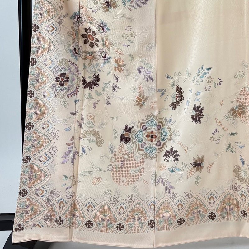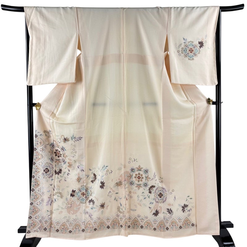【着物ランク】秀品 【素材】正絹 【身丈】約165cm 【裄丈】約66cm 【袖丈】約56cm 【袖幅】約35.5cm 【前幅】約24.5cm 【後幅】約30cm 【サイズ】M 【着物仕立て】袷 【着用時期】10~5月 【状態ランク】ランクA 【着物着用シーン】披露宴、パーティー、式典、食事会、お茶会、正月