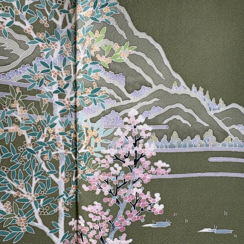 【付下げ】 緑系 鶯色 逸品 A 約150cm~約159cm 裄丈63cm-64cm (M)size 袖丈48cm 9990-29990 美品 五万以下