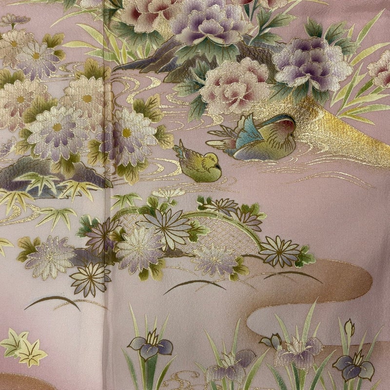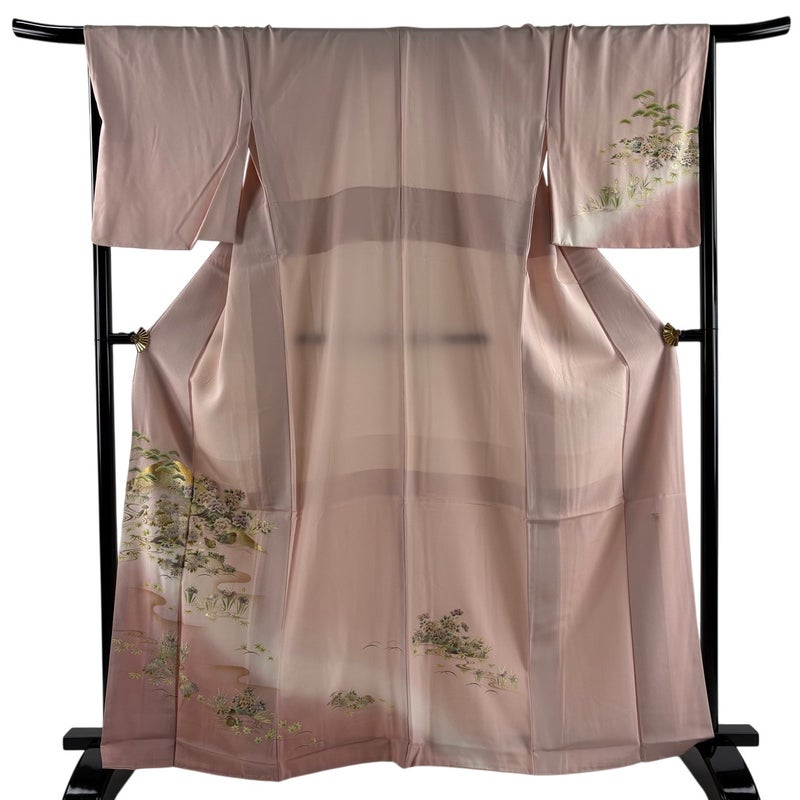 【着物ランク】秀品 【素材】正絹 【身丈】約163.5cm 【裄丈】約67cm 【袖丈】約45cm 【袖幅】約35cm 【前幅】約24cm 【後幅】約30cm 【サイズ】M 【着物仕立て】袷 【着用時期】10~5月 【状態ランク】ランクB 【着物着用シーン】披露宴、パーティー、式典、食事会、お茶会、正月