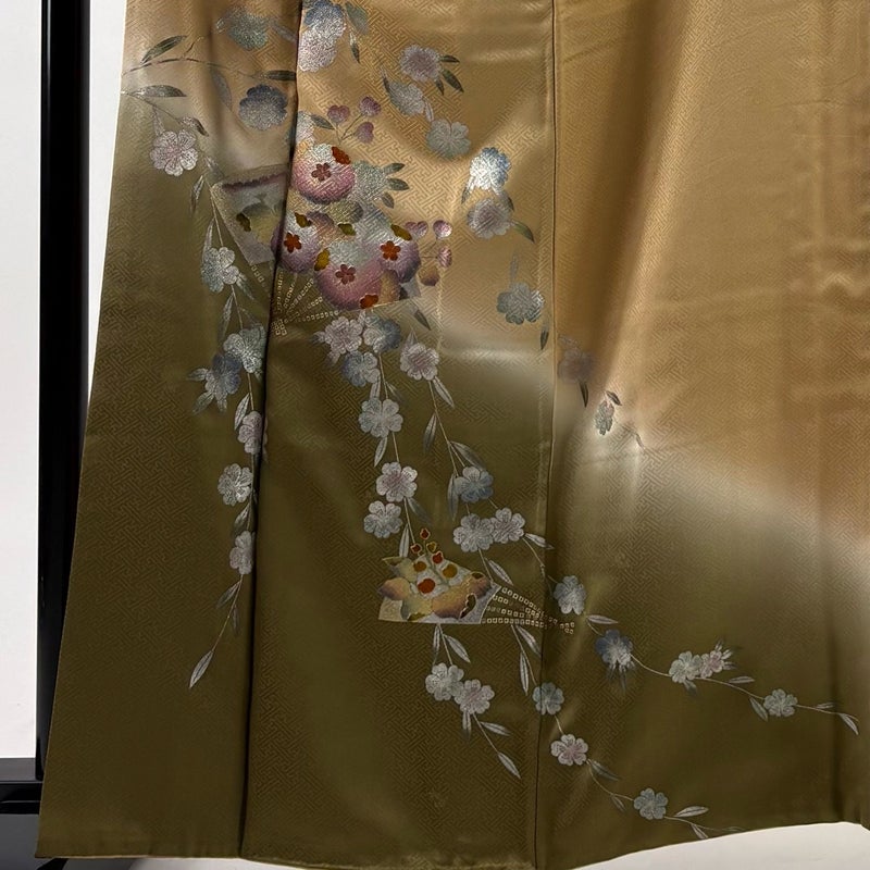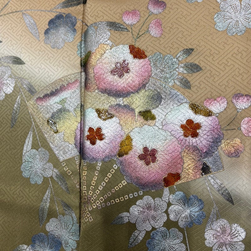 【着物ランク】秀品 【素材】正絹 【身丈】約163cm 【裄丈】約68cm 【袖丈】約49cm 【袖幅】約35cm 【前幅】約25cm 【後幅】約29.5cm 【サイズ】L 【着物仕立て】袷 【着用時期】10~5月 【状態ランク】ランクB 【着物着用シーン】披露宴、パーティー、式典、食事会、お茶会、正月
