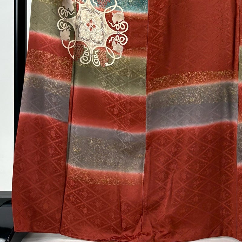 【着物ランク】秀品 【素材】正絹 【身丈】約169cm 【裄丈】約67.5cm 【袖丈】約64.5cm 【袖幅】約34.5cm 【前幅】約24.5cm 【後幅】約31cm 【サイズ】L 【着物仕立て】袷 【着用時期】10~5月 【状態ランク】ランクB 【着物着用シーン】披露宴、パーティー、式典、食事会、お茶会、正月