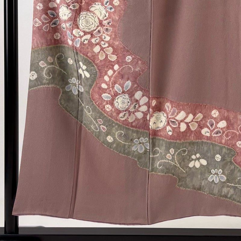 【着物ランク】秀品 【素材】正絹 【身丈】約151.5cm 【裄丈】約62cm 【袖丈】約44cm 【袖幅】約32cm 【前幅】約23cm 【後幅】約30.5cm 【サイズ】S 【着物仕立て】袷 【着用時期】10~5月 【状態ランク】ランクB 【着物着用シーン】披露宴、パーティー、式典、食事会、お茶会、正月