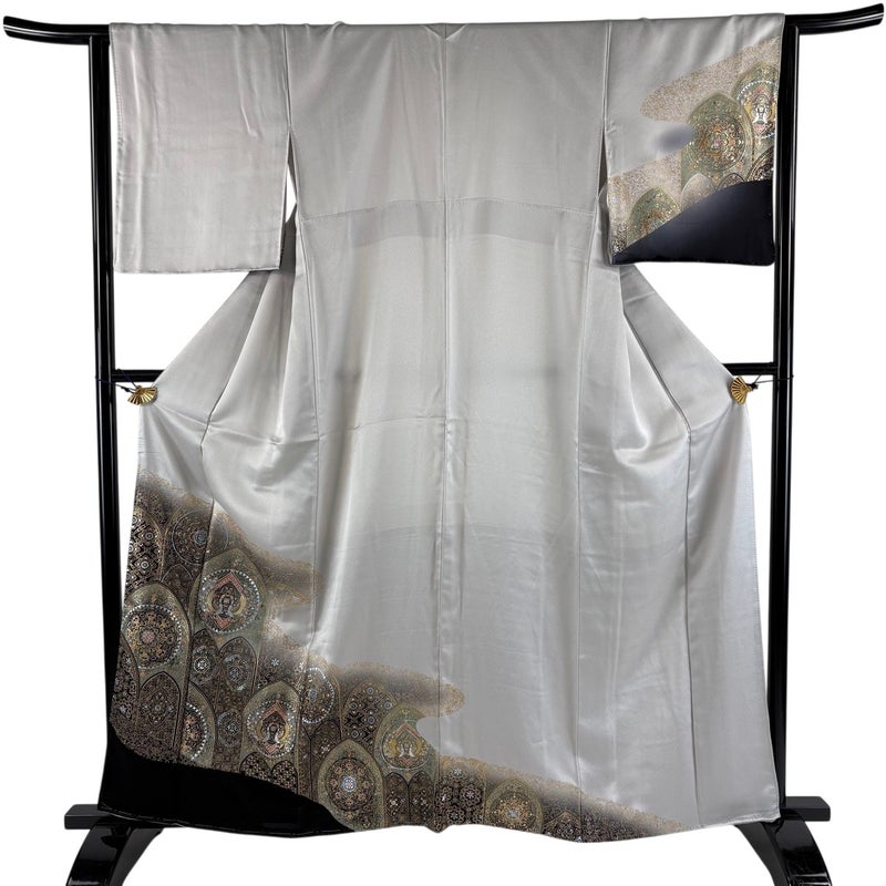 【着物ランク】秀品 【素材】正絹 【身丈】約159.5cm 【裄丈】約64.5cm 【袖丈】約48cm 【袖幅】約33cm 【前幅】約24cm 【後幅】約30.5cm 【サイズ】M 【着物仕立て】袷 【着用時期】10~5月 【状態ランク】ランクB 【着物着用シーン】披露宴、パーティー、式典、食事会、お茶会、正月