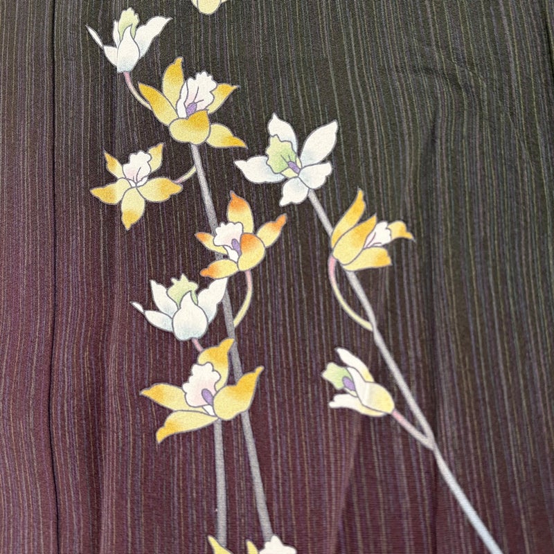 【着物ランク】秀品 【素材】正絹 【身丈】約160.5cm 【裄丈】約65cm 【袖丈】約49cm 【袖幅】約34cm 【前幅】約24cm 【後幅】約30cm 【サイズ】M 【着物仕立て】袷 【着用時期】10~5月 【状態ランク】ランクB 【着物着用シーン】披露宴、パーティー、式典、食事会、お茶会、正月
