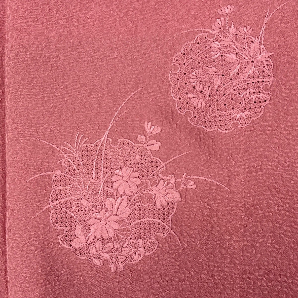 付け下げは訪問着を簡略化した訪問着より格が低くで小紋より格の高いの着物です。 特徴としては仕立て方の違いから訪問着などの一度真っさらな反物を着物の形に仮仕立てした後に柄付けをする絵羽模様とは違い、反物の状態で着用した時に柄付けが全て上を向くように書く事により左右の身頃や肩から袖にかけての模様が繋がっていない事です。 付け下げの歴史は他の着物に比べ浅く、戦時下に華美な訪問着が禁止された事で生まれた着物で、その後訪問着に比べ比較的安価で、それでいて着用シーンも訪問着とほぼ変わらないため大変好評になり、付け下げ訪問着と呼ばれる華やかな柄付けのものも考案された事により普及していきました。