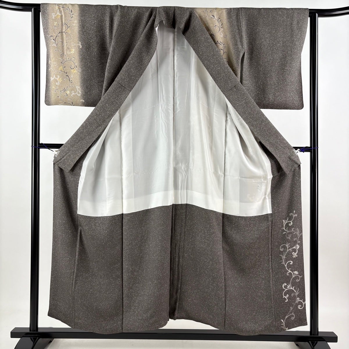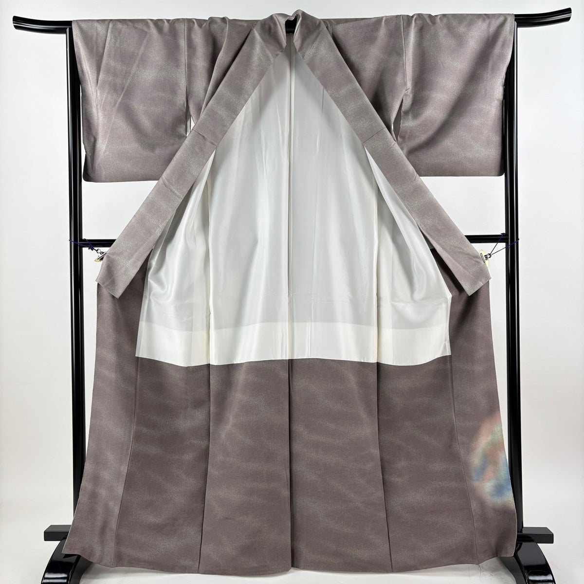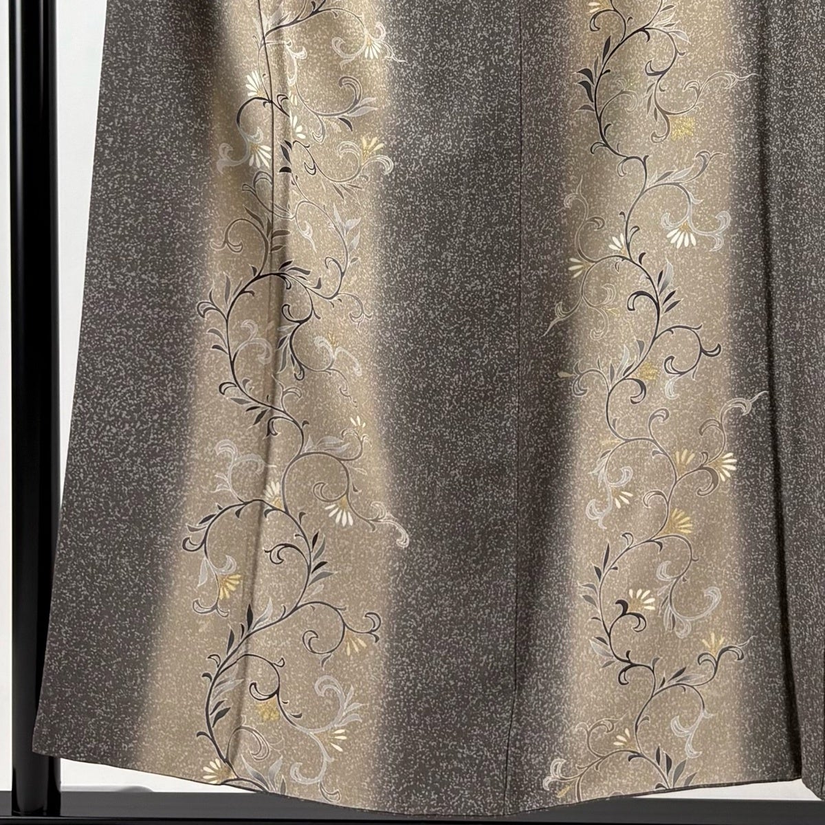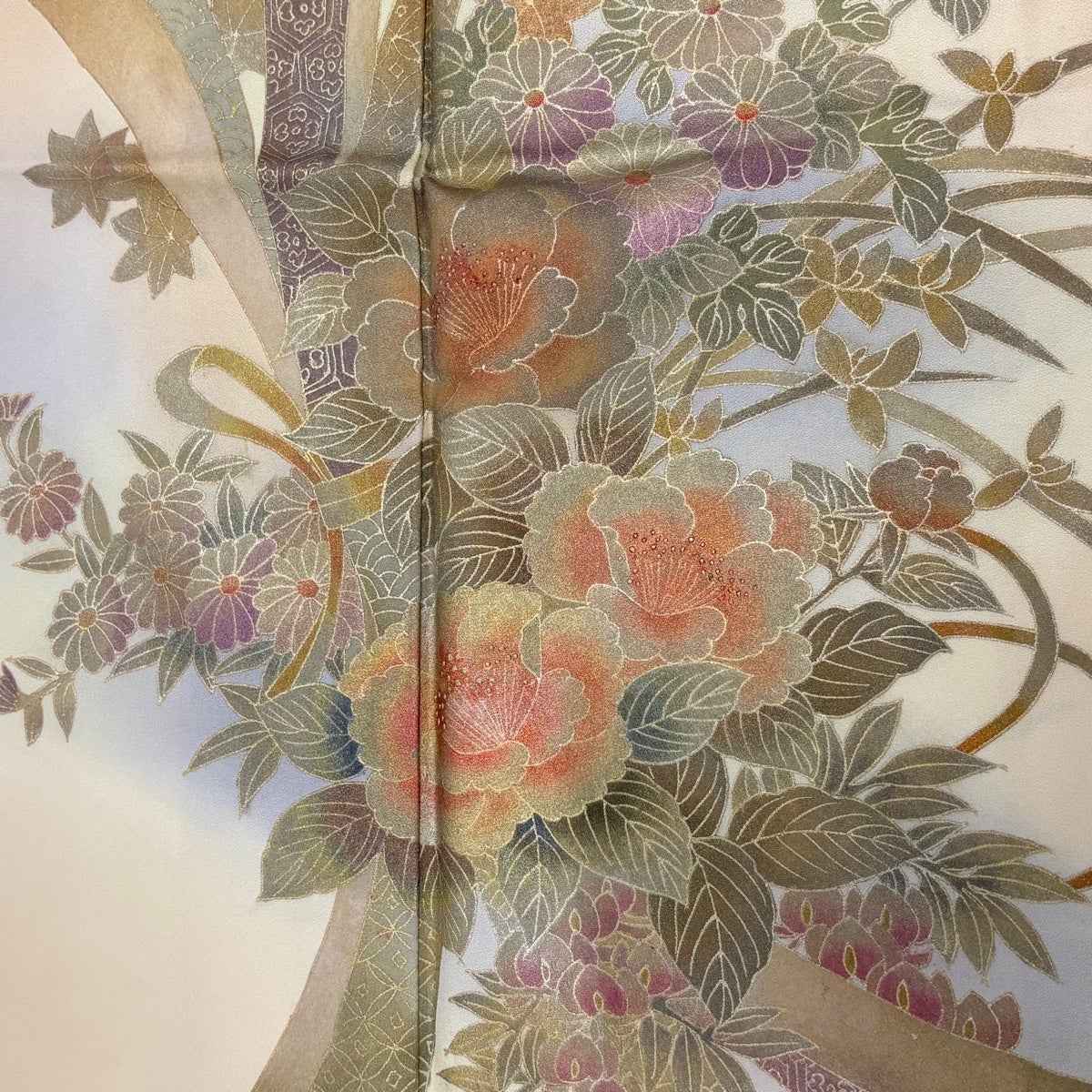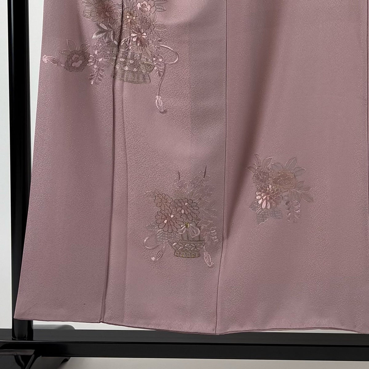 付け下げは訪問着を簡略化した訪問着より格が低くで小紋より格の高いの着物です。 特徴としては仕立て方の違いから訪問着などの一度真っさらな反物を着物の形に仮仕立てした後に柄付けをする絵羽模様とは違い、反物の状態で着用した時に柄付けが全て上を向くように書く事により左右の身頃や肩から袖にかけての模様が繋がっていない事です。 付け下げの歴史は他の着物に比べ浅く、戦時下に華美な訪問着が禁止された事で生まれた着物で、その後訪問着に比べ比較的安価で、それでいて着用シーンも訪問着とほぼ変わらないため大変好評になり、付け下げ訪問着と呼ばれる華やかな柄付けのものも考案された事により普及していきました。