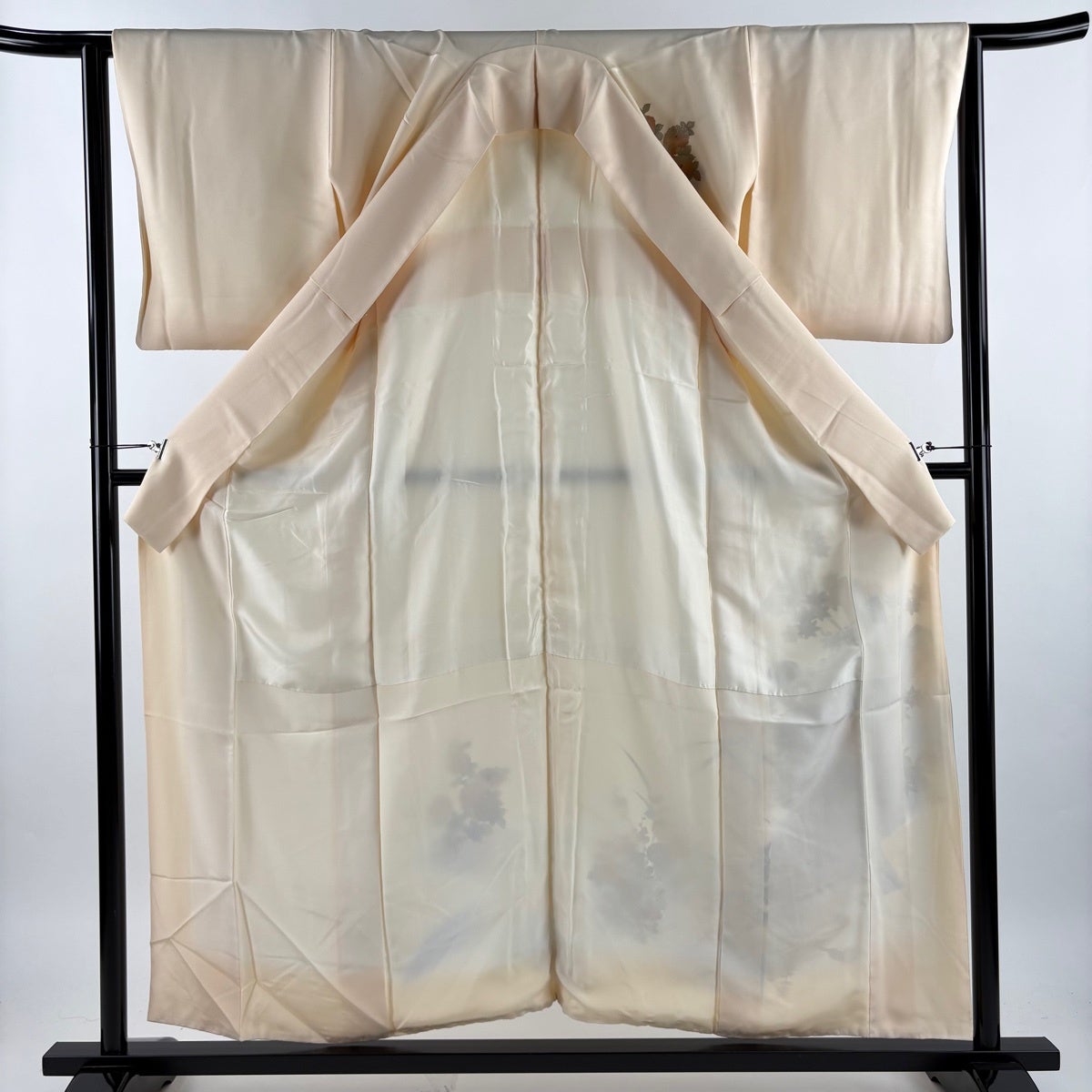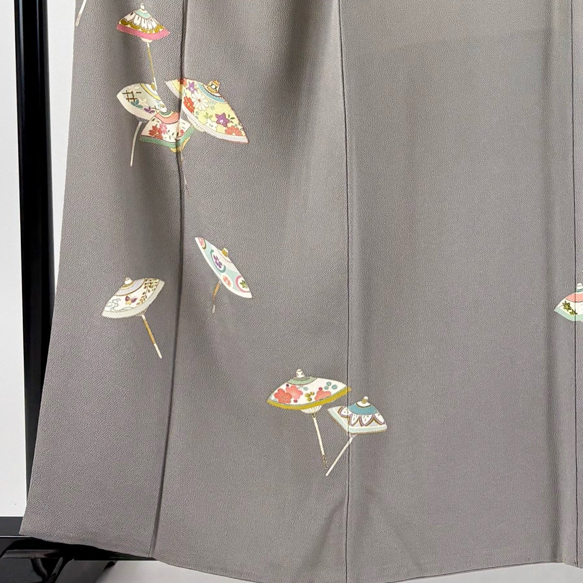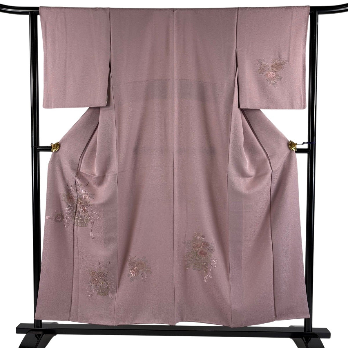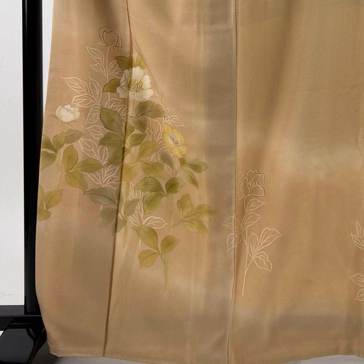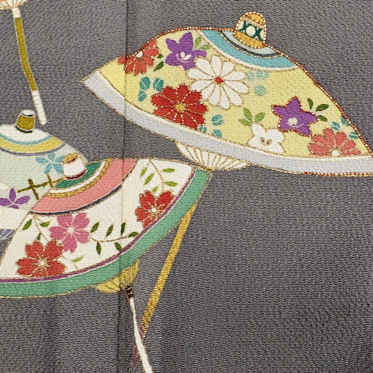 付け下げは訪問着を簡略化した訪問着より格が低くで小紋より格の高いの着物です。 特徴としては仕立て方の違いから訪問着などの一度真っさらな反物を着物の形に仮仕立てした後に柄付けをする絵羽模様とは違い、反物の状態で着用した時に柄付けが全て上を向くように書く事により左右の身頃や肩から袖にかけての模様が繋がっていない事です。 付け下げの歴史は他の着物に比べ浅く、戦時下に華美な訪問着が禁止された事で生まれた着物で、その後訪問着に比べ比較的安価で、それでいて着用シーンも訪問着とほぼ変わらないため大変好評になり、付け下げ訪問着と呼ばれる華やかな柄付けのものも考案された事により普及していきました。