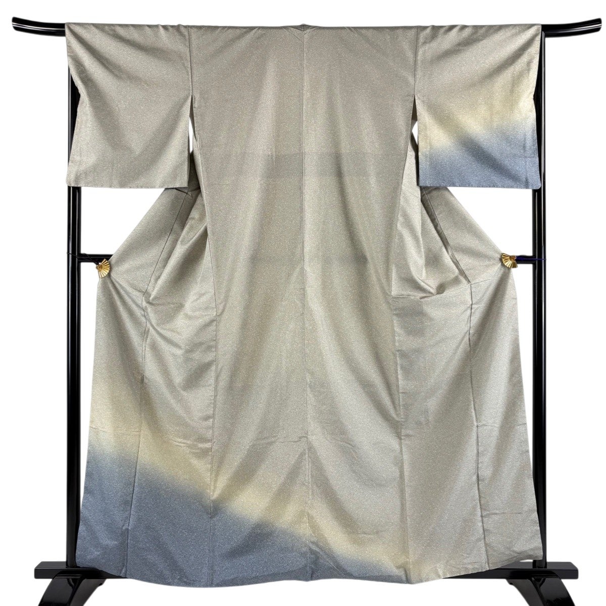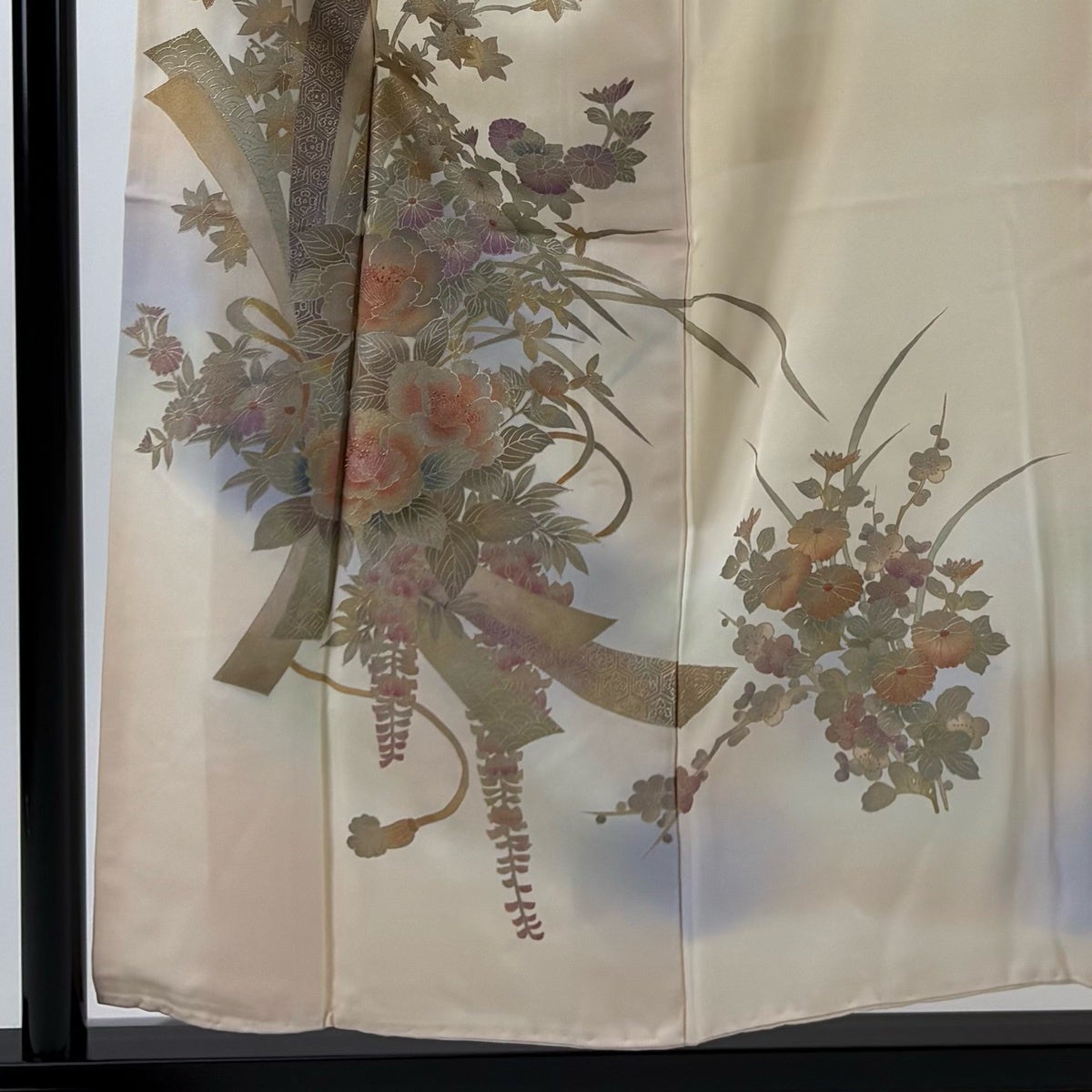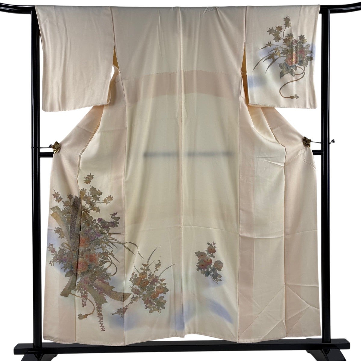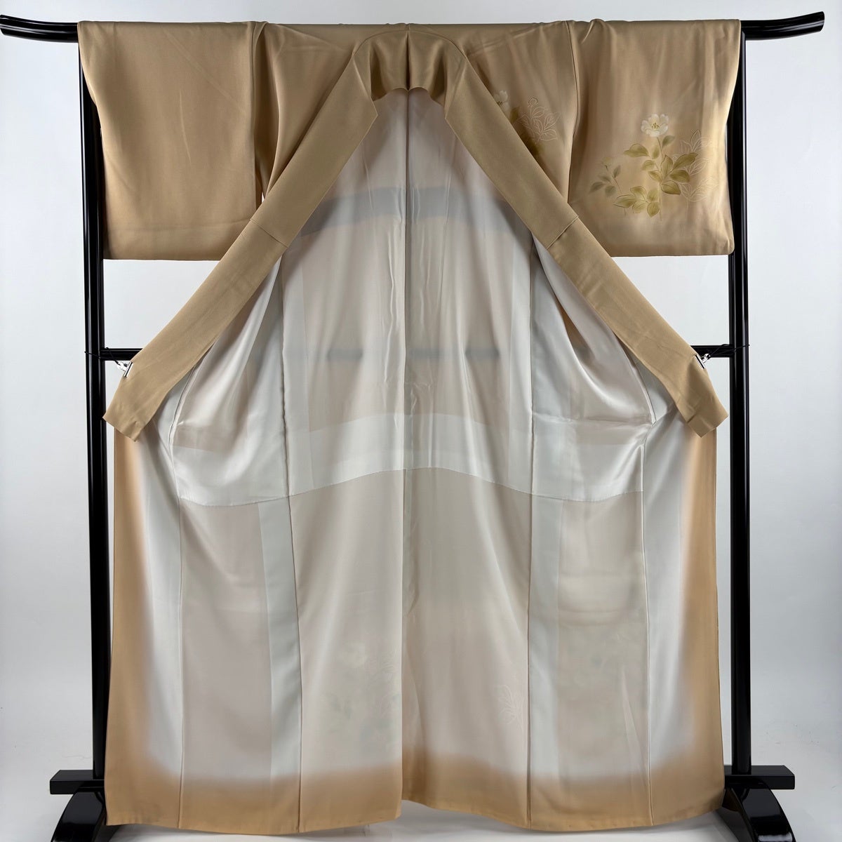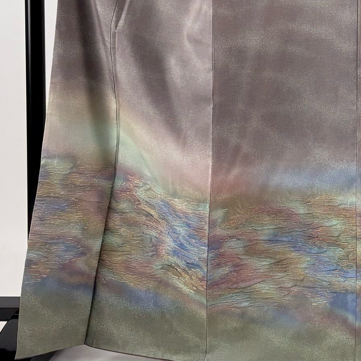 付け下げは訪問着を簡略化した訪問着より格が低くで小紋より格の高いの着物です。 特徴としては仕立て方の違いから訪問着などの一度真っさらな反物を着物の形に仮仕立てした後に柄付けをする絵羽模様とは違い、反物の状態で着用した時に柄付けが全て上を向くように書く事により左右の身頃や肩から袖にかけての模様が繋がっていない事です。 付け下げの歴史は他の着物に比べ浅く、戦時下に華美な訪問着が禁止された事で生まれた着物で、その後訪問着に比べ比較的安価で、それでいて着用シーンも訪問着とほぼ変わらないため大変好評になり、付け下げ訪問着と呼ばれる華やかな柄付けのものも考案された事により普及していきました。