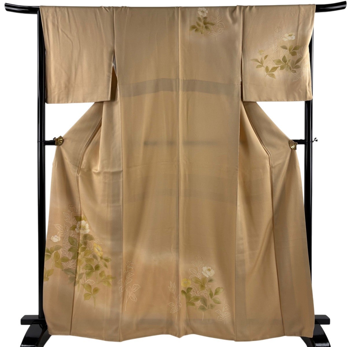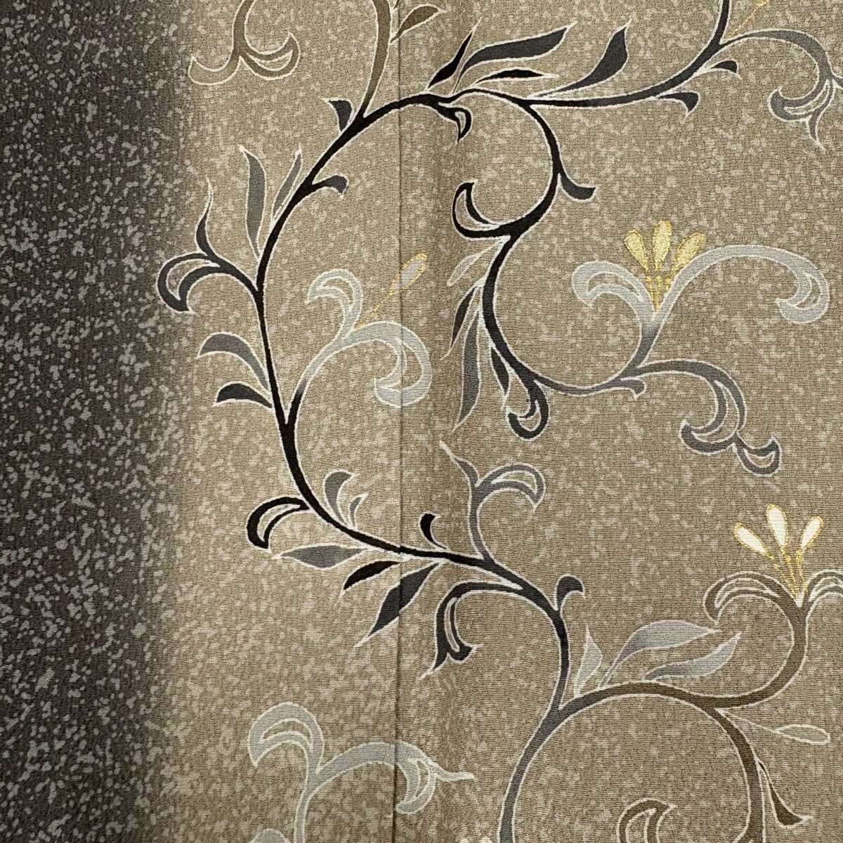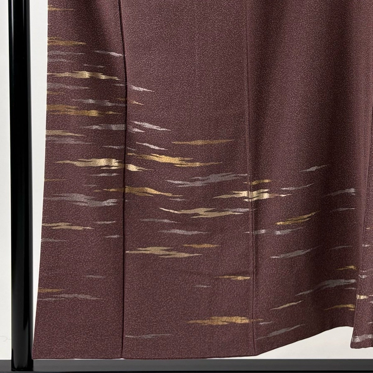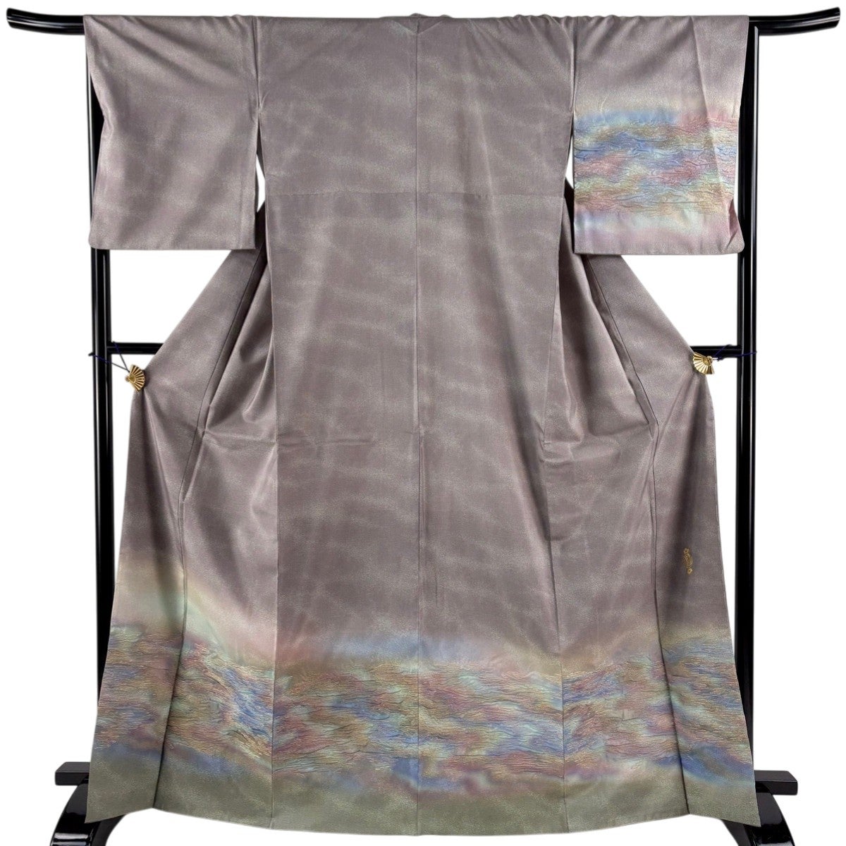 付け下げは訪問着を簡略化した訪問着より格が低くで小紋より格の高いの着物です。 特徴としては仕立て方の違いから訪問着などの一度真っさらな反物を着物の形に仮仕立てした後に柄付けをする絵羽模様とは違い、反物の状態で着用した時に柄付けが全て上を向くように書く事により左右の身頃や肩から袖にかけての模様が繋がっていない事です。 付け下げの歴史は他の着物に比べ浅く、戦時下に華美な訪問着が禁止された事で生まれた着物で、その後訪問着に比べ比較的安価で、それでいて着用シーンも訪問着とほぼ変わらないため大変好評になり、付け下げ訪問着と呼ばれる華やかな柄付けのものも考案された事により普及していきました。