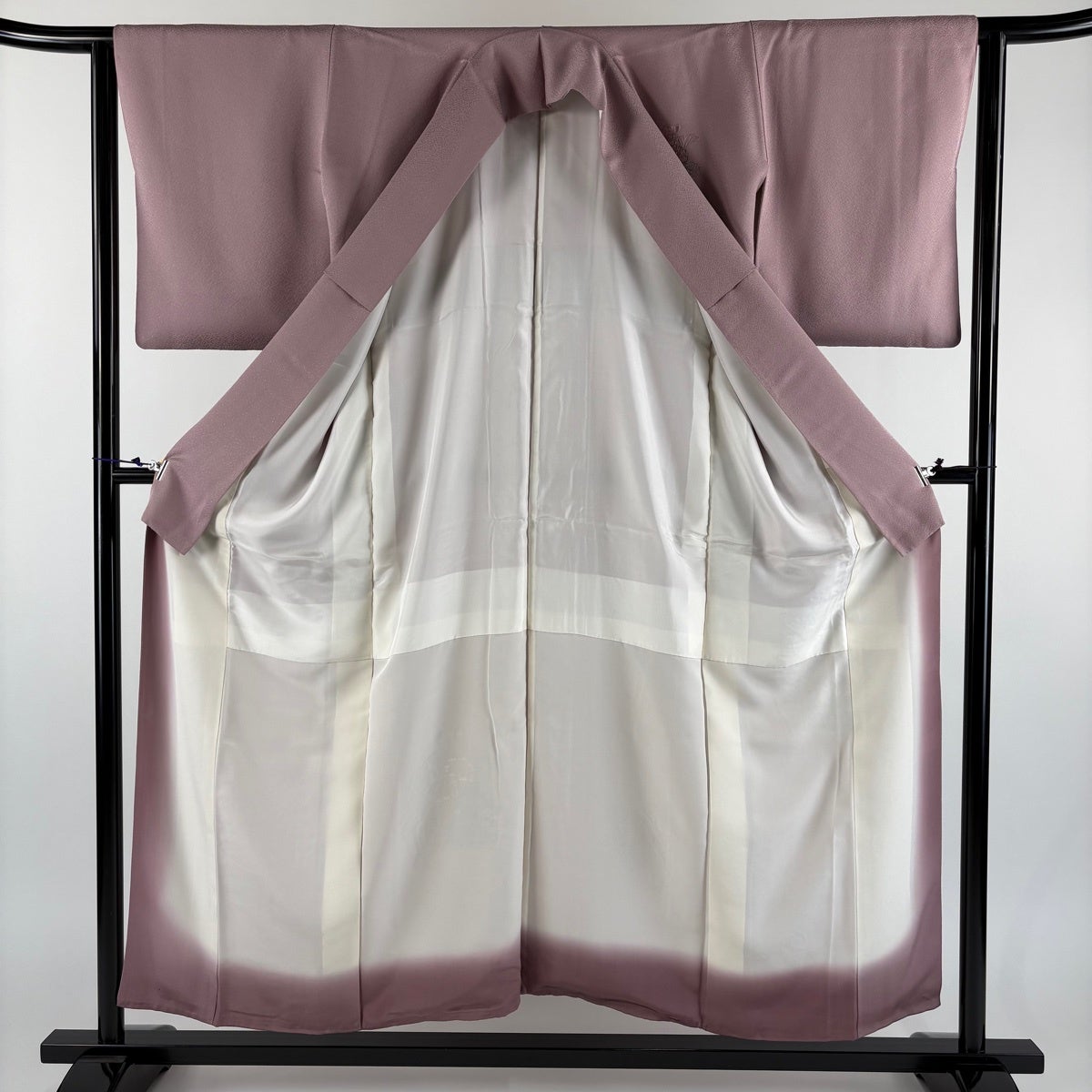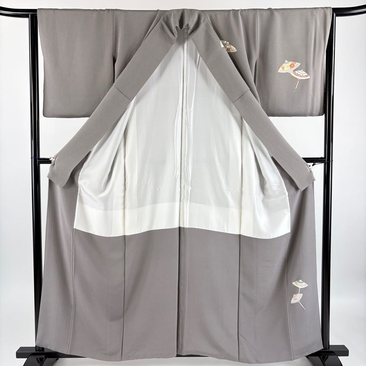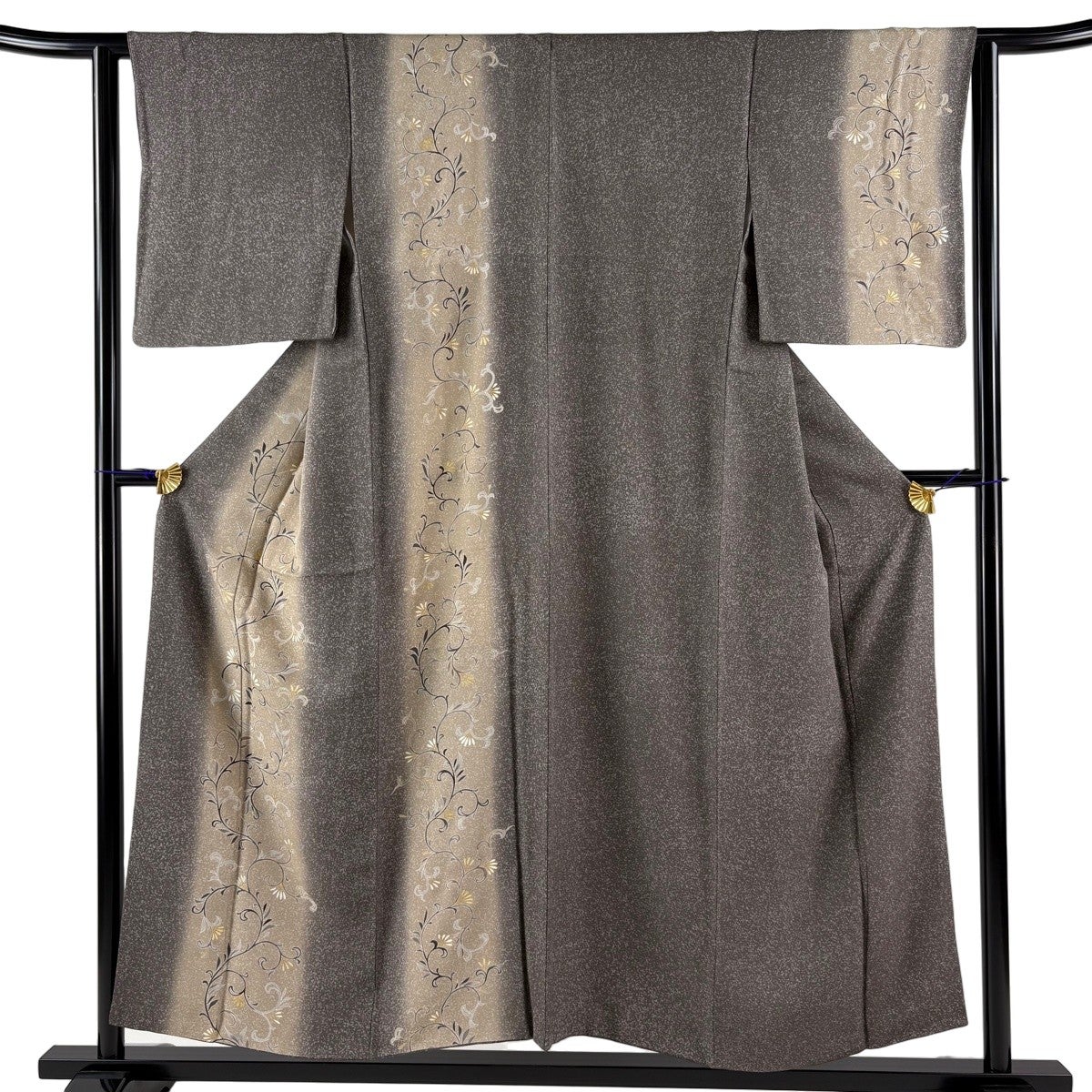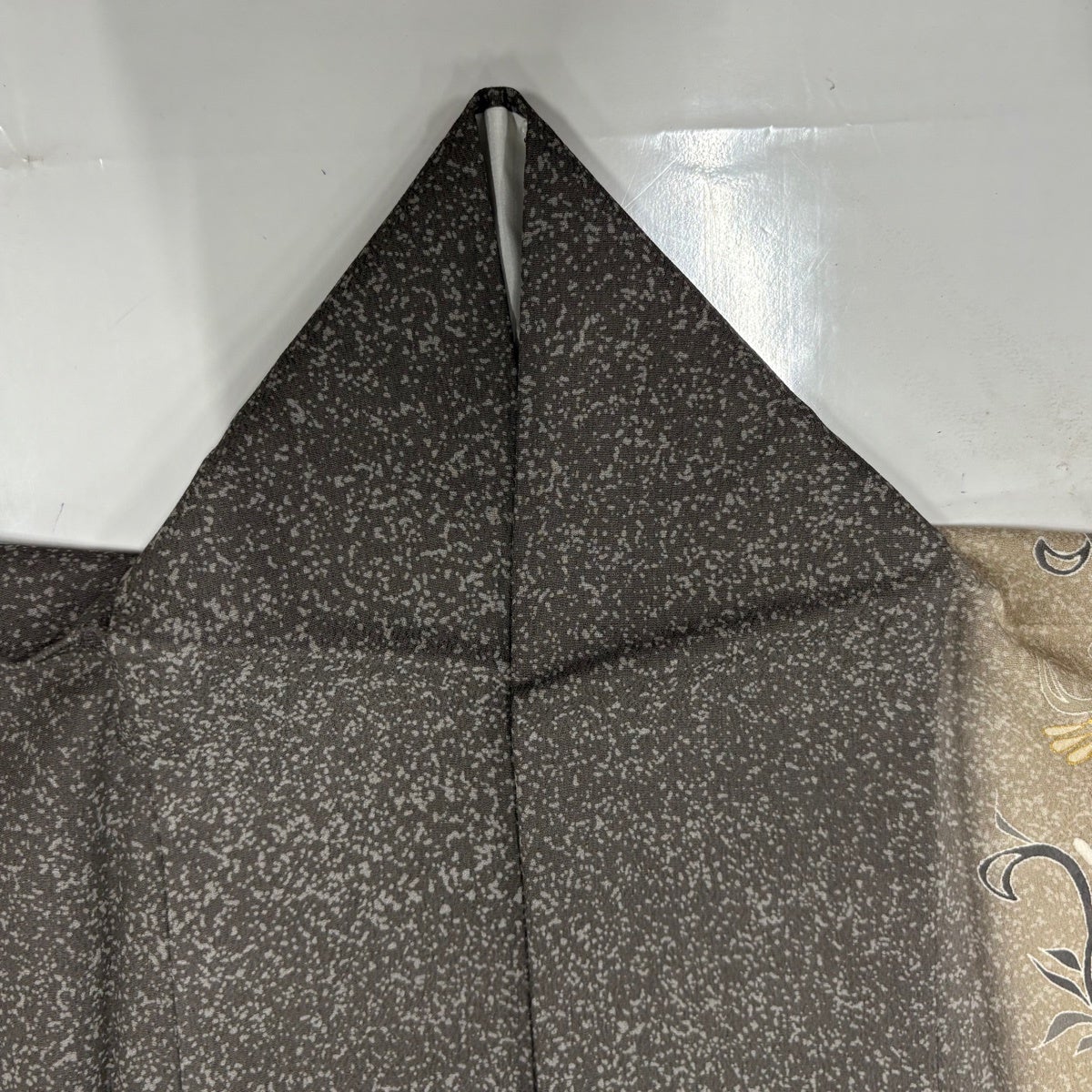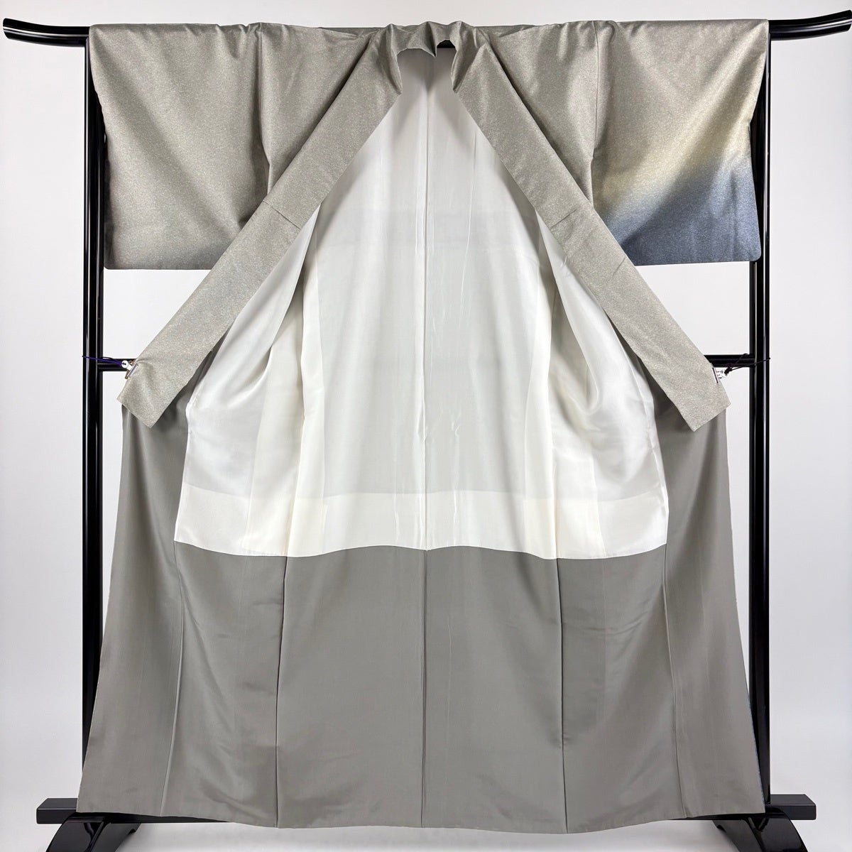 付け下げは訪問着を簡略化した訪問着より格が低くで小紋より格の高いの着物です。 特徴としては仕立て方の違いから訪問着などの一度真っさらな反物を着物の形に仮仕立てした後に柄付けをする絵羽模様とは違い、反物の状態で着用した時に柄付けが全て上を向くように書く事により左右の身頃や肩から袖にかけての模様が繋がっていない事です。 付け下げの歴史は他の着物に比べ浅く、戦時下に華美な訪問着が禁止された事で生まれた着物で、その後訪問着に比べ比較的安価で、それでいて着用シーンも訪問着とほぼ変わらないため大変好評になり、付け下げ訪問着と呼ばれる華やかな柄付けのものも考案された事により普及していきました。