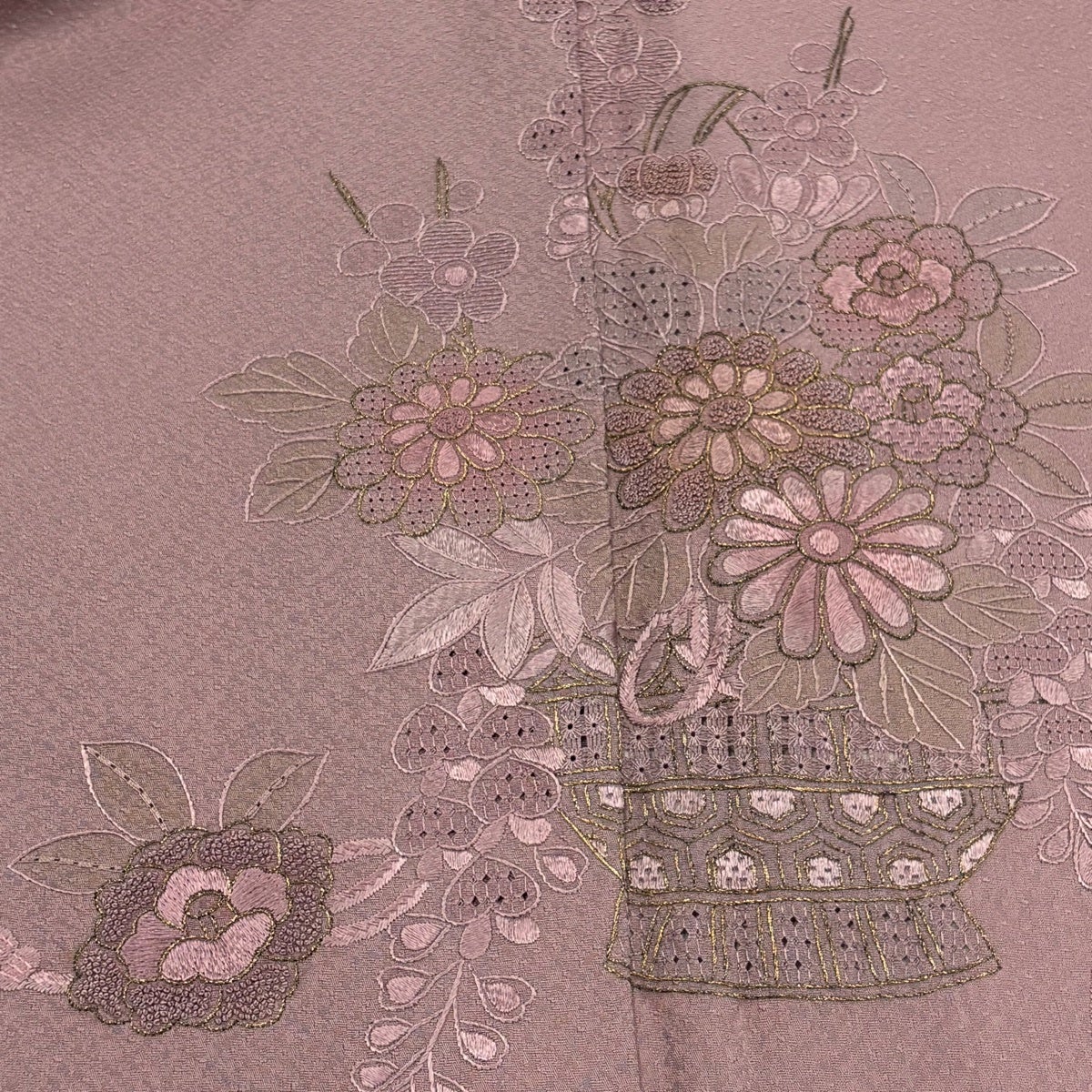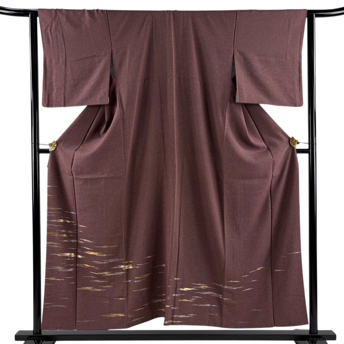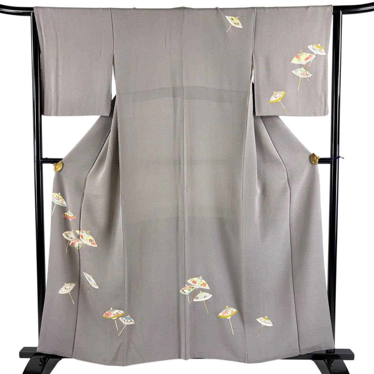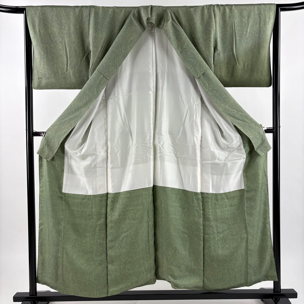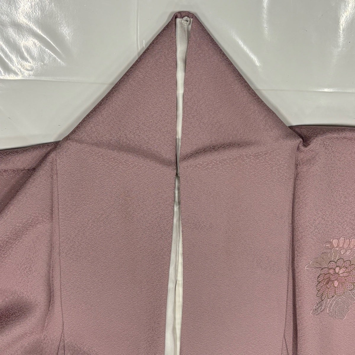 付け下げは訪問着を簡略化した訪問着より格が低くで小紋より格の高いの着物です。 特徴としては仕立て方の違いから訪問着などの一度真っさらな反物を着物の形に仮仕立てした後に柄付けをする絵羽模様とは違い、反物の状態で着用した時に柄付けが全て上を向くように書く事により左右の身頃や肩から袖にかけての模様が繋がっていない事です。 付け下げの歴史は他の着物に比べ浅く、戦時下に華美な訪問着が禁止された事で生まれた着物で、その後訪問着に比べ比較的安価で、それでいて着用シーンも訪問着とほぼ変わらないため大変好評になり、付け下げ訪問着と呼ばれる華やかな柄付けのものも考案された事により普及していきました。