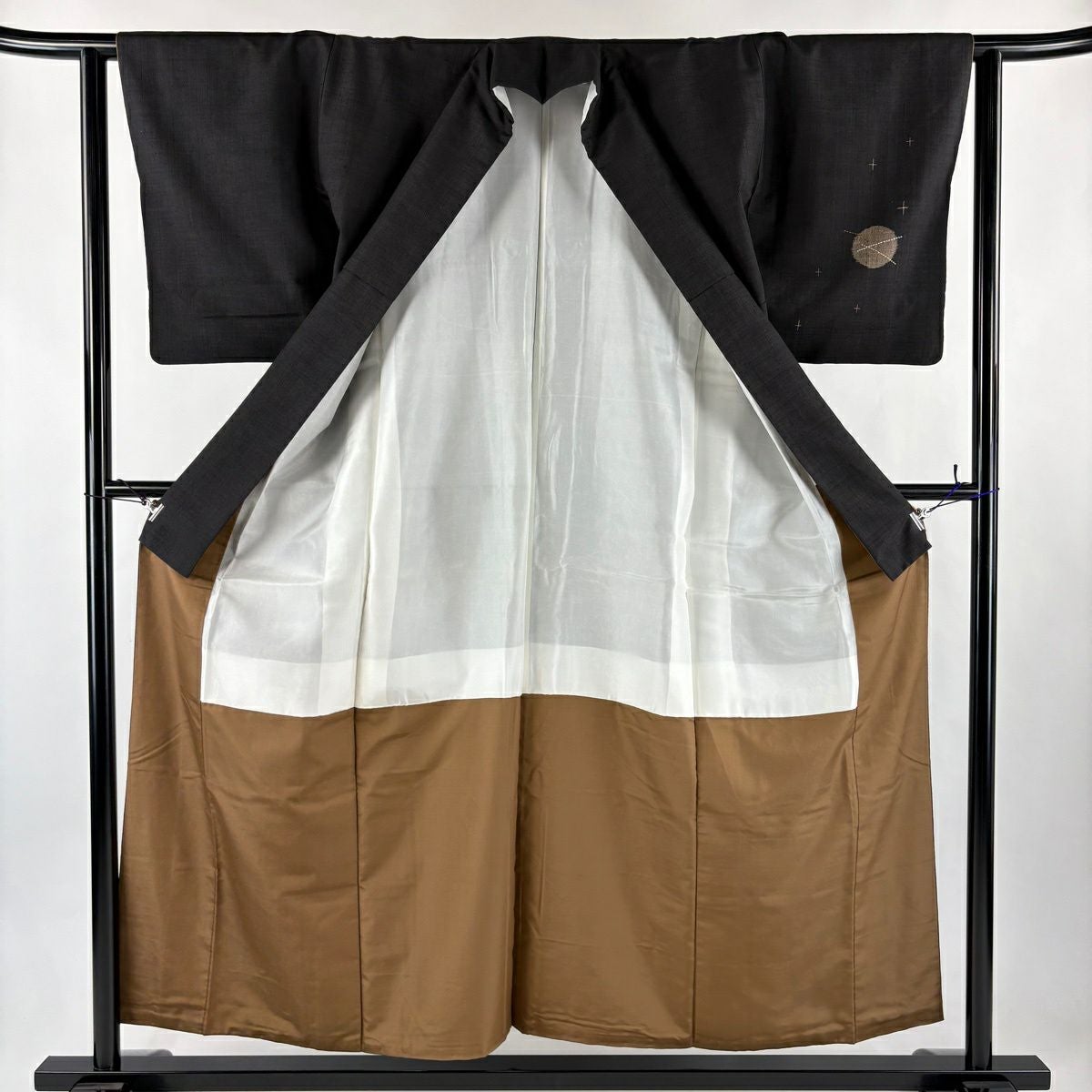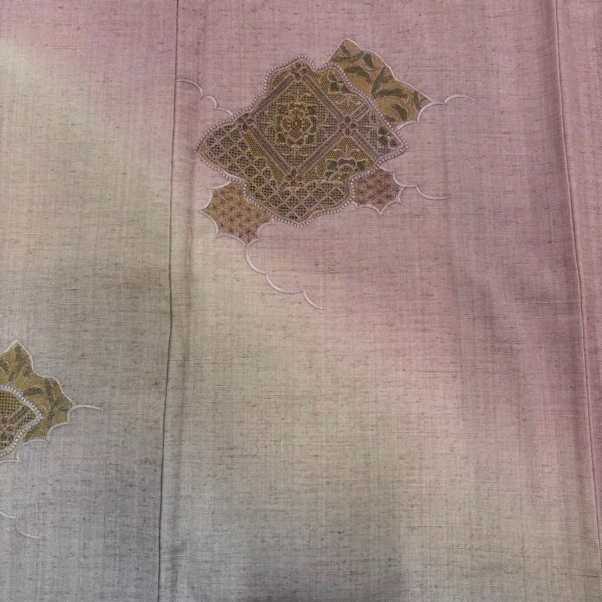 付け下げは訪問着を簡略化した訪問着より格が低くで小紋より格の高いの着物です。 特徴としては仕立て方の違いから訪問着などの一度真っさらな反物を着物の形に仮仕立てした後に柄付けをする絵羽模様とは違い、反物の状態で着用した時に柄付けが全て上を向くように書く事により左右の身頃や肩から袖にかけての模様が繋がっていない事です。 付け下げの歴史は他の着物に比べ浅く、戦時下に華美な訪問着が禁止された事で生まれた着物で、その後訪問着に比べ比較的安価で、それでいて着用シーンも訪問着とほぼ変わらないため大変好評になり、付け下げ訪問着と呼ばれる華やかな柄付けのものも考案された事により普及していきました。