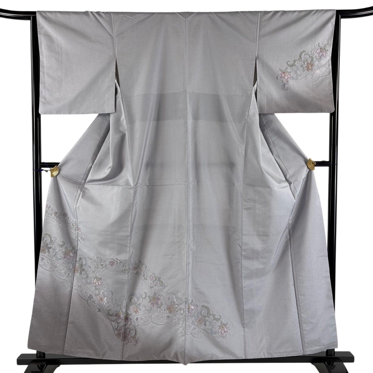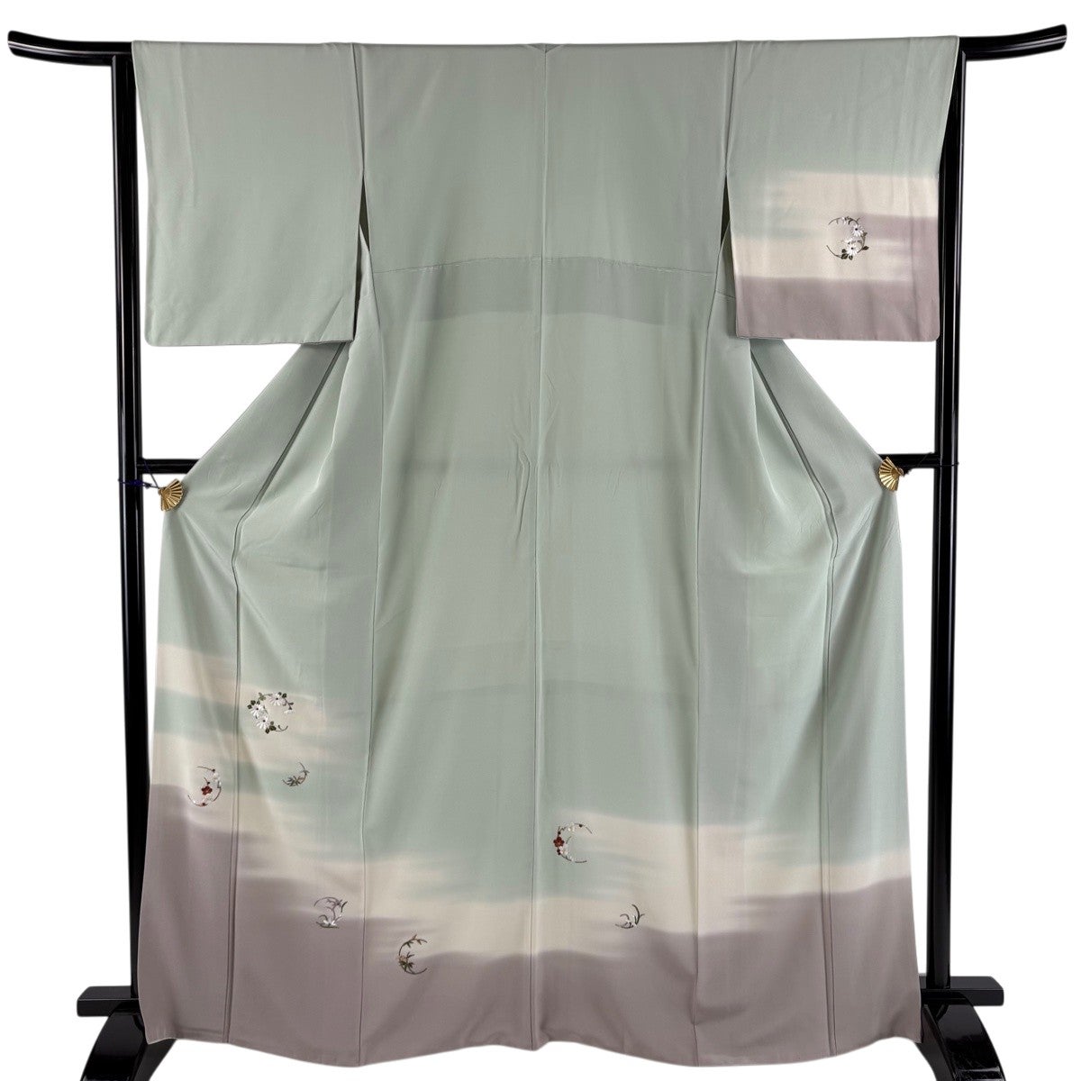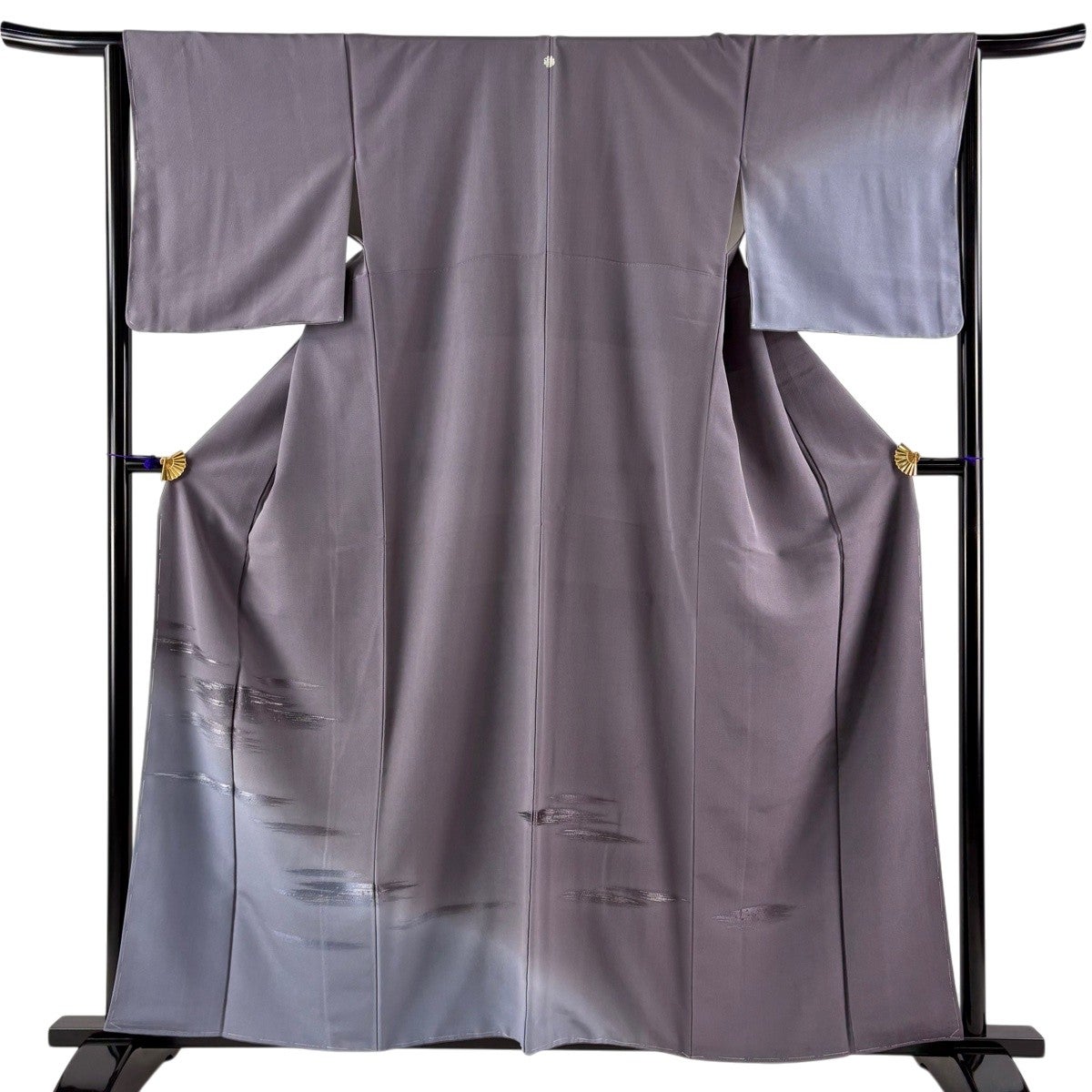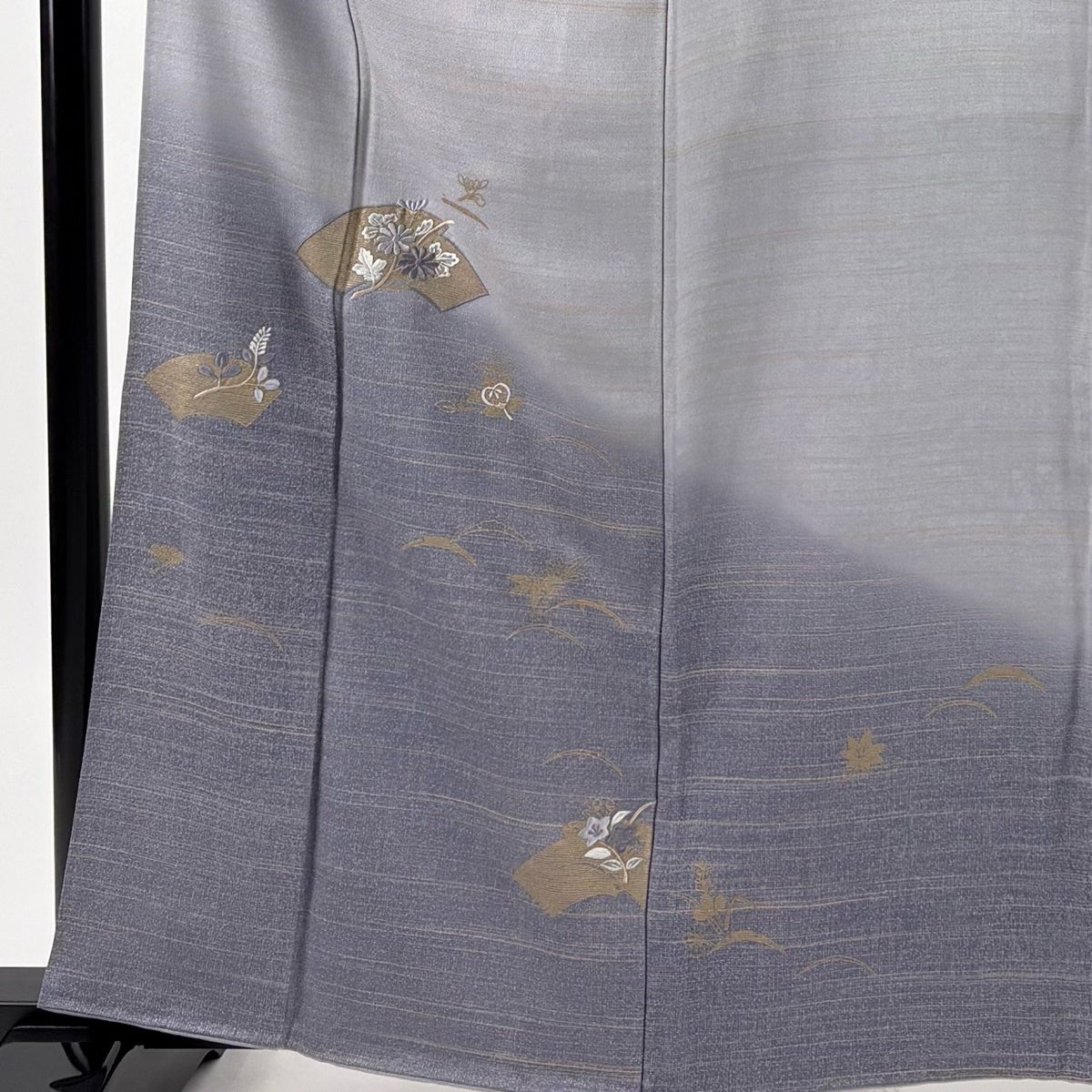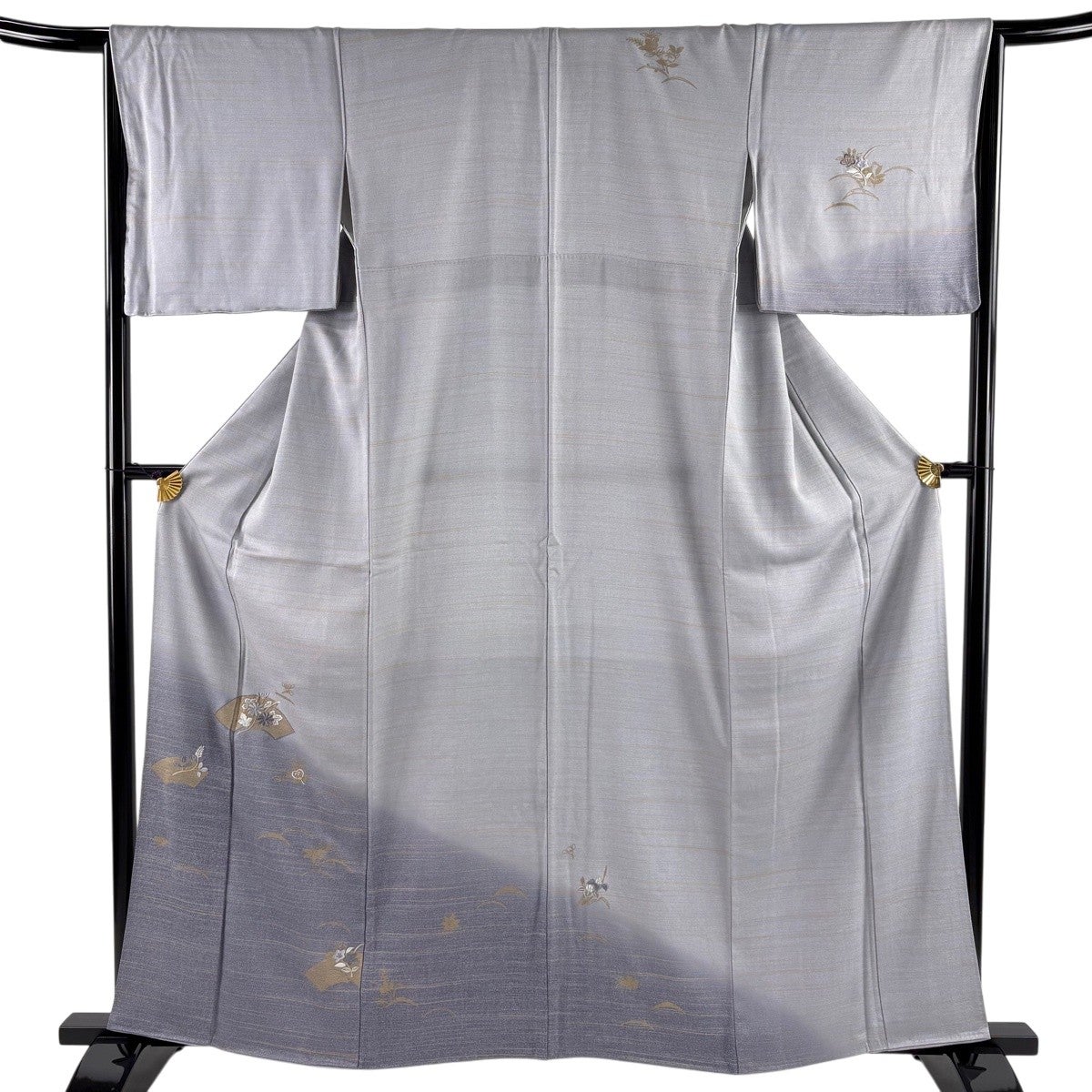 付け下げは訪問着を簡略化した訪問着より格が低くで小紋より格の高いの着物です。 特徴としては仕立て方の違いから訪問着などの一度真っさらな反物を着物の形に仮仕立てした後に柄付けをする絵羽模様とは違い、反物の状態で着用した時に柄付けが全て上を向くように書く事により左右の身頃や肩から袖にかけての模様が繋がっていない事です。 付け下げの歴史は他の着物に比べ浅く、戦時下に華美な訪問着が禁止された事で生まれた着物で、その後訪問着に比べ比較的安価で、それでいて着用シーンも訪問着とほぼ変わらないため大変好評になり、付け下げ訪問着と呼ばれる華やかな柄付けのものも考案された事により普及していきました。