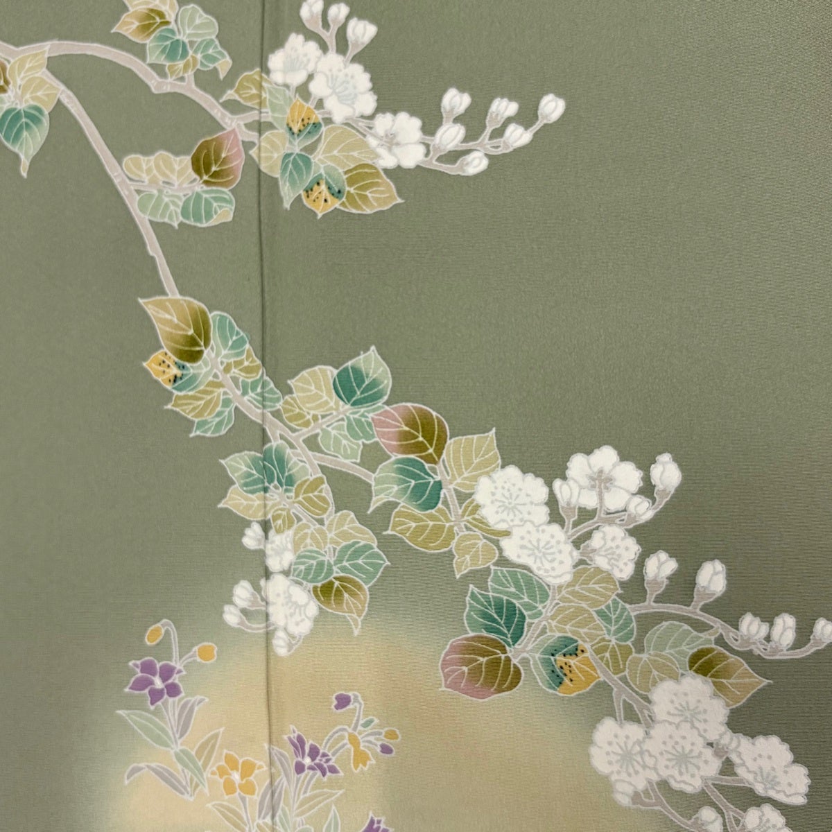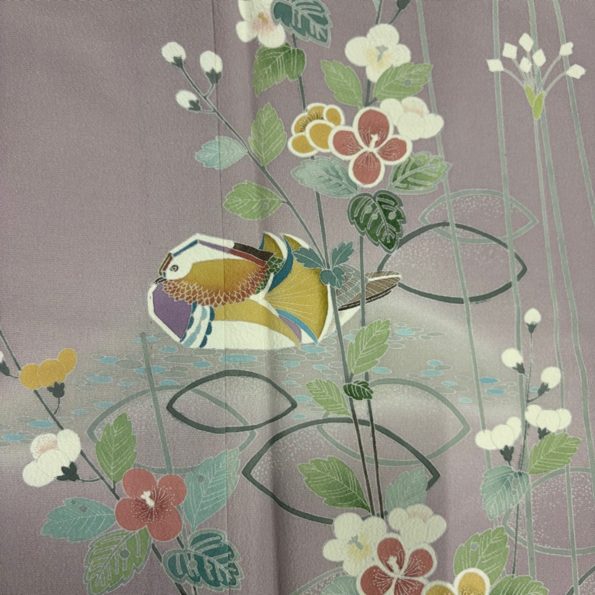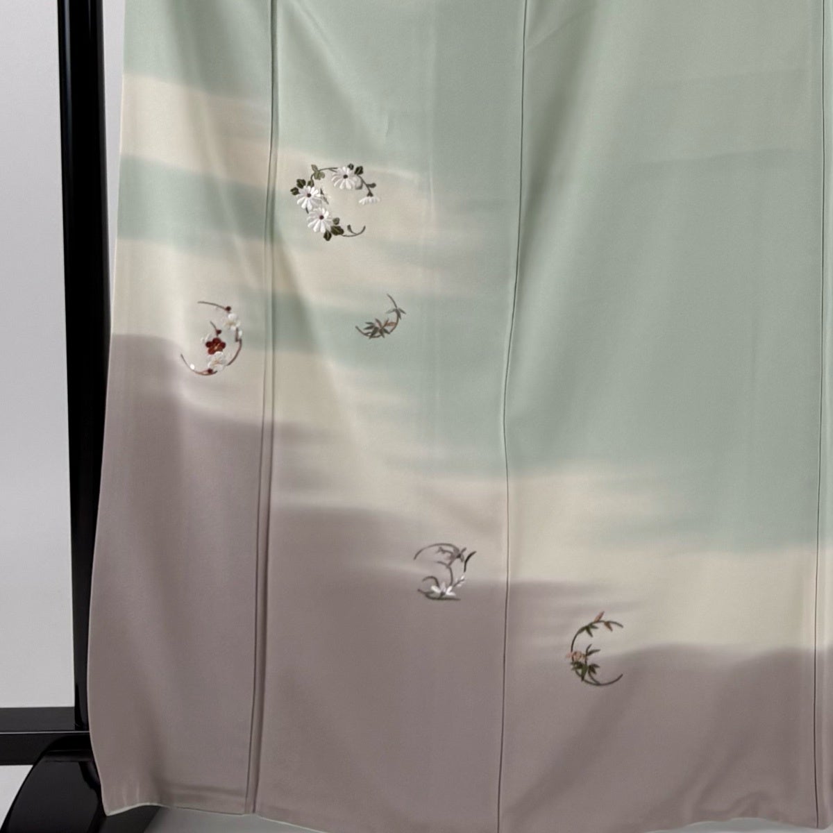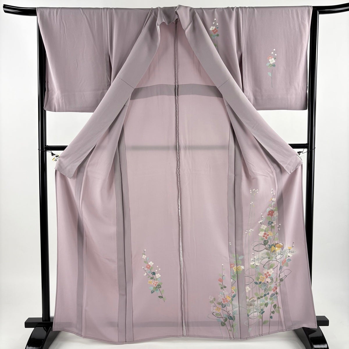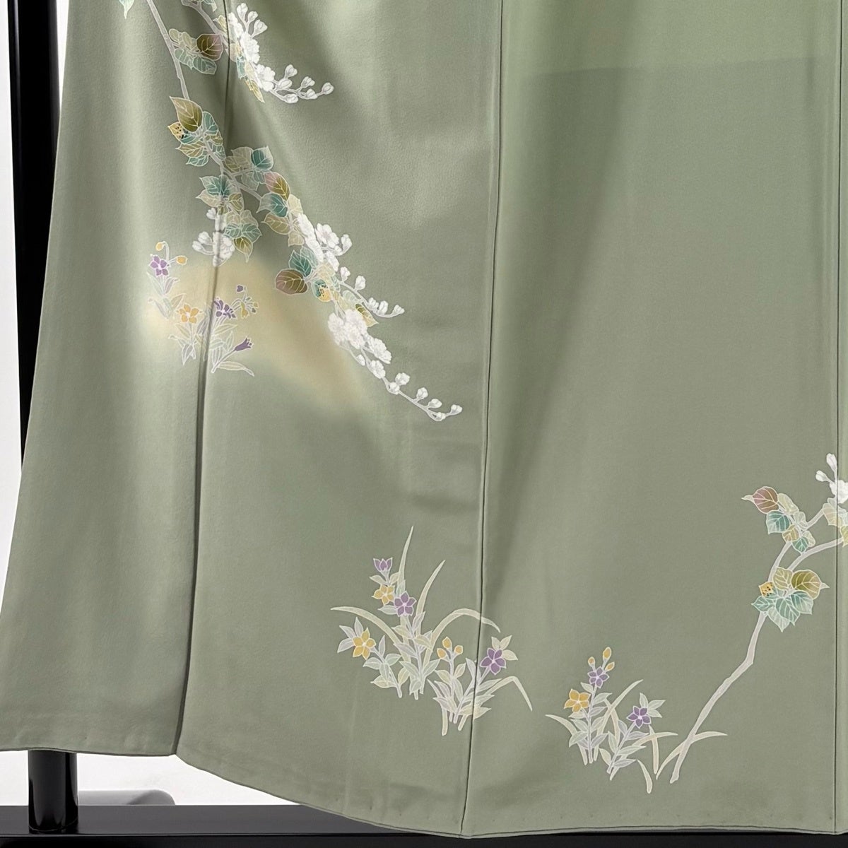 付け下げは訪問着を簡略化した訪問着より格が低くで小紋より格の高いの着物です。 特徴としては仕立て方の違いから訪問着などの一度真っさらな反物を着物の形に仮仕立てした後に柄付けをする絵羽模様とは違い、反物の状態で着用した時に柄付けが全て上を向くように書く事により左右の身頃や肩から袖にかけての模様が繋がっていない事です。 付け下げの歴史は他の着物に比べ浅く、戦時下に華美な訪問着が禁止された事で生まれた着物で、その後訪問着に比べ比較的安価で、それでいて着用シーンも訪問着とほぼ変わらないため大変好評になり、付け下げ訪問着と呼ばれる華やかな柄付けのものも考案された事により普及していきました。