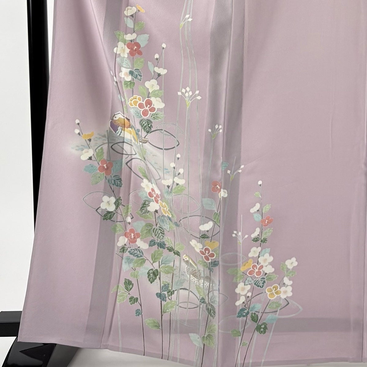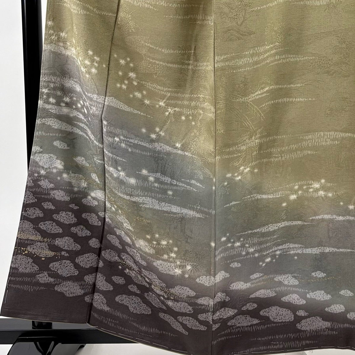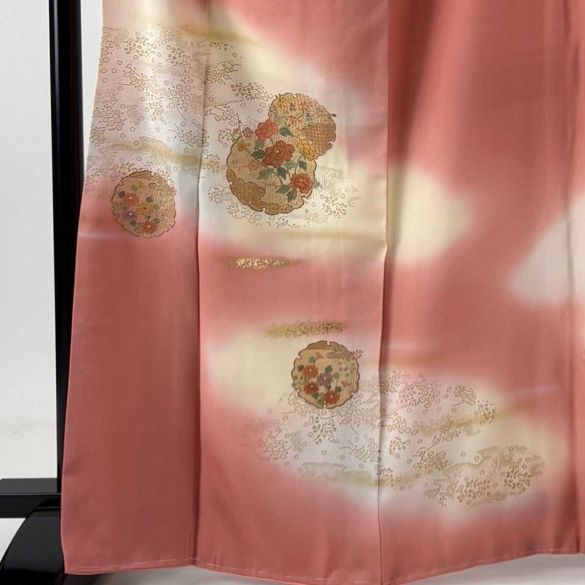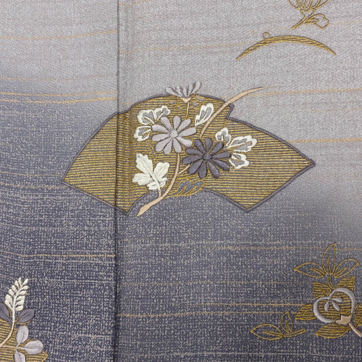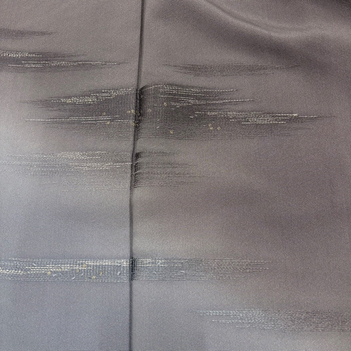 付け下げは訪問着を簡略化した訪問着より格が低くで小紋より格の高いの着物です。 特徴としては仕立て方の違いから訪問着などの一度真っさらな反物を着物の形に仮仕立てした後に柄付けをする絵羽模様とは違い、反物の状態で着用した時に柄付けが全て上を向くように書く事により左右の身頃や肩から袖にかけての模様が繋がっていない事です。 付け下げの歴史は他の着物に比べ浅く、戦時下に華美な訪問着が禁止された事で生まれた着物で、その後訪問着に比べ比較的安価で、それでいて着用シーンも訪問着とほぼ変わらないため大変好評になり、付け下げ訪問着と呼ばれる華やかな柄付けのものも考案された事により普及していきました。
