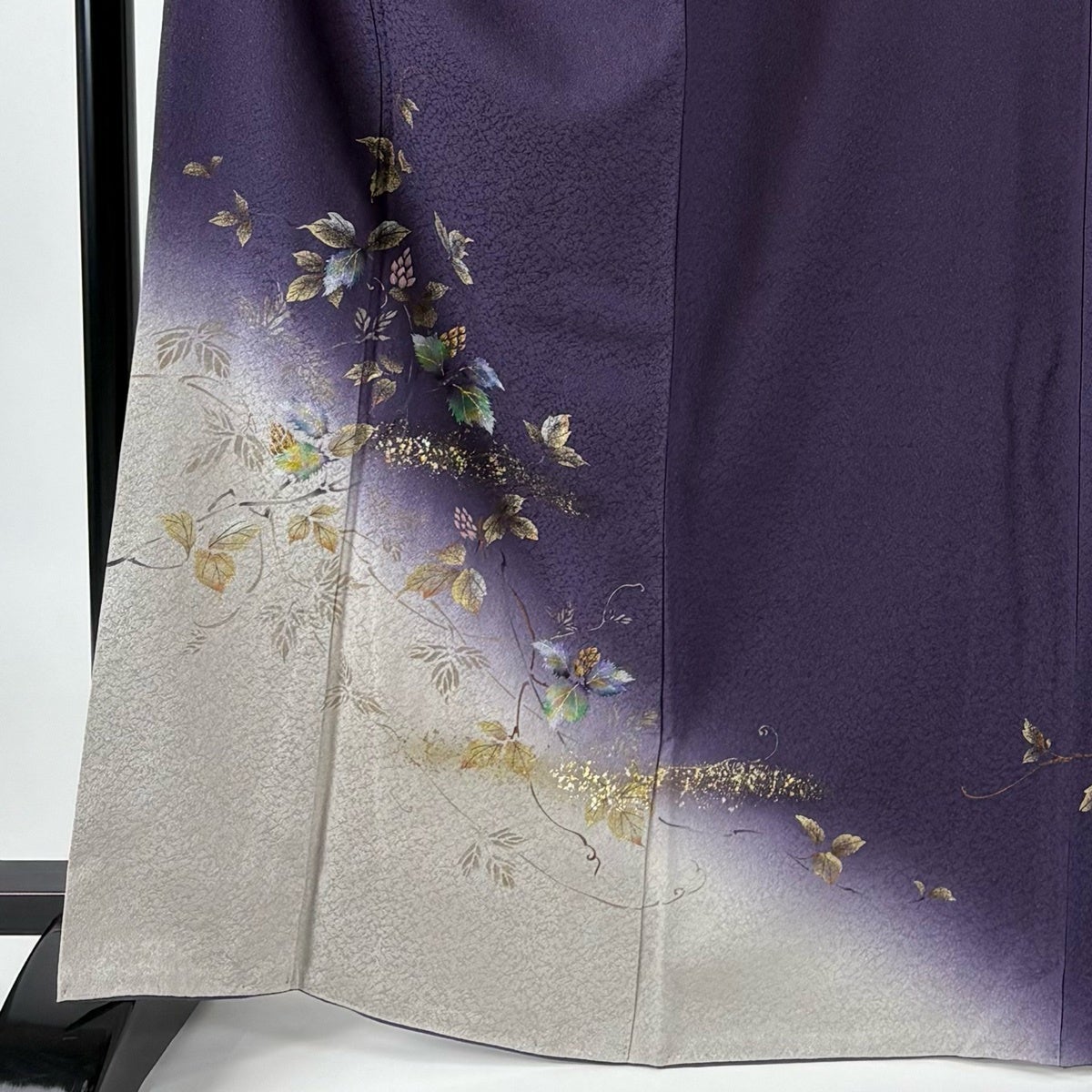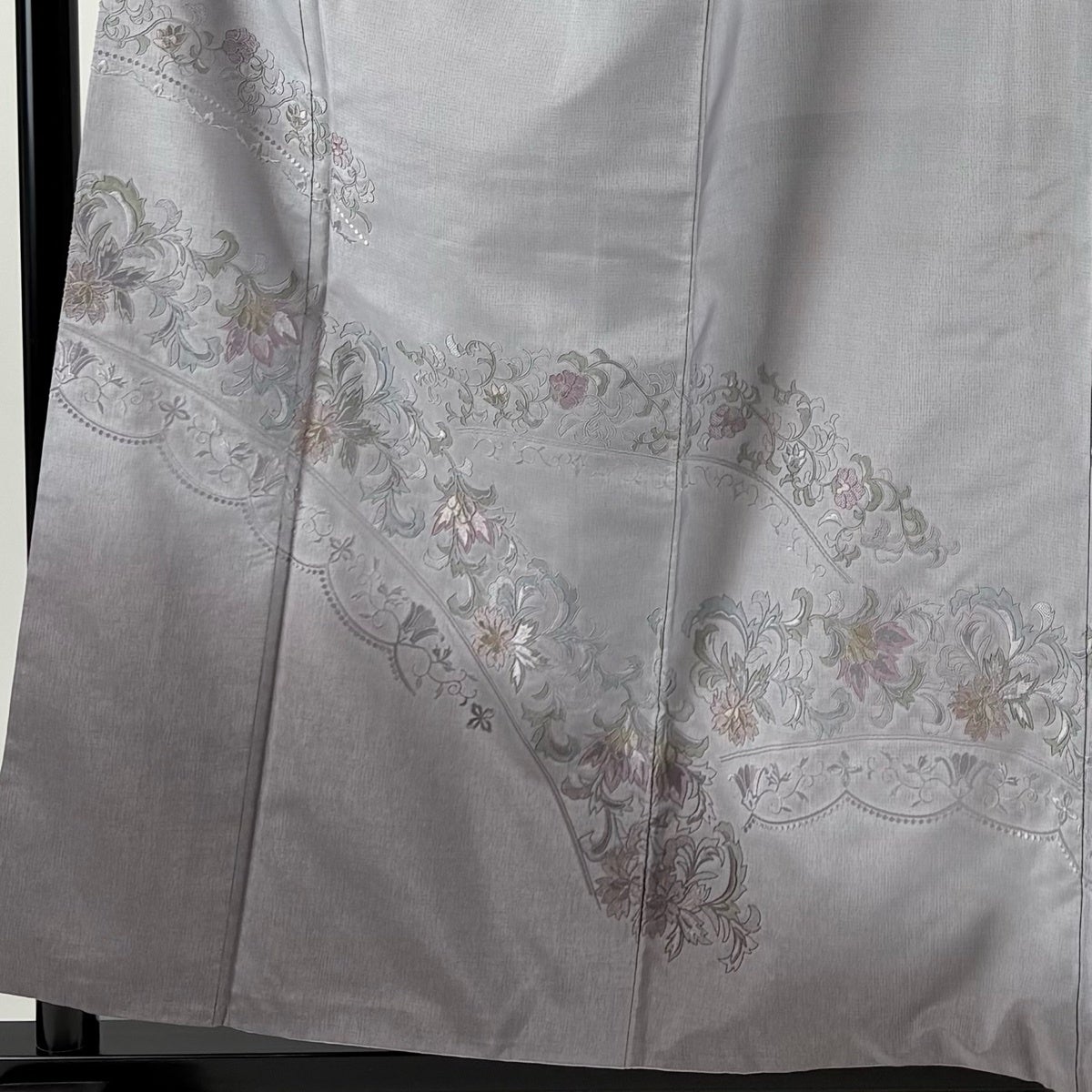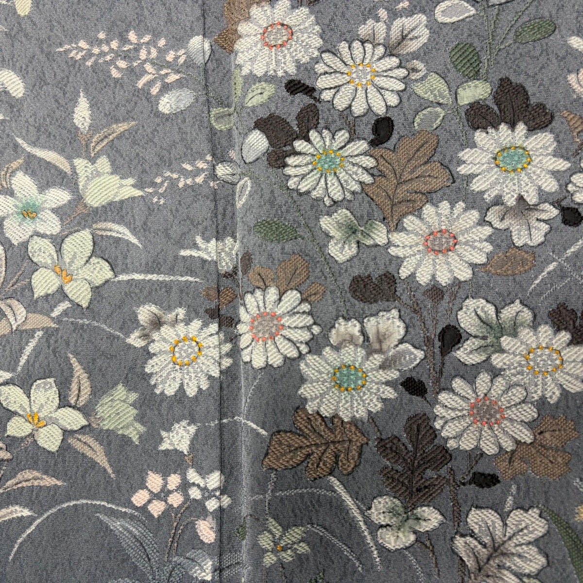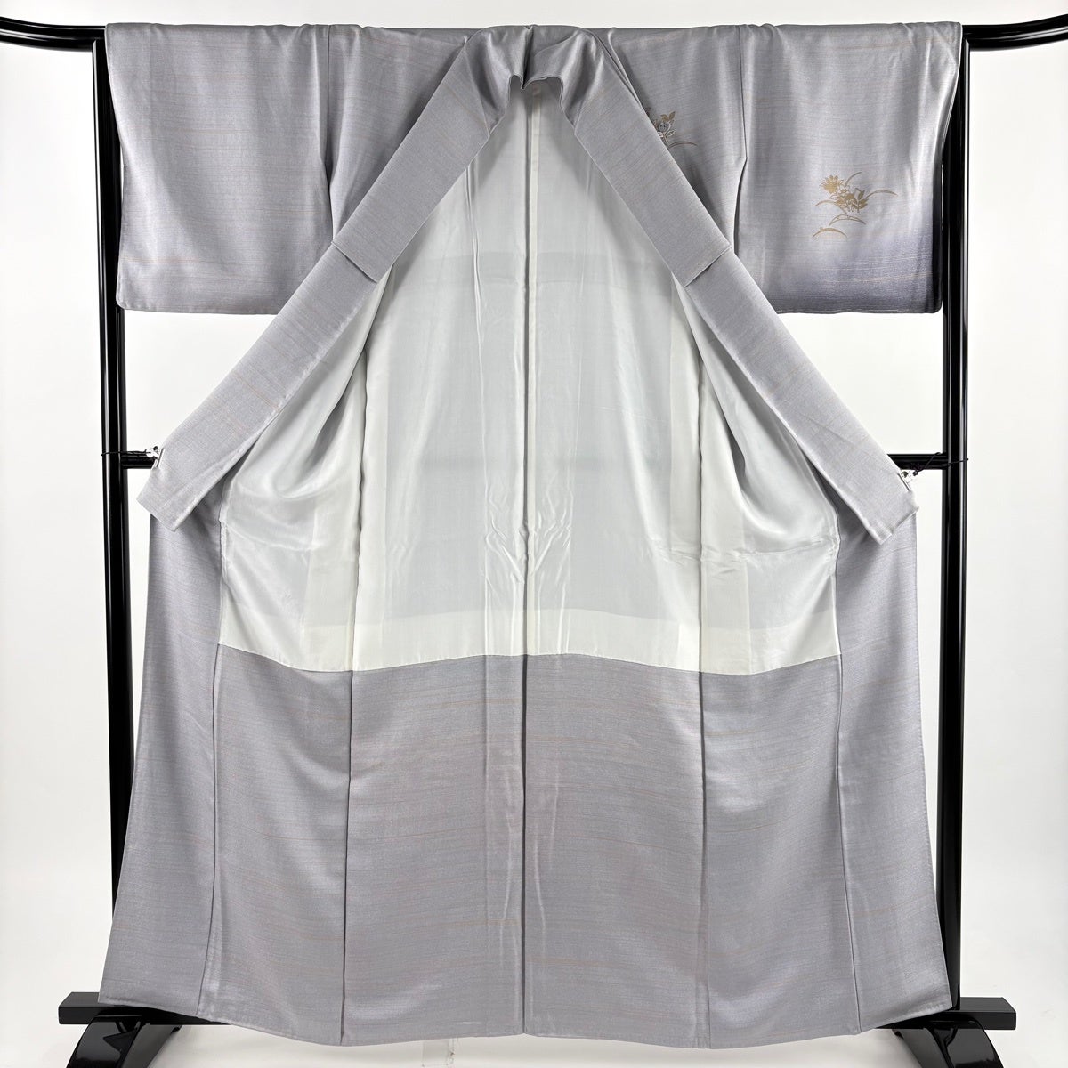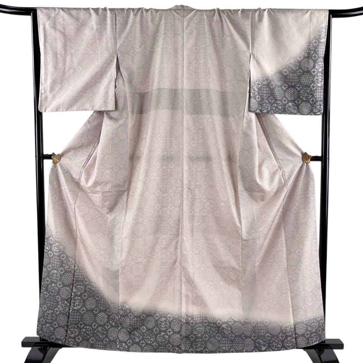 付け下げは訪問着を簡略化した訪問着より格が低くで小紋より格の高いの着物です。 特徴としては仕立て方の違いから訪問着などの一度真っさらな反物を着物の形に仮仕立てした後に柄付けをする絵羽模様とは違い、反物の状態で着用した時に柄付けが全て上を向くように書く事により左右の身頃や肩から袖にかけての模様が繋がっていない事です。 付け下げの歴史は他の着物に比べ浅く、戦時下に華美な訪問着が禁止された事で生まれた着物で、その後訪問着に比べ比較的安価で、それでいて着用シーンも訪問着とほぼ変わらないため大変好評になり、付け下げ訪問着と呼ばれる華やかな柄付けのものも考案された事により普及していきました。