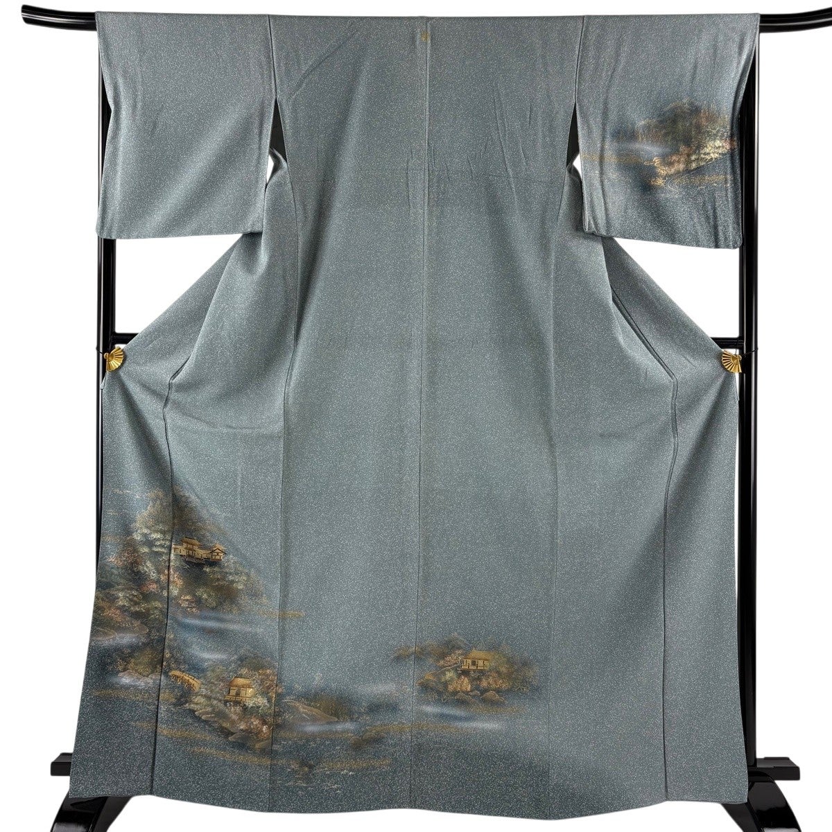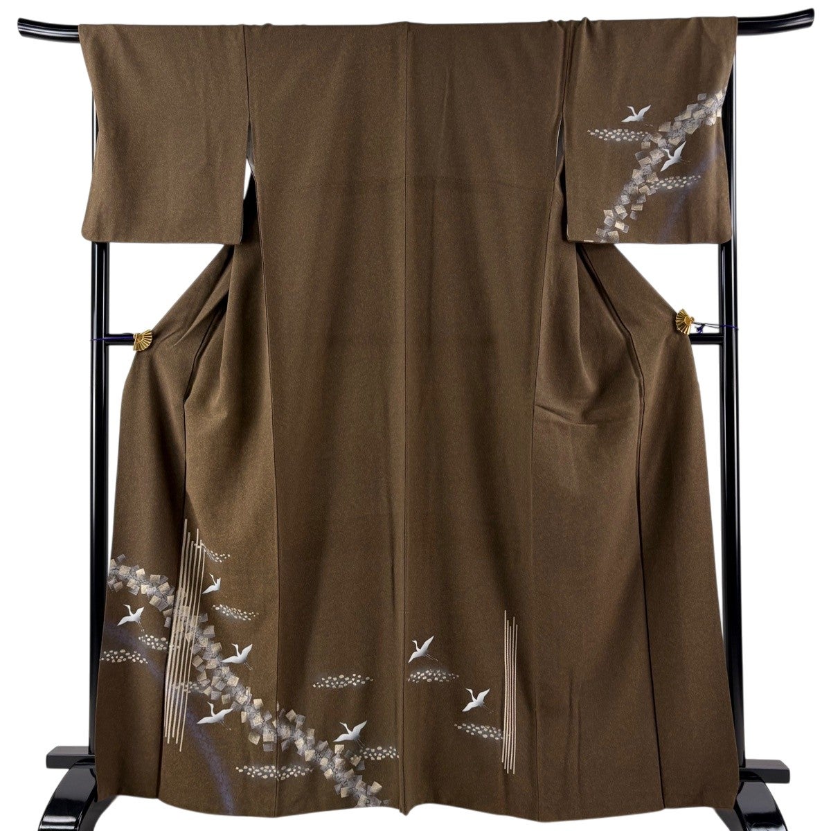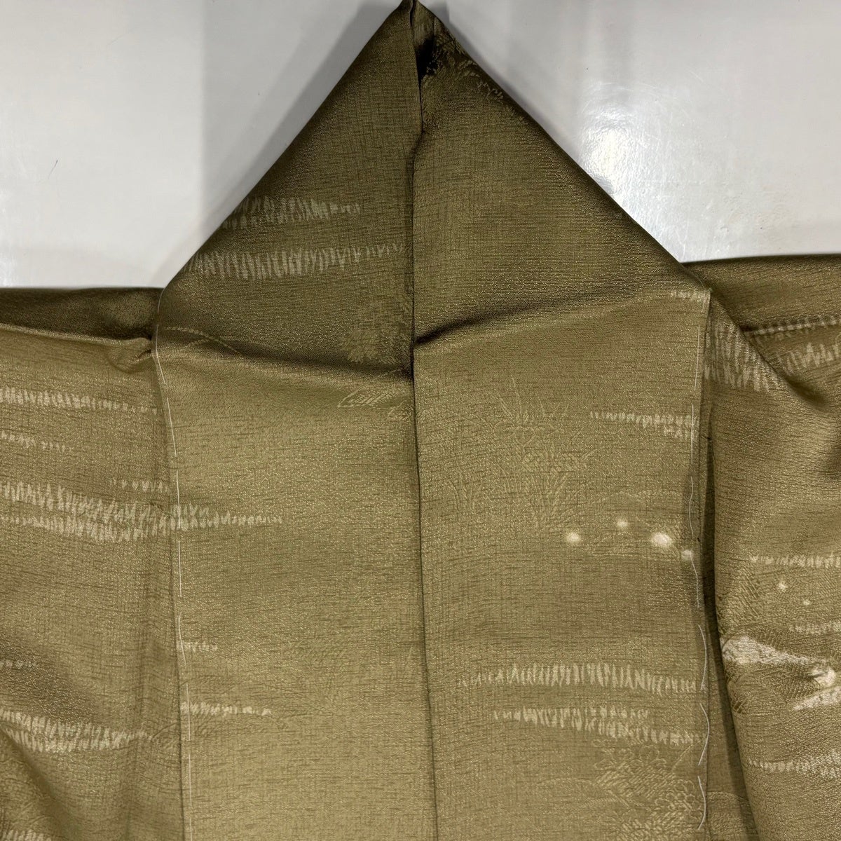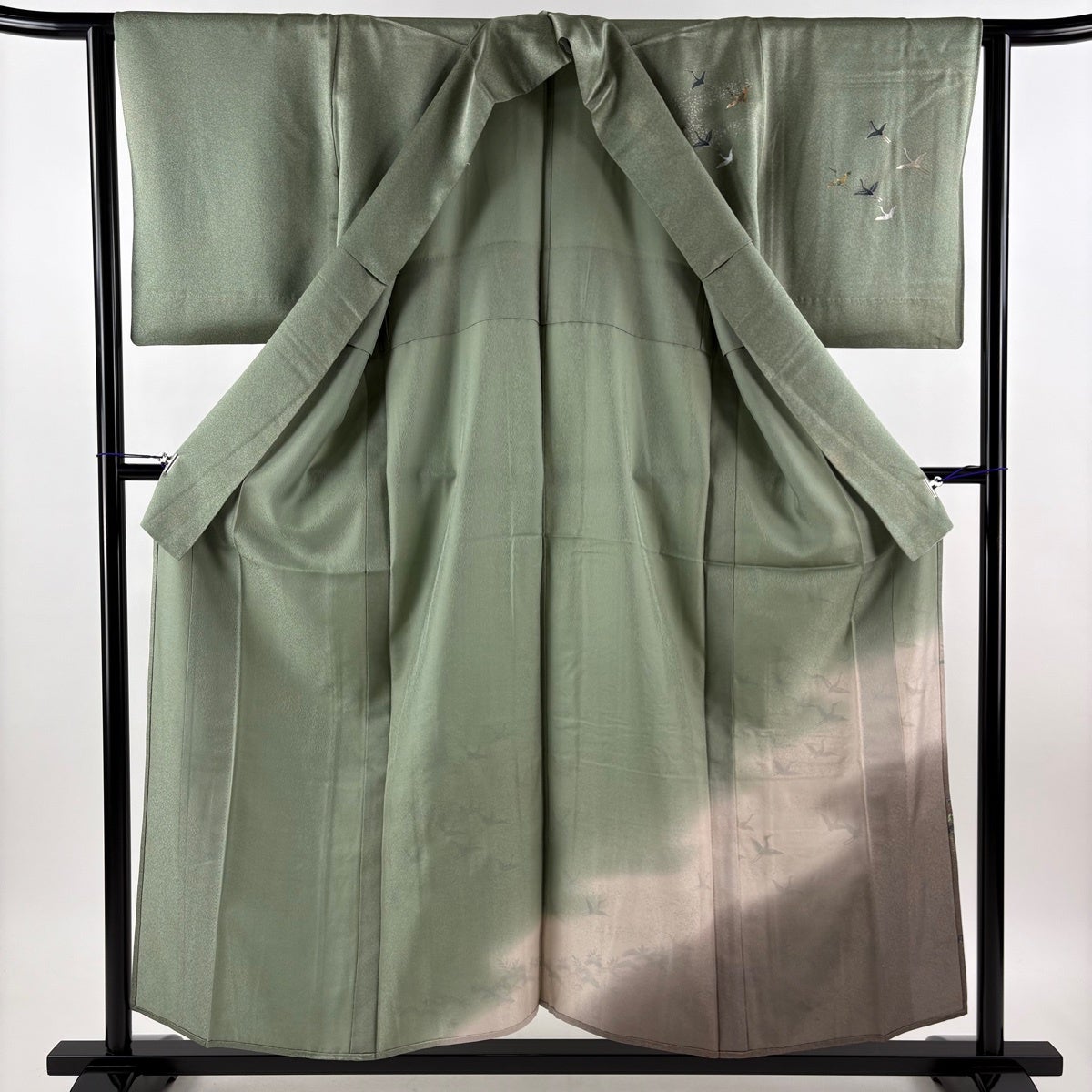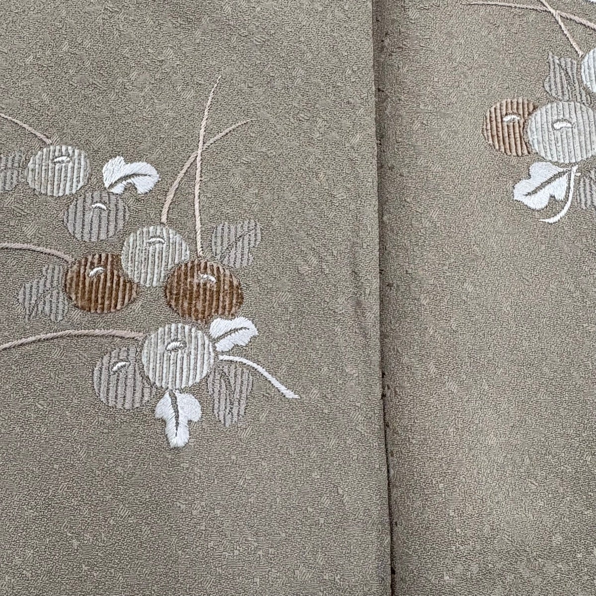 付け下げは訪問着を簡略化した訪問着より格が低くで小紋より格の高いの着物です。 特徴としては仕立て方の違いから訪問着などの一度真っさらな反物を着物の形に仮仕立てした後に柄付けをする絵羽模様とは違い、反物の状態で着用した時に柄付けが全て上を向くように書く事により左右の身頃や肩から袖にかけての模様が繋がっていない事です。 付け下げの歴史は他の着物に比べ浅く、戦時下に華美な訪問着が禁止された事で生まれた着物で、その後訪問着に比べ比較的安価で、それでいて着用シーンも訪問着とほぼ変わらないため大変好評になり、付け下げ訪問着と呼ばれる華やかな柄付けのものも考案された事により普及していきました。