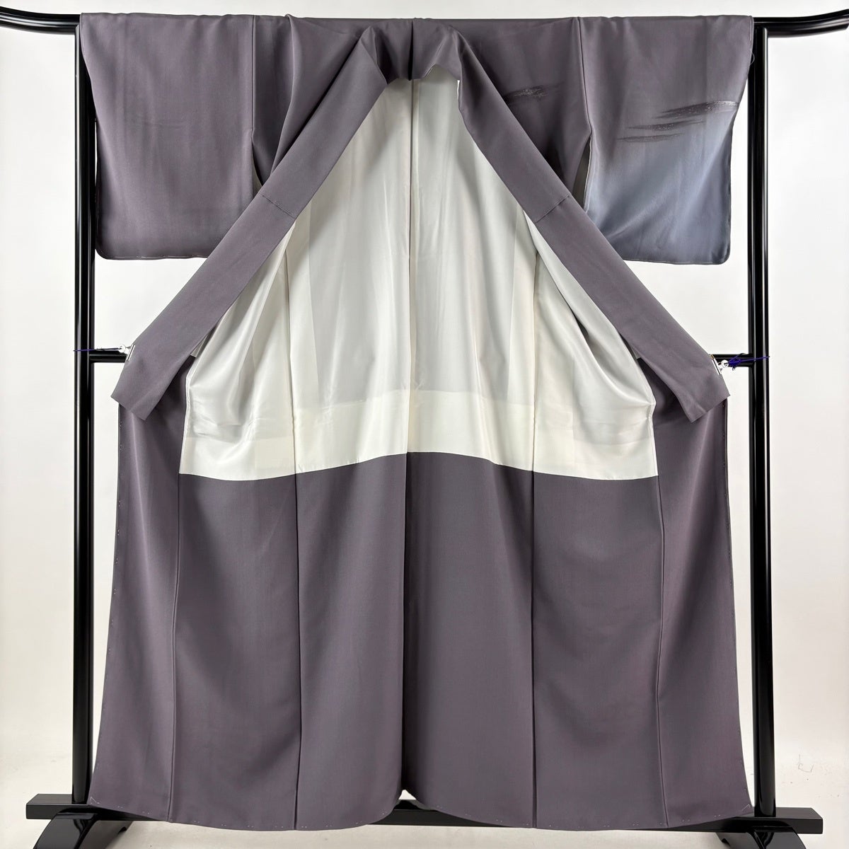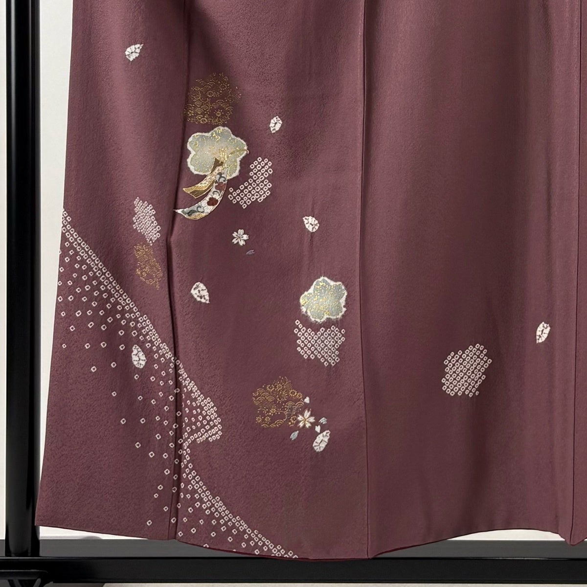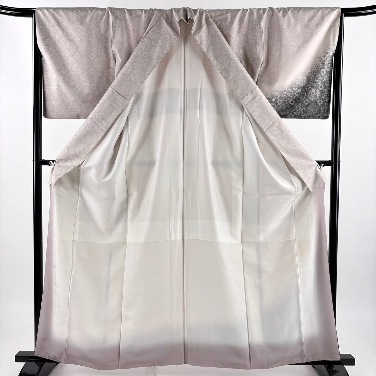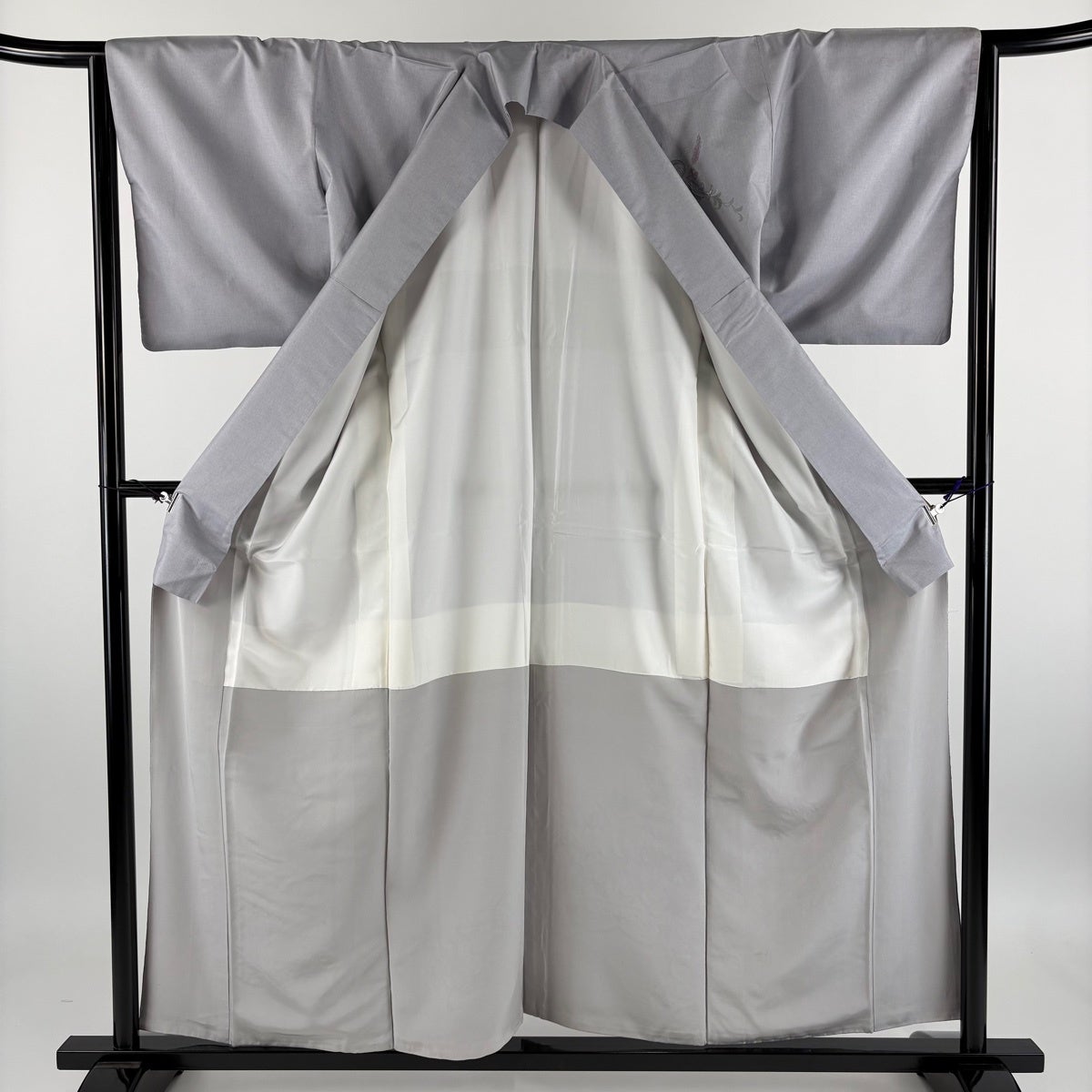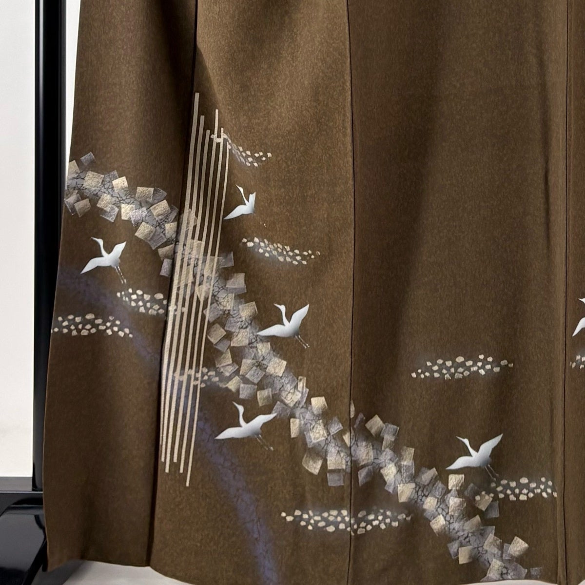 付け下げは訪問着を簡略化した訪問着より格が低くで小紋より格の高いの着物です。 特徴としては仕立て方の違いから訪問着などの一度真っさらな反物を着物の形に仮仕立てした後に柄付けをする絵羽模様とは違い、反物の状態で着用した時に柄付けが全て上を向くように書く事により左右の身頃や肩から袖にかけての模様が繋がっていない事です。 付け下げの歴史は他の着物に比べ浅く、戦時下に華美な訪問着が禁止された事で生まれた着物で、その後訪問着に比べ比較的安価で、それでいて着用シーンも訪問着とほぼ変わらないため大変好評になり、付け下げ訪問着と呼ばれる華やかな柄付けのものも考案された事により普及していきました。