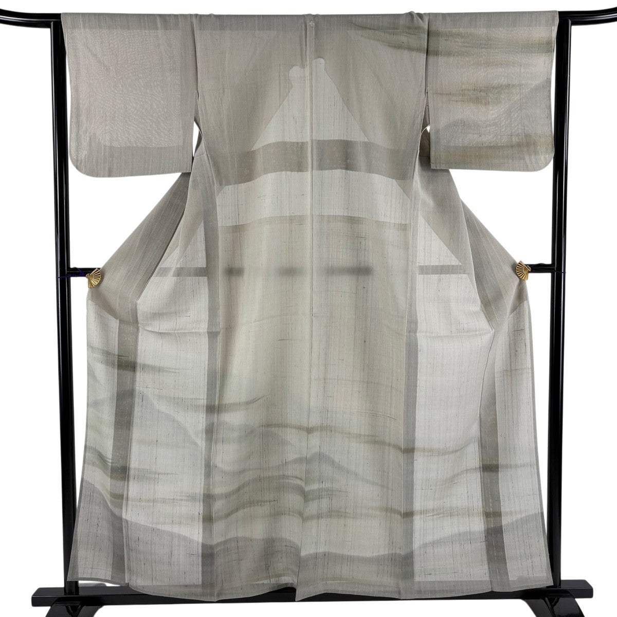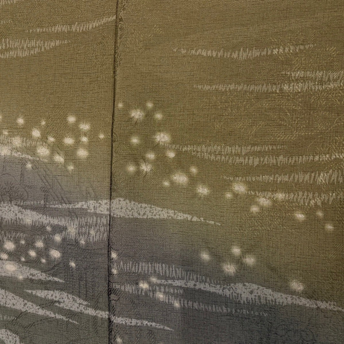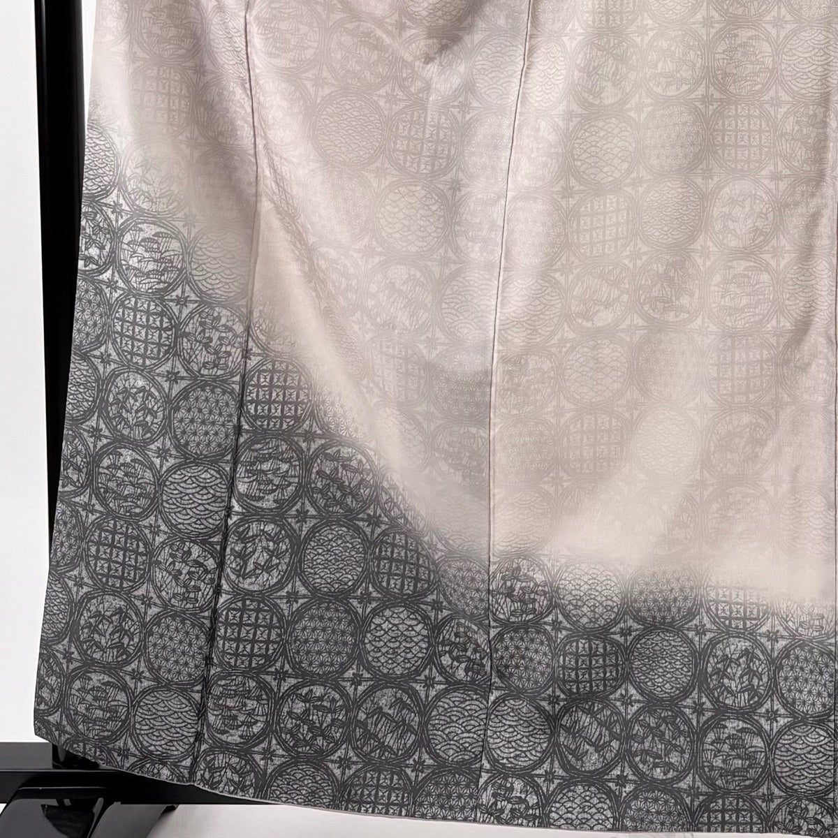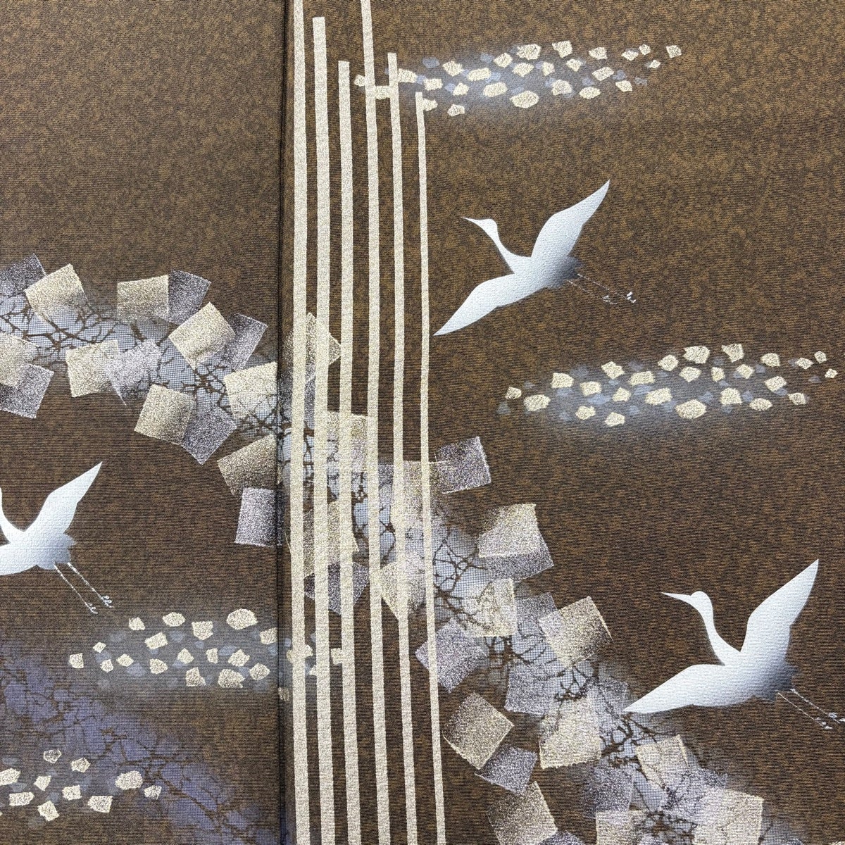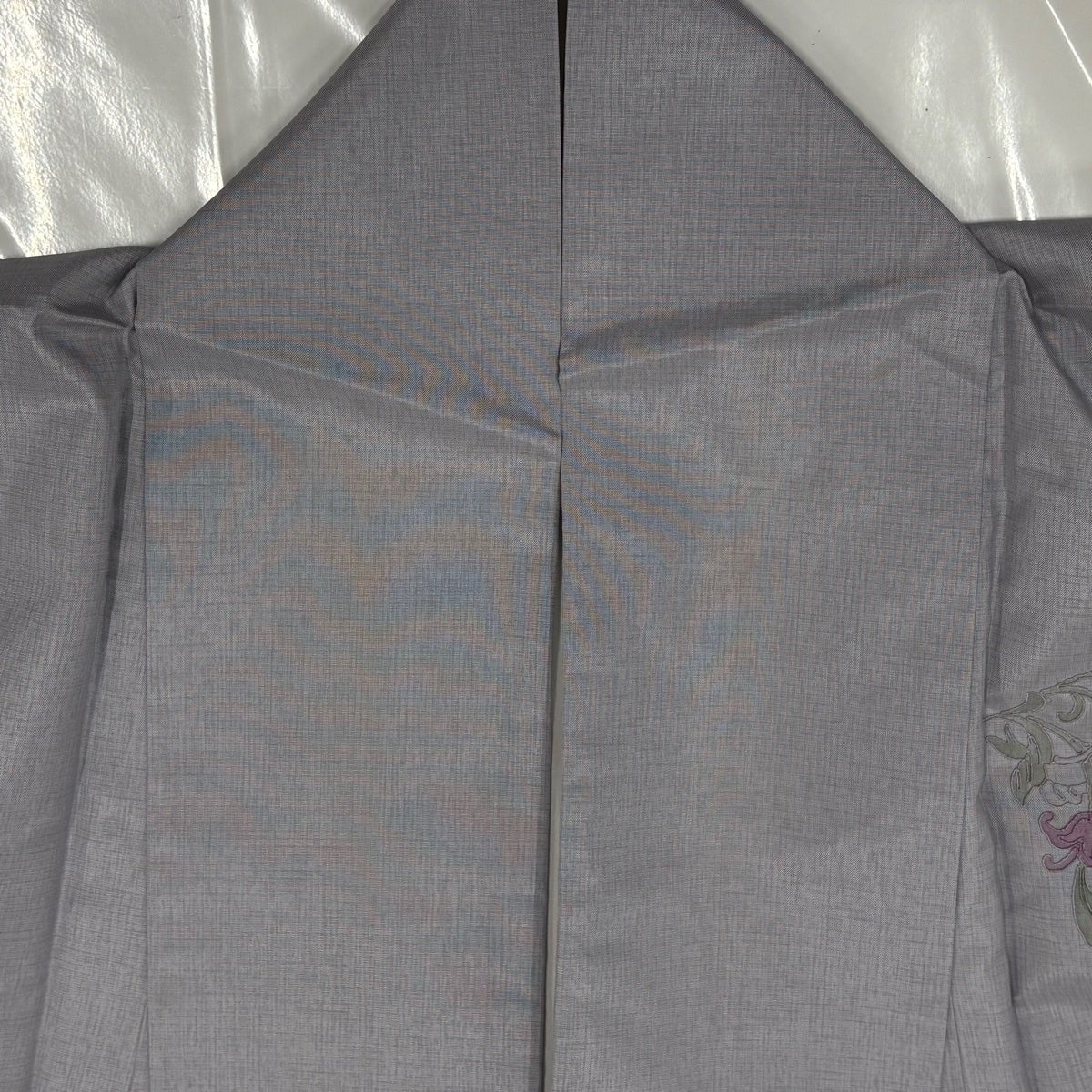 付け下げは訪問着を簡略化した訪問着より格が低くで小紋より格の高いの着物です。 特徴としては仕立て方の違いから訪問着などの一度真っさらな反物を着物の形に仮仕立てした後に柄付けをする絵羽模様とは違い、反物の状態で着用した時に柄付けが全て上を向くように書く事により左右の身頃や肩から袖にかけての模様が繋がっていない事です。 付け下げの歴史は他の着物に比べ浅く、戦時下に華美な訪問着が禁止された事で生まれた着物で、その後訪問着に比べ比較的安価で、それでいて着用シーンも訪問着とほぼ変わらないため大変好評になり、付け下げ訪問着と呼ばれる華やかな柄付けのものも考案された事により普及していきました。