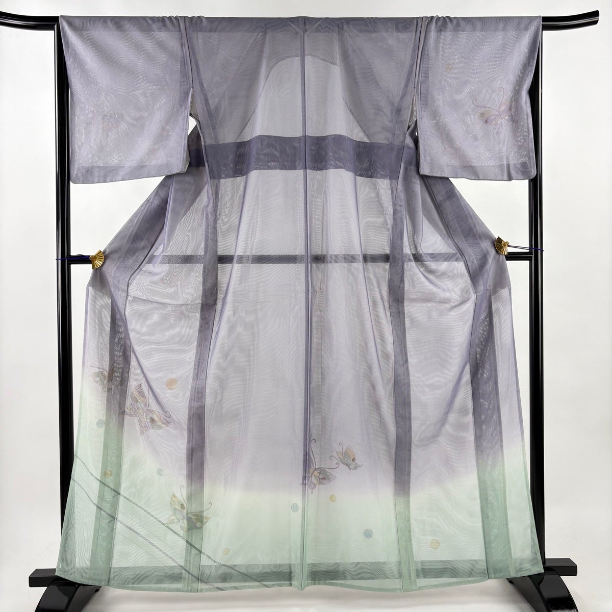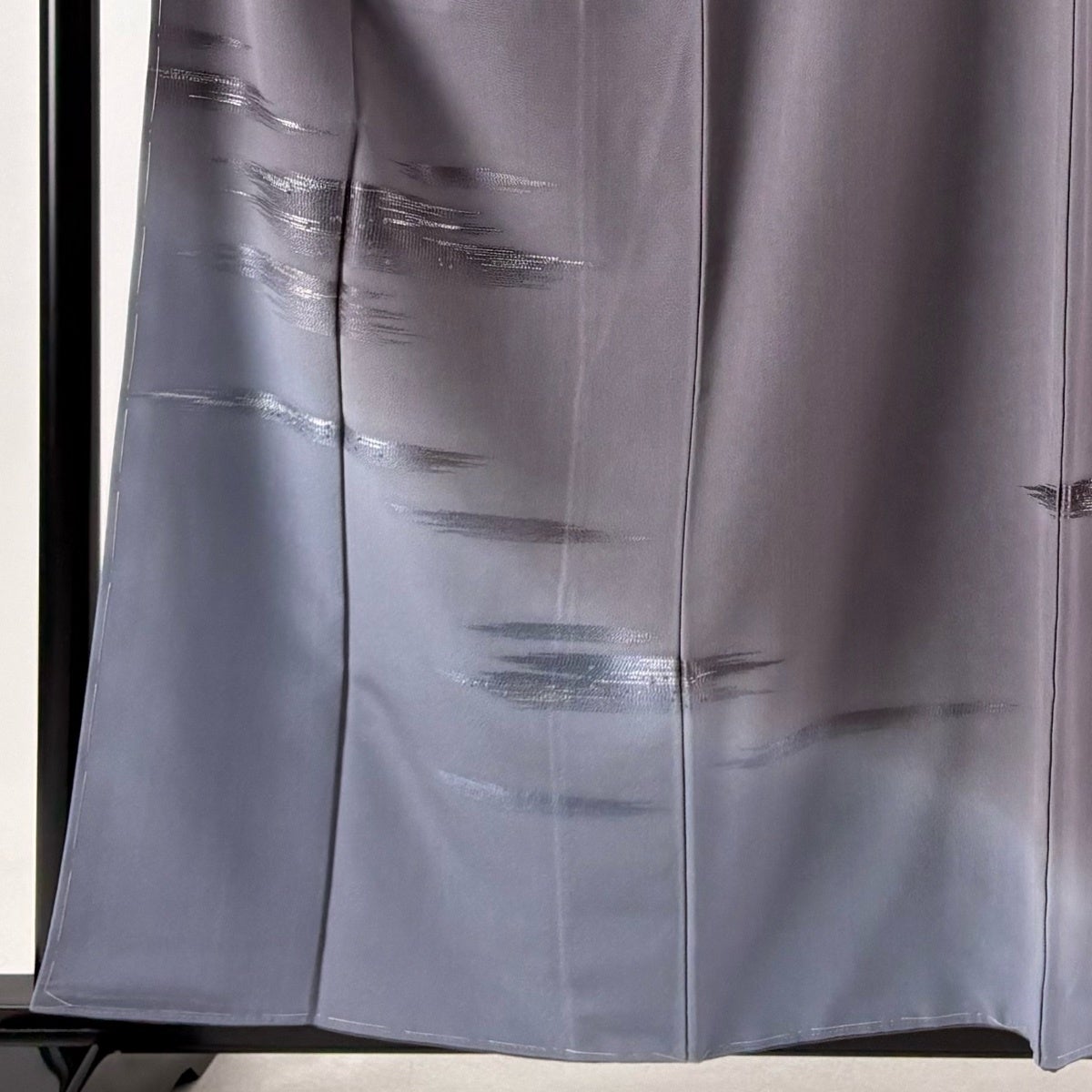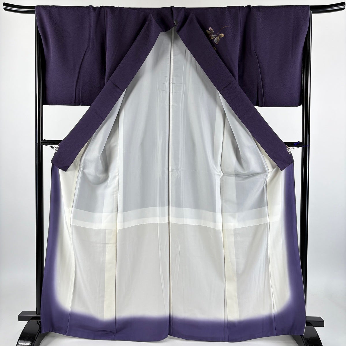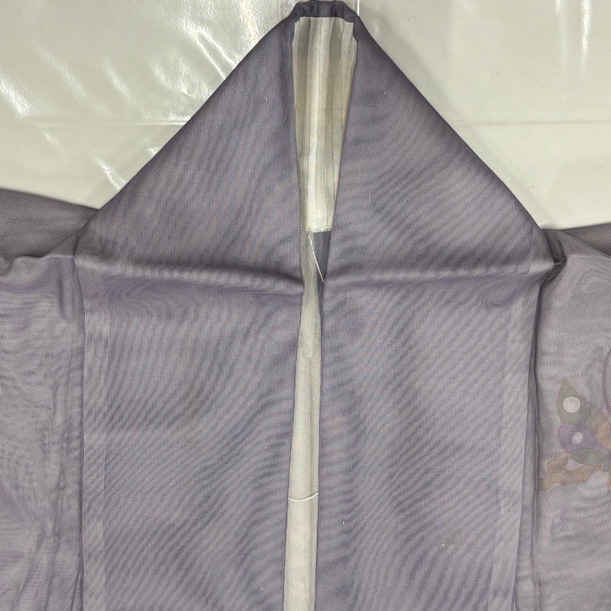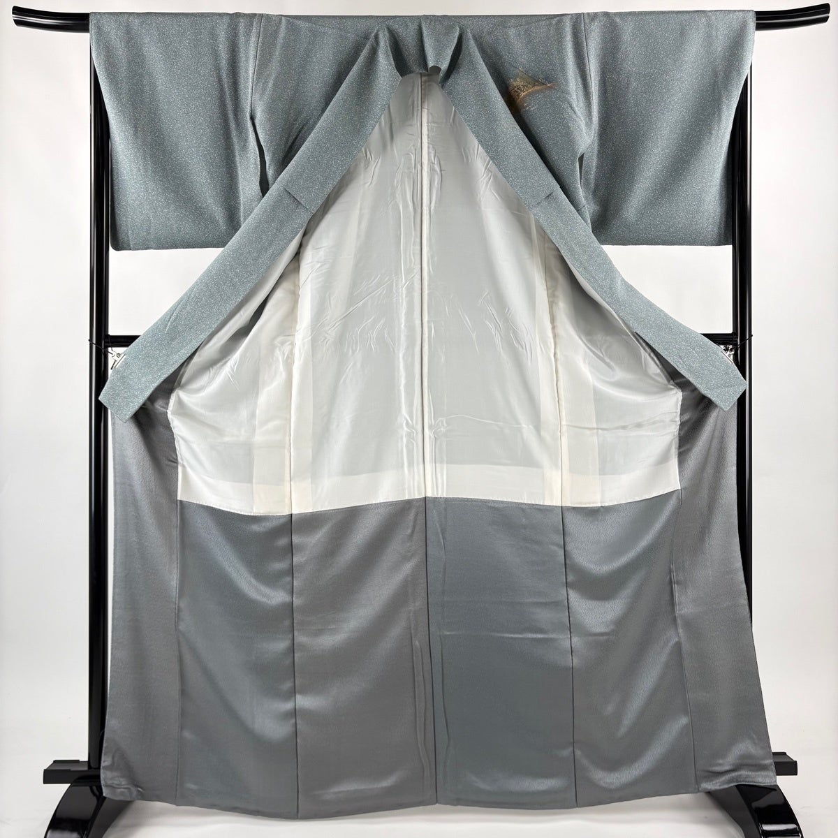 付け下げは訪問着を簡略化した訪問着より格が低くで小紋より格の高いの着物です。 特徴としては仕立て方の違いから訪問着などの一度真っさらな反物を着物の形に仮仕立てした後に柄付けをする絵羽模様とは違い、反物の状態で着用した時に柄付けが全て上を向くように書く事により左右の身頃や肩から袖にかけての模様が繋がっていない事です。 付け下げの歴史は他の着物に比べ浅く、戦時下に華美な訪問着が禁止された事で生まれた着物で、その後訪問着に比べ比較的安価で、それでいて着用シーンも訪問着とほぼ変わらないため大変好評になり、付け下げ訪問着と呼ばれる華やかな柄付けのものも考案された事により普及していきました。