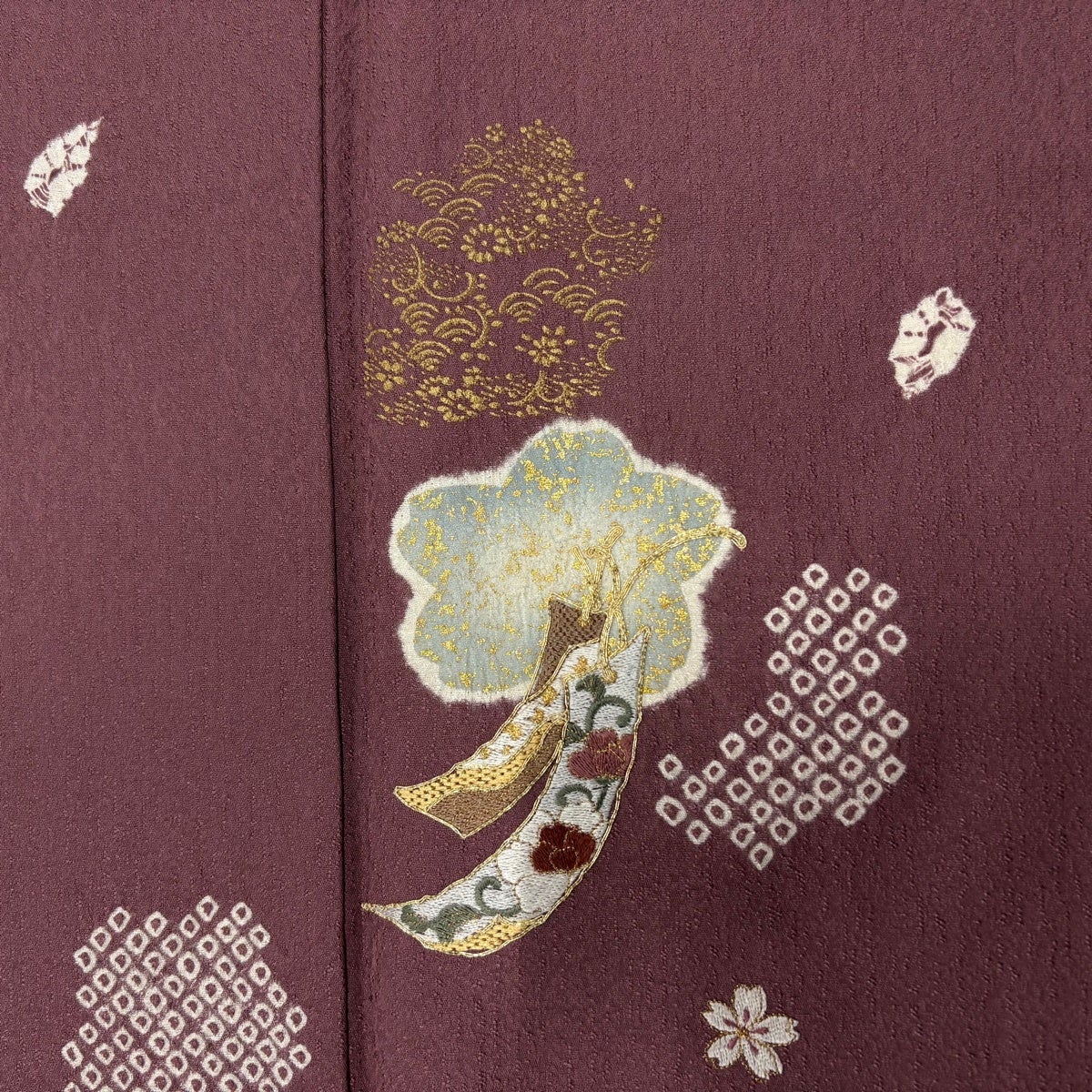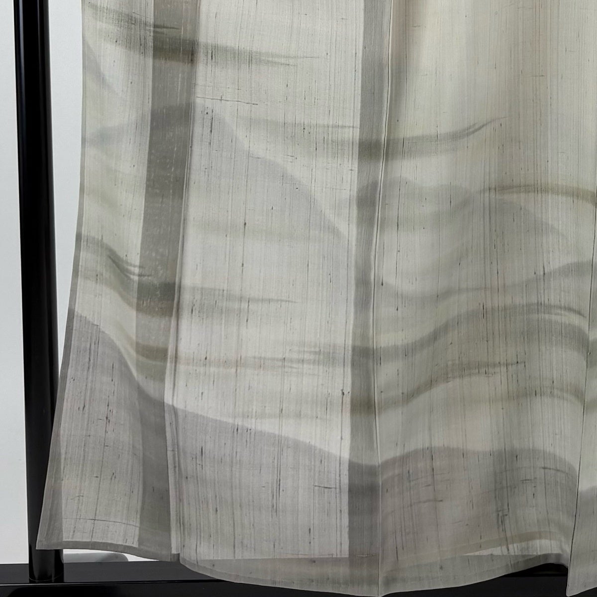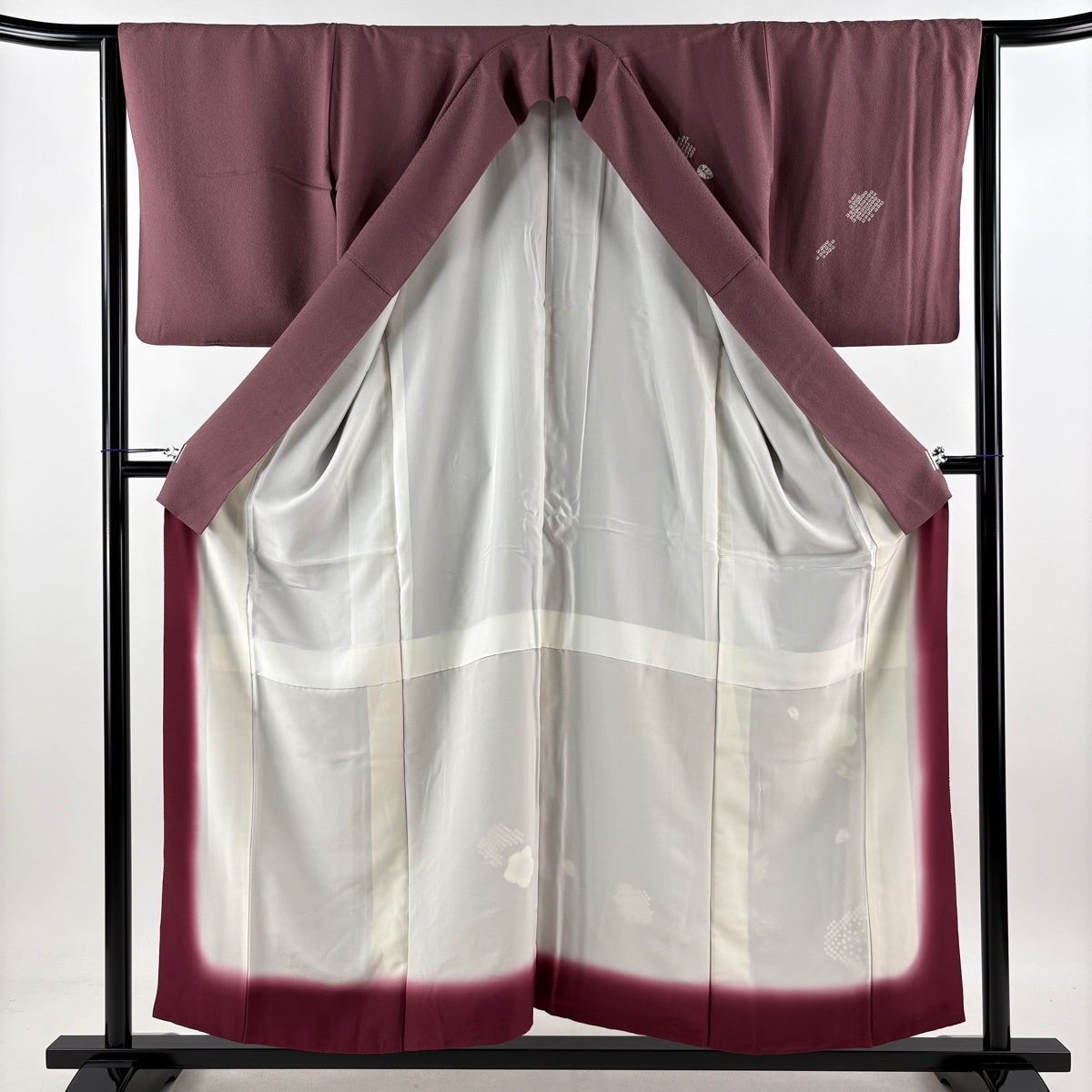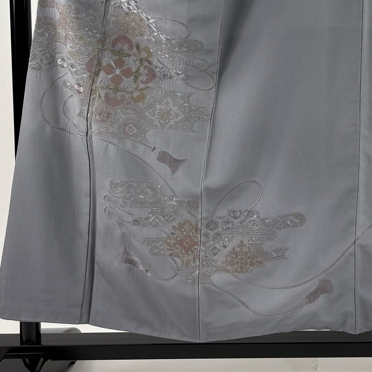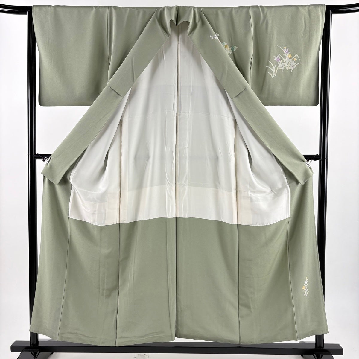 付け下げは訪問着を簡略化した訪問着より格が低くで小紋より格の高いの着物です。 特徴としては仕立て方の違いから訪問着などの一度真っさらな反物を着物の形に仮仕立てした後に柄付けをする絵羽模様とは違い、反物の状態で着用した時に柄付けが全て上を向くように書く事により左右の身頃や肩から袖にかけての模様が繋がっていない事です。 付け下げの歴史は他の着物に比べ浅く、戦時下に華美な訪問着が禁止された事で生まれた着物で、その後訪問着に比べ比較的安価で、それでいて着用シーンも訪問着とほぼ変わらないため大変好評になり、付け下げ訪問着と呼ばれる華やかな柄付けのものも考案された事により普及していきました。