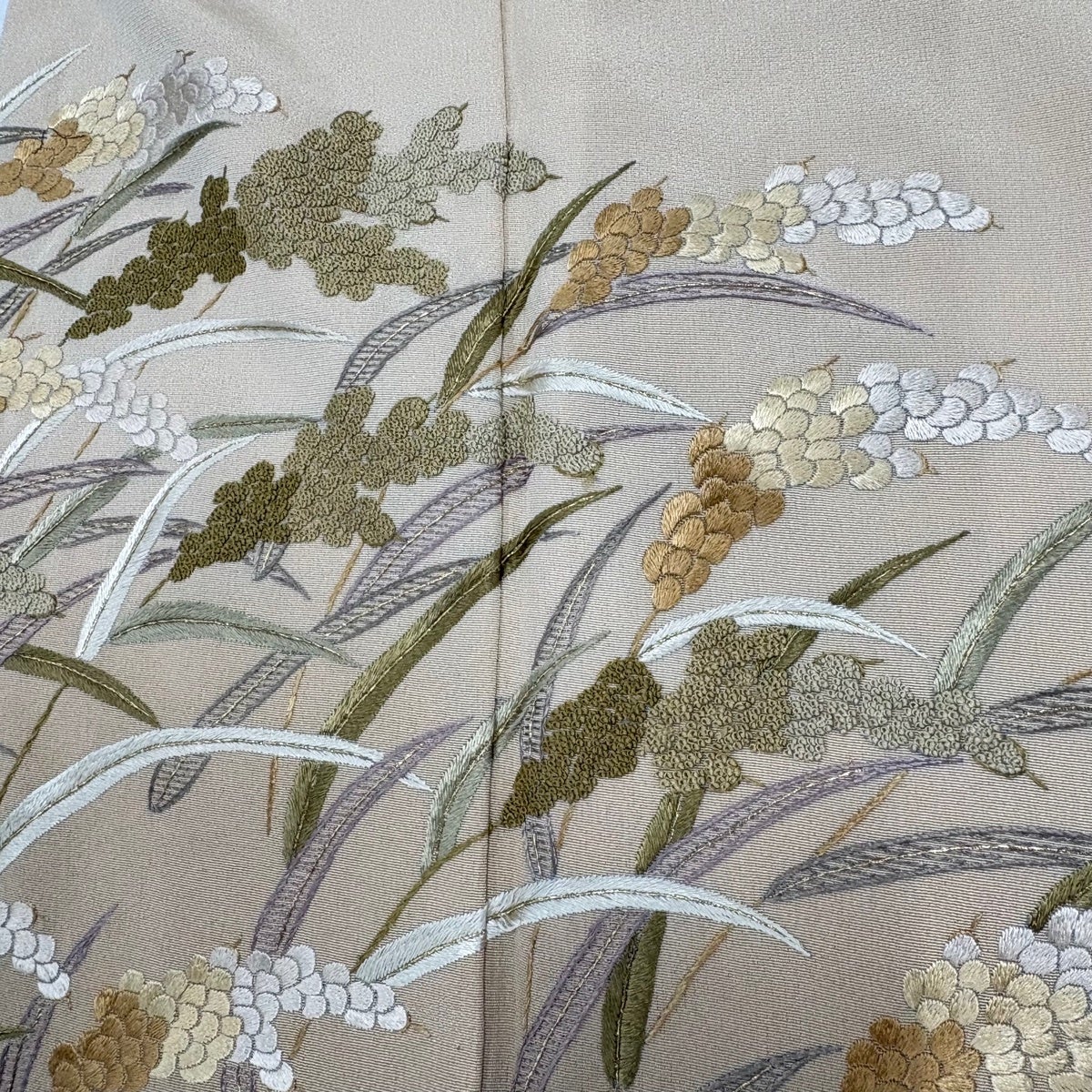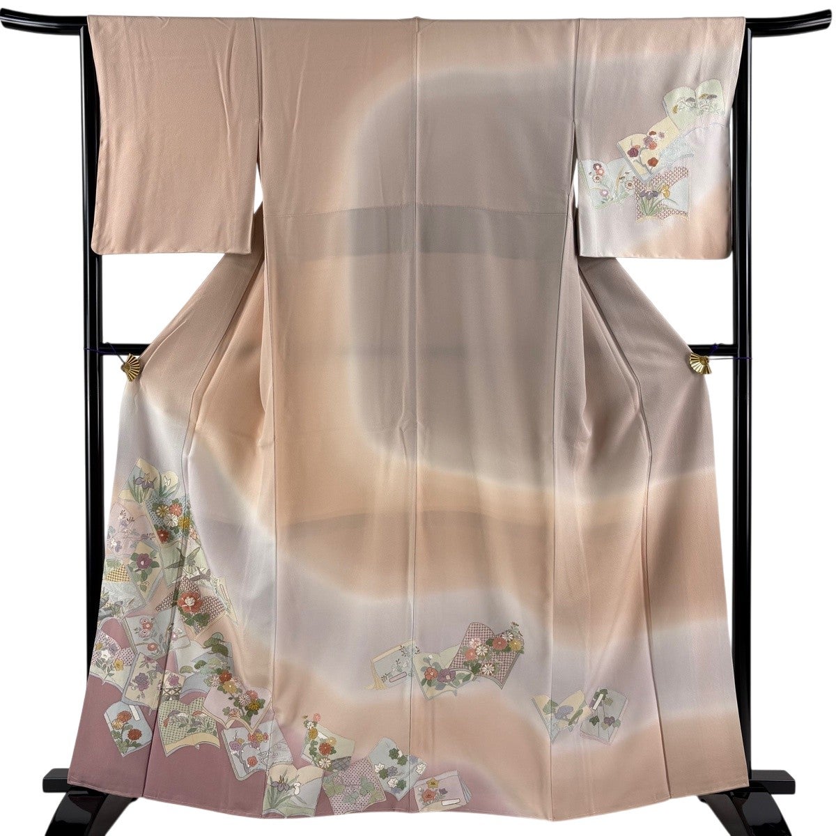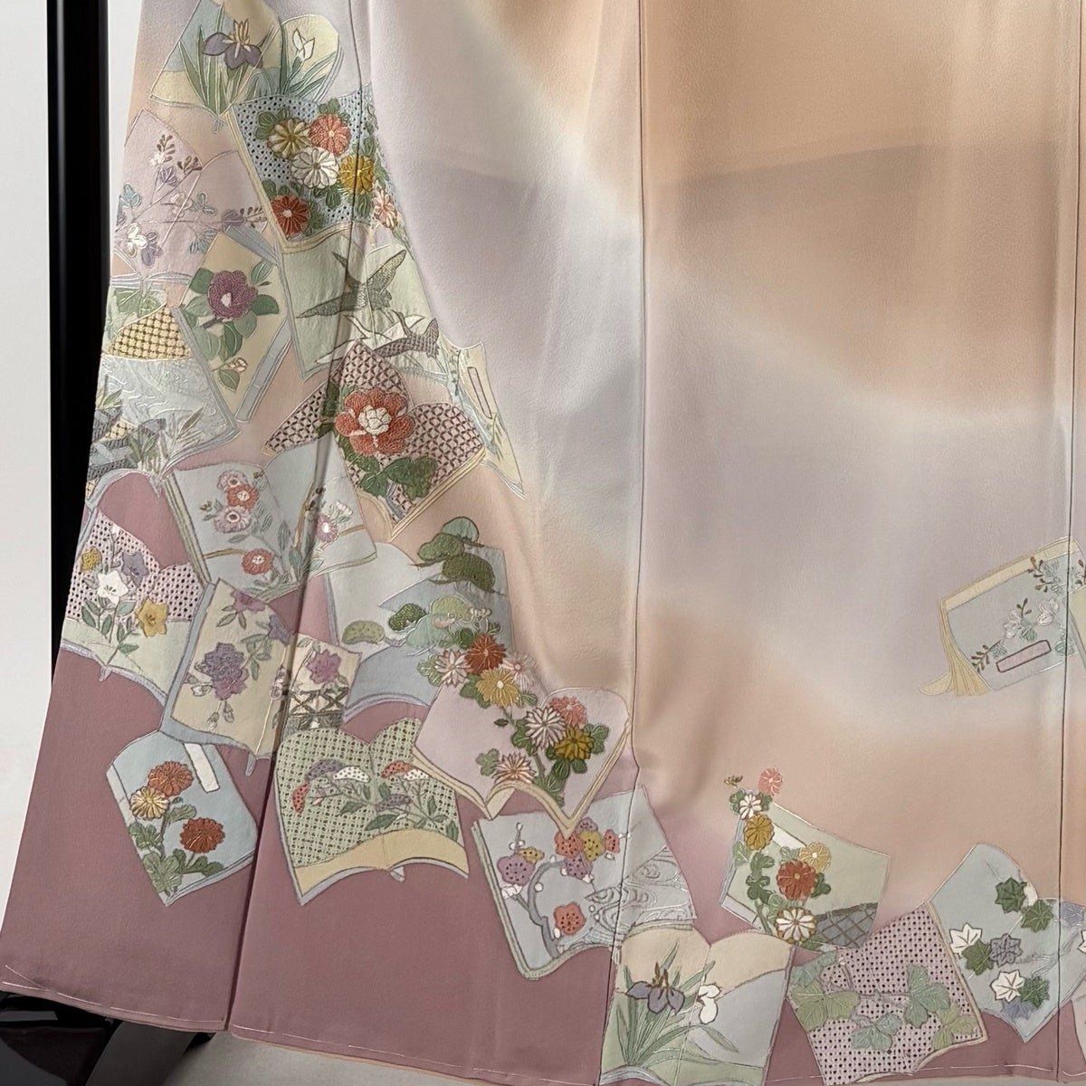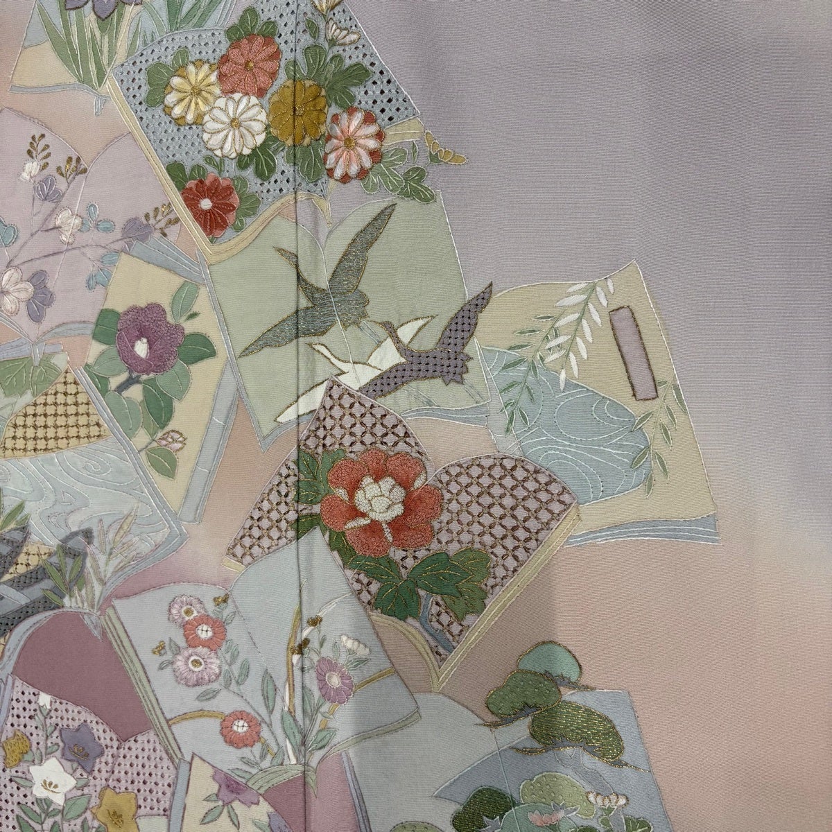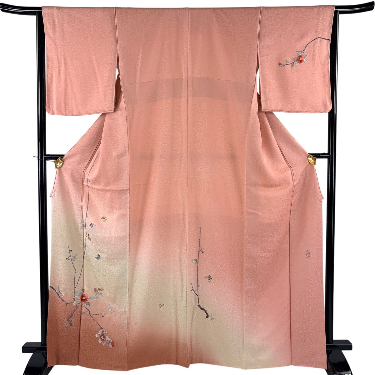 付け下げは訪問着を簡略化した訪問着より格が低くで小紋より格の高いの着物です。 特徴としては仕立て方の違いから訪問着などの一度真っさらな反物を着物の形に仮仕立てした後に柄付けをする絵羽模様とは違い、反物の状態で着用した時に柄付けが全て上を向くように書く事により左右の身頃や肩から袖にかけての模様が繋がっていない事です。 付け下げの歴史は他の着物に比べ浅く、戦時下に華美な訪問着が禁止された事で生まれた着物で、その後訪問着に比べ比較的安価で、それでいて着用シーンも訪問着とほぼ変わらないため大変好評になり、付け下げ訪問着と呼ばれる華やかな柄付けのものも考案された事により普及していきました。