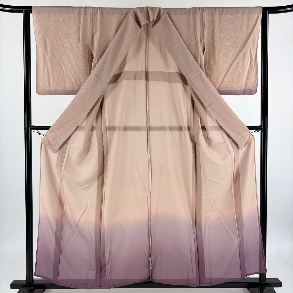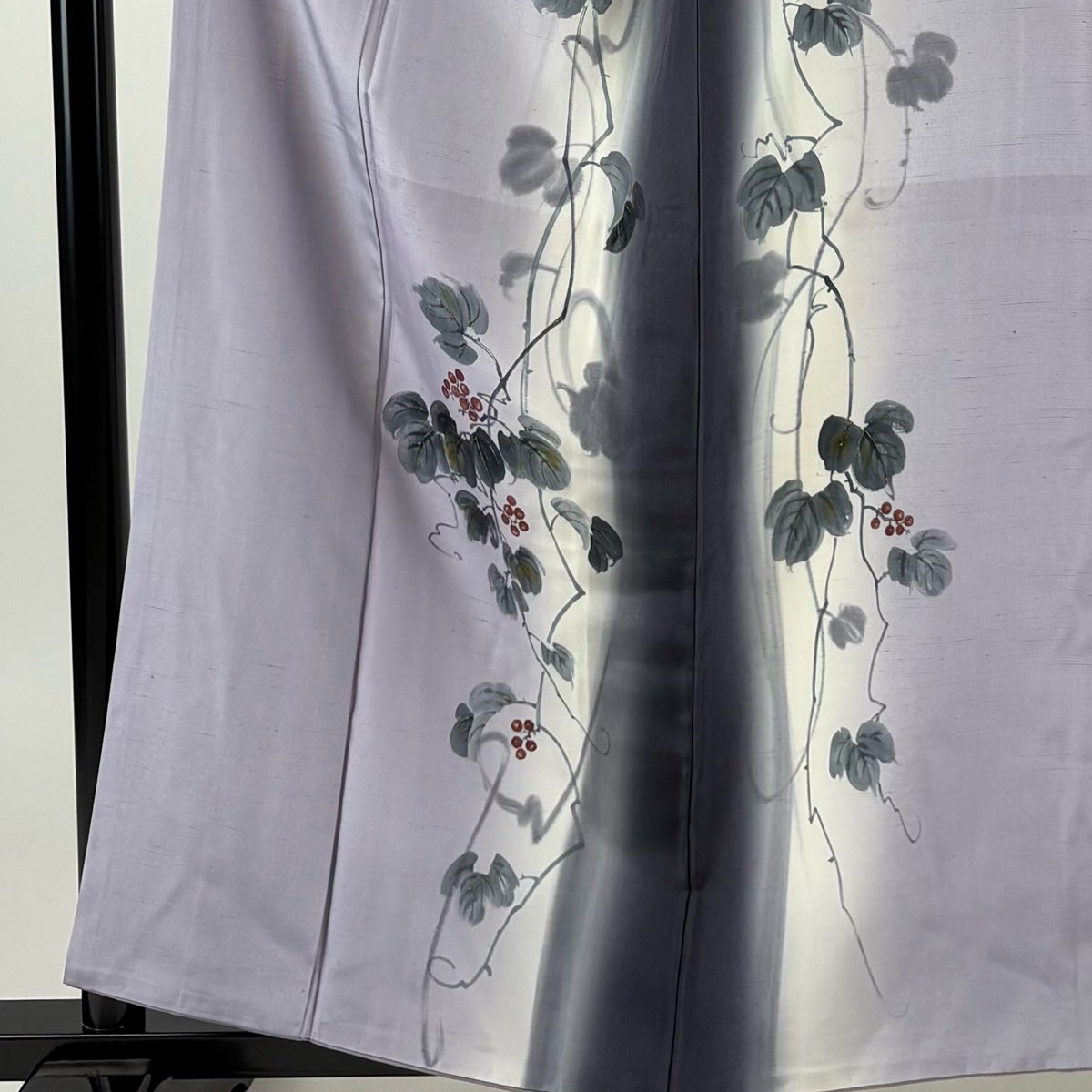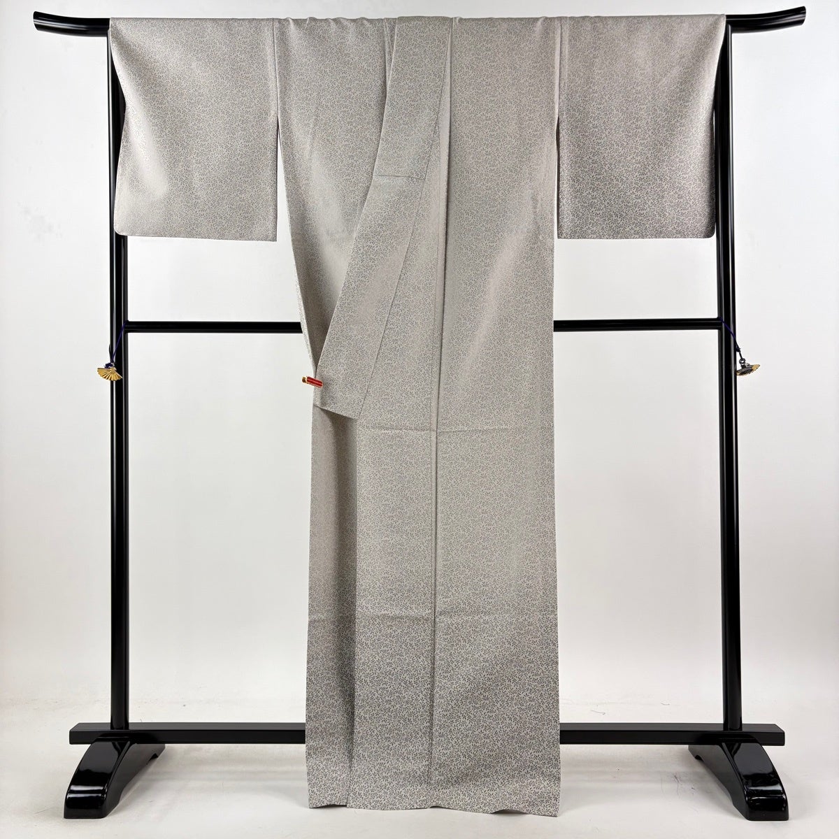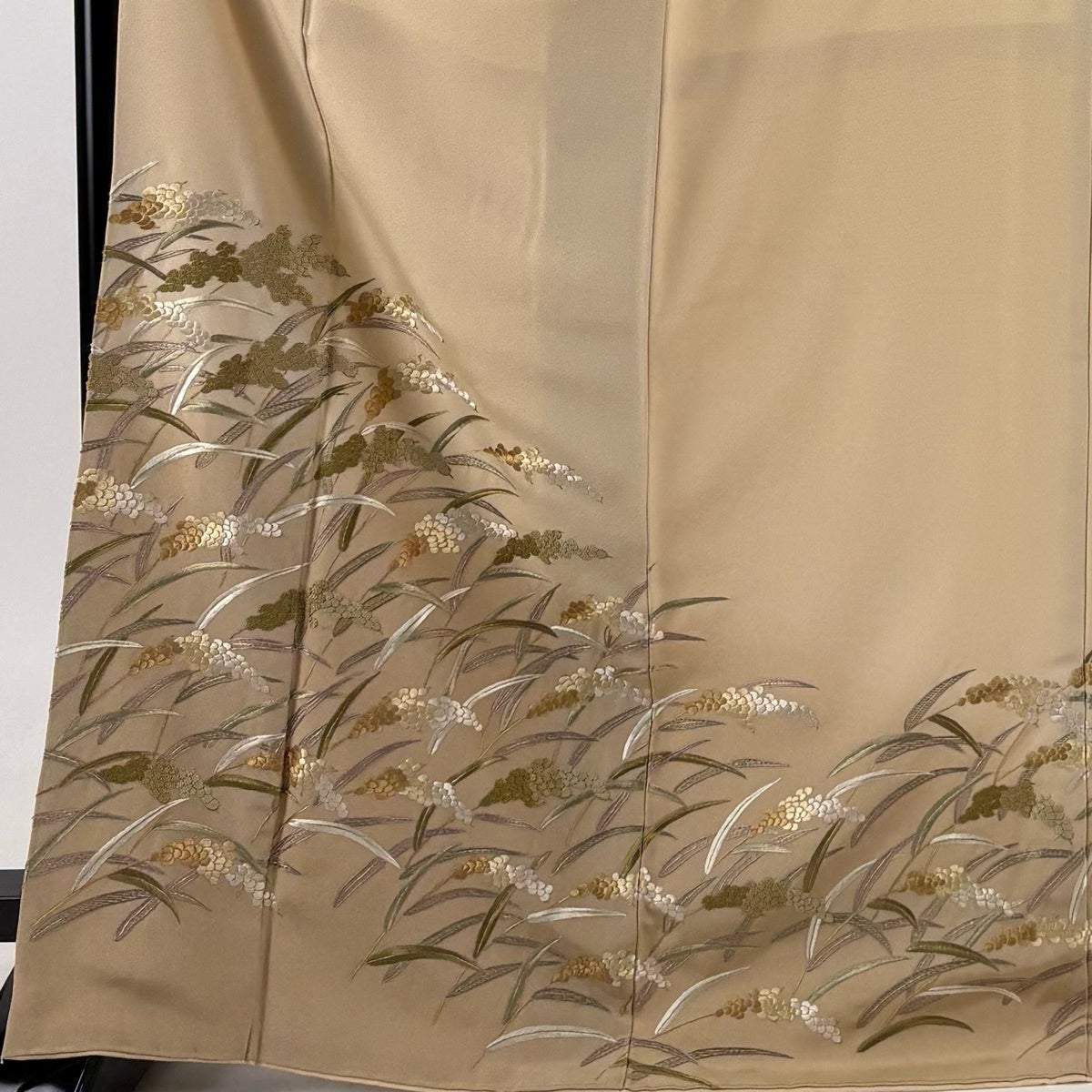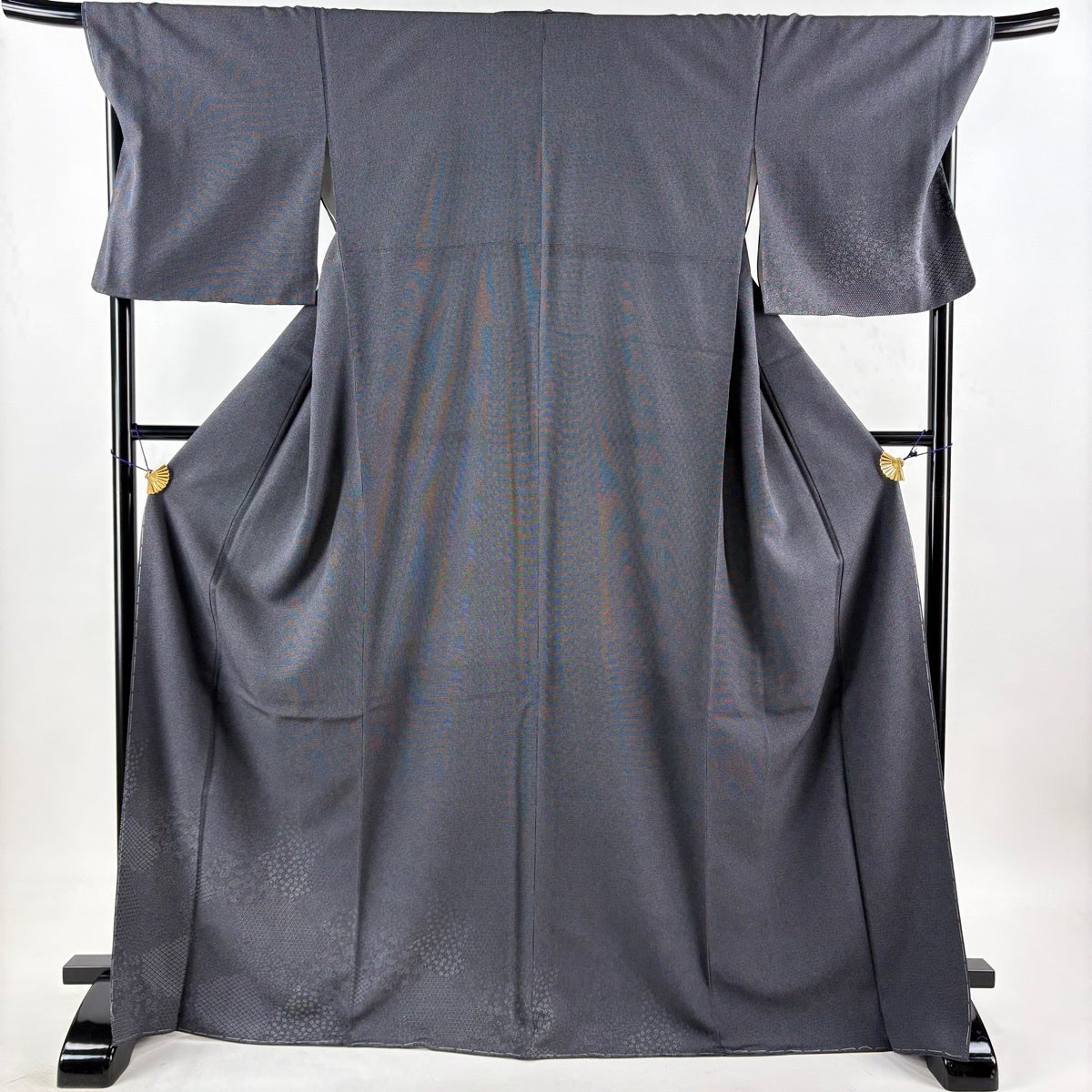 付け下げは訪問着を簡略化した訪問着より格が低くで小紋より格の高いの着物です。 特徴としては仕立て方の違いから訪問着などの一度真っさらな反物を着物の形に仮仕立てした後に柄付けをする絵羽模様とは違い、反物の状態で着用した時に柄付けが全て上を向くように書く事により左右の身頃や肩から袖にかけての模様が繋がっていない事です。 付け下げの歴史は他の着物に比べ浅く、戦時下に華美な訪問着が禁止された事で生まれた着物で、その後訪問着に比べ比較的安価で、それでいて着用シーンも訪問着とほぼ変わらないため大変好評になり、付け下げ訪問着と呼ばれる華やかな柄付けのものも考案された事により普及していきました。