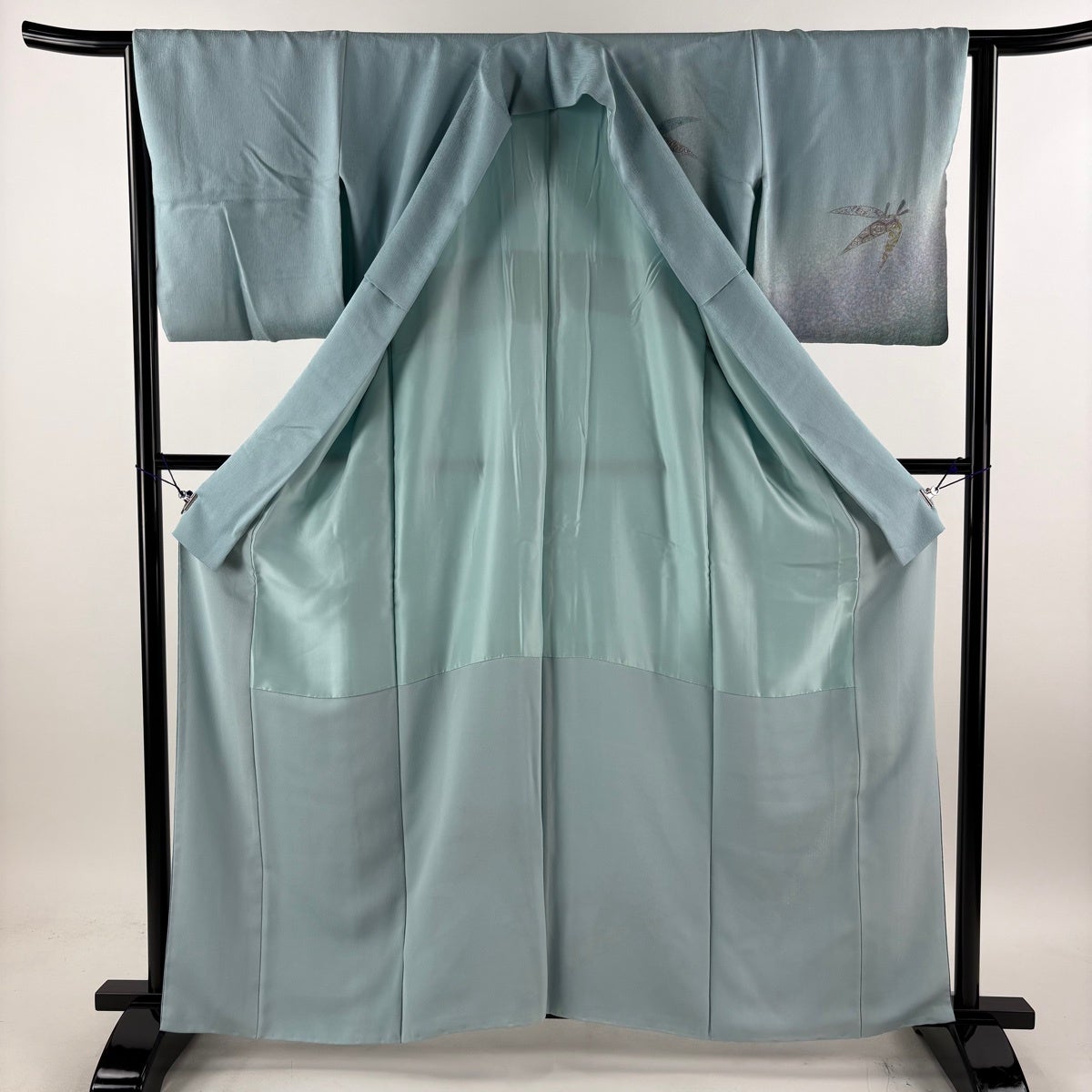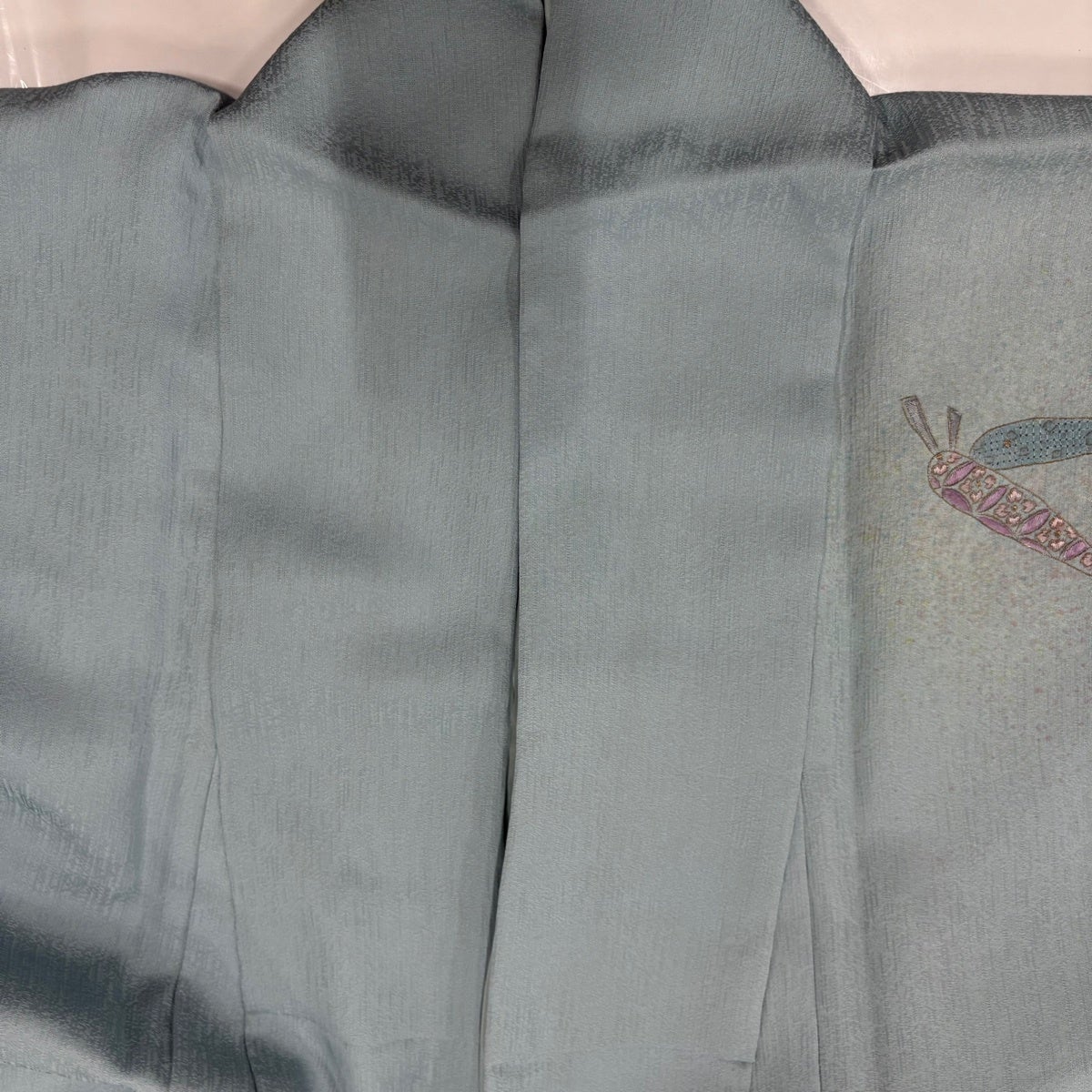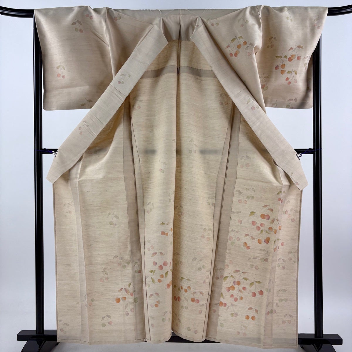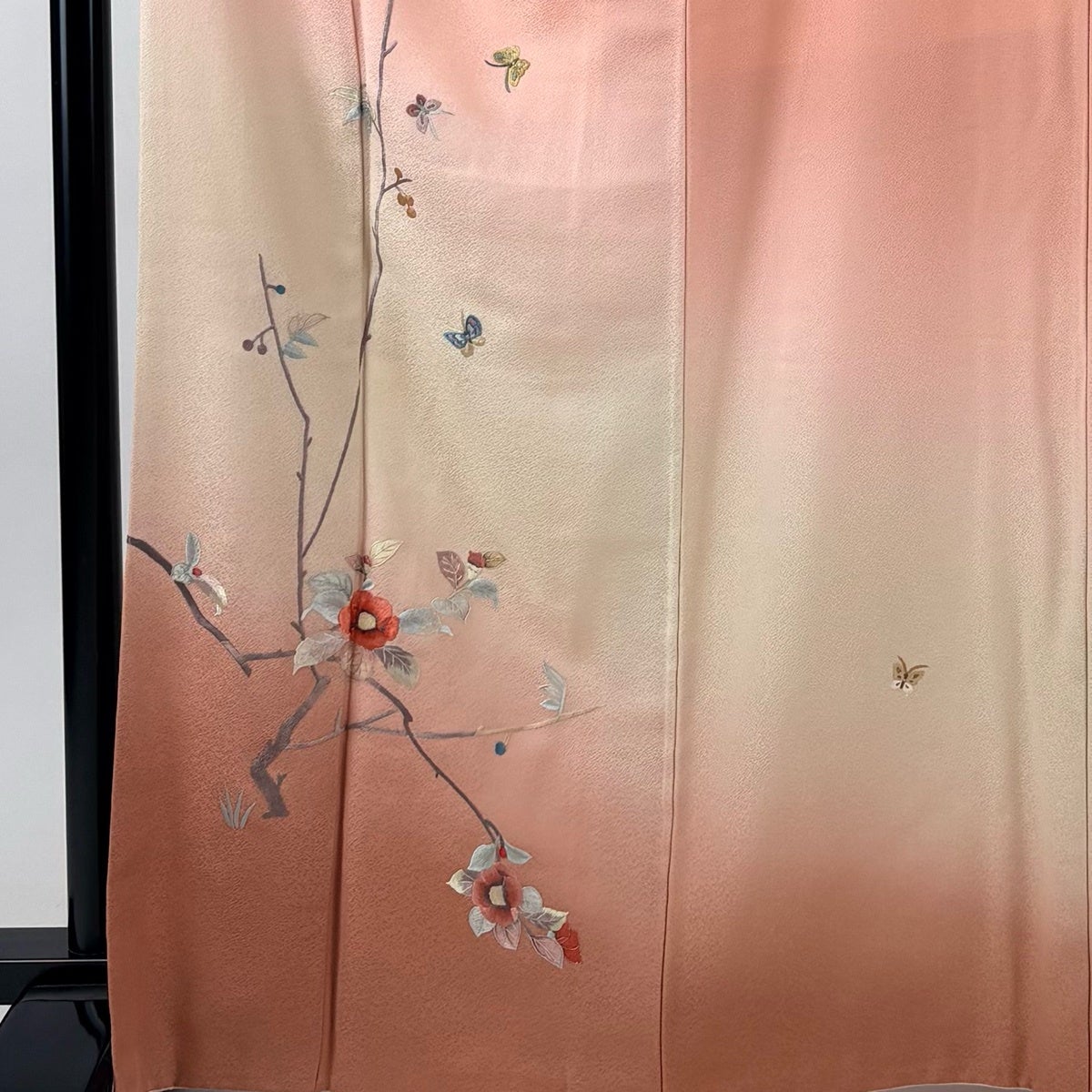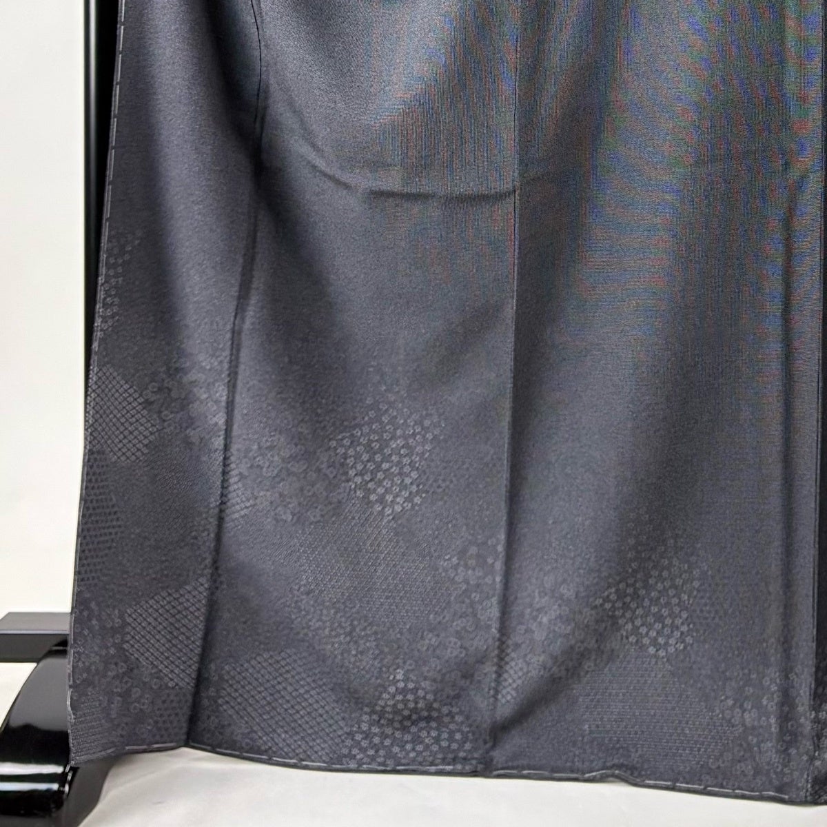付け下げは訪問着を簡略化した訪問着より格が低くで小紋より格の高いの着物です。 特徴としては仕立て方の違いから訪問着などの一度真っさらな反物を着物の形に仮仕立てした後に柄付けをする絵羽模様とは違い、反物の状態で着用した時に柄付けが全て上を向くように書く事により左右の身頃や肩から袖にかけての模様が繋がっていない事です。 付け下げの歴史は他の着物に比べ浅く、戦時下に華美な訪問着が禁止された事で生まれた着物で、その後訪問着に比べ比較的安価で、それでいて着用シーンも訪問着とほぼ変わらないため大変好評になり、付け下げ訪問着と呼ばれる華やかな柄付けのものも考案された事により普及していきました。