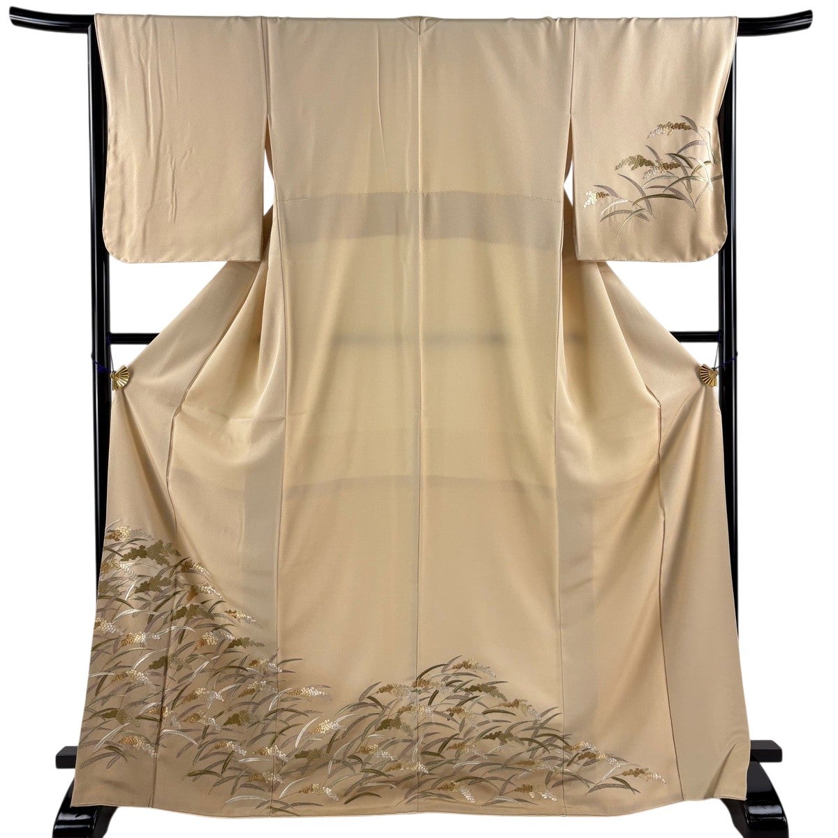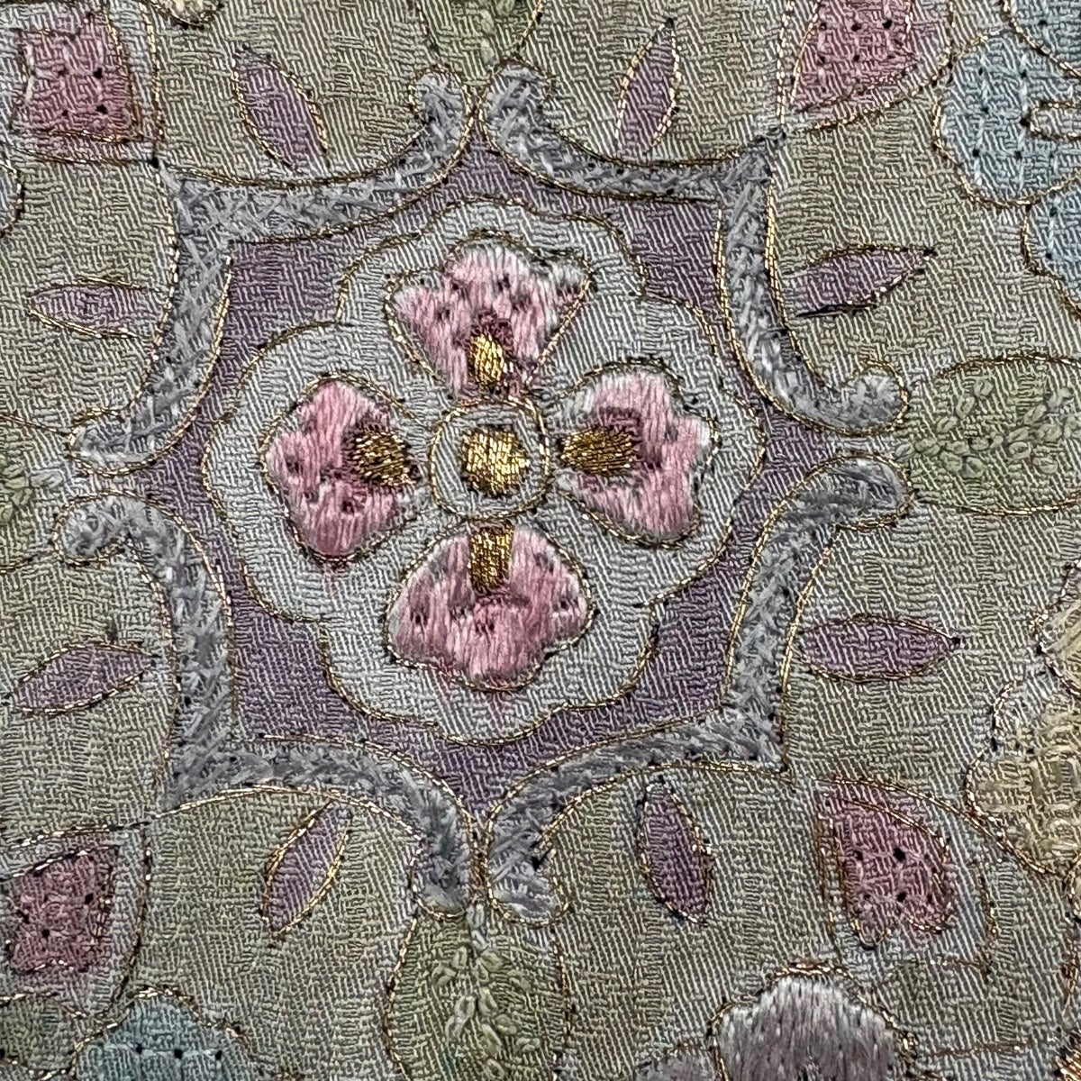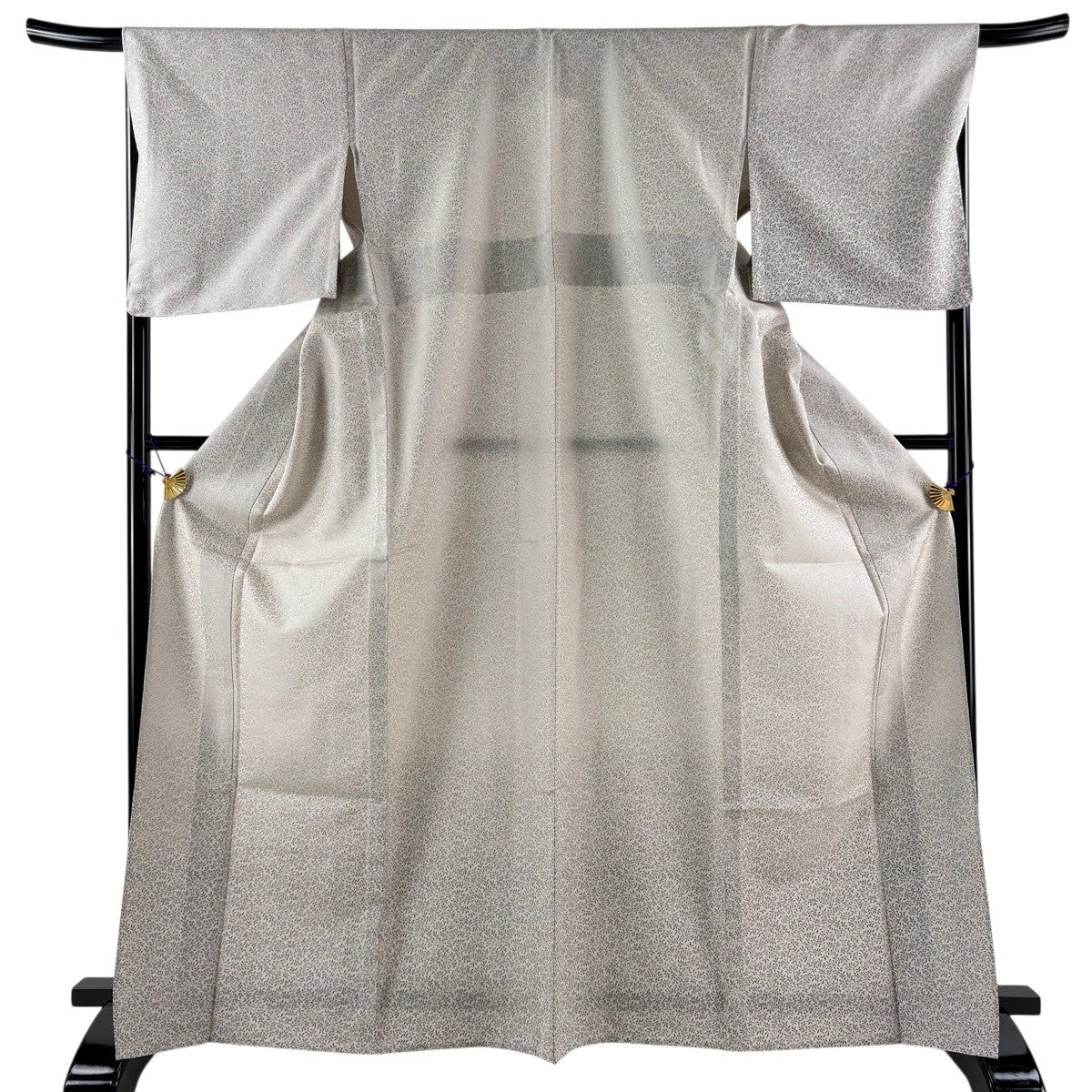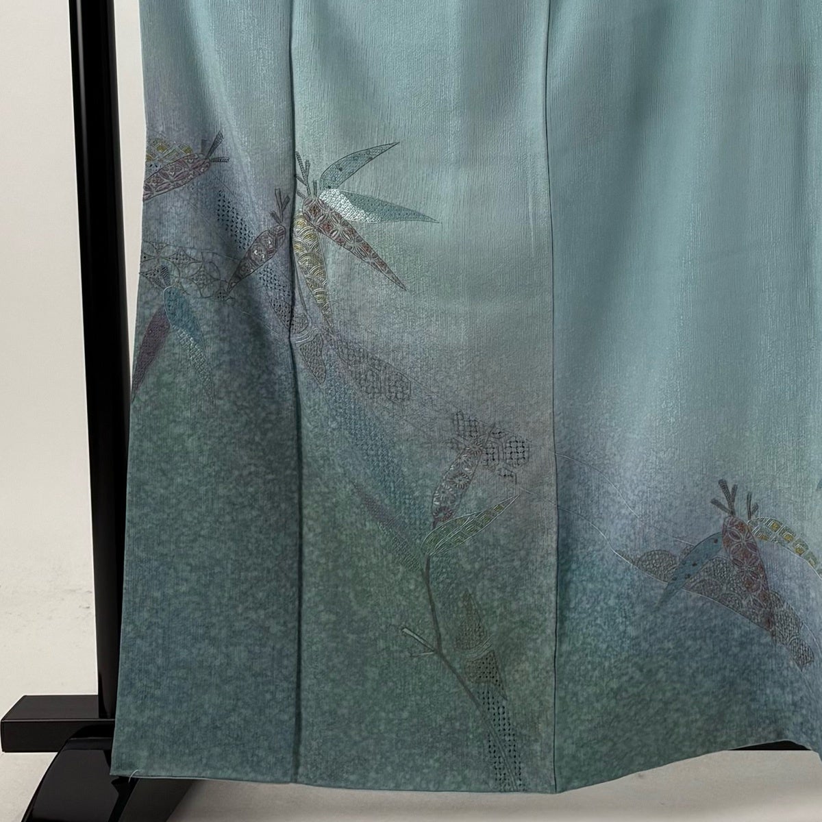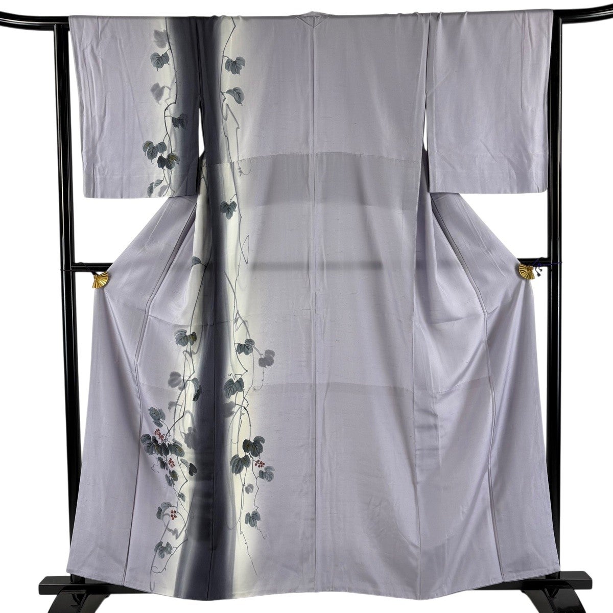 付け下げは訪問着を簡略化した訪問着より格が低くで小紋より格の高いの着物です。 特徴としては仕立て方の違いから訪問着などの一度真っさらな反物を着物の形に仮仕立てした後に柄付けをする絵羽模様とは違い、反物の状態で着用した時に柄付けが全て上を向くように書く事により左右の身頃や肩から袖にかけての模様が繋がっていない事です。 付け下げの歴史は他の着物に比べ浅く、戦時下に華美な訪問着が禁止された事で生まれた着物で、その後訪問着に比べ比較的安価で、それでいて着用シーンも訪問着とほぼ変わらないため大変好評になり、付け下げ訪問着と呼ばれる華やかな柄付けのものも考案された事により普及していきました。