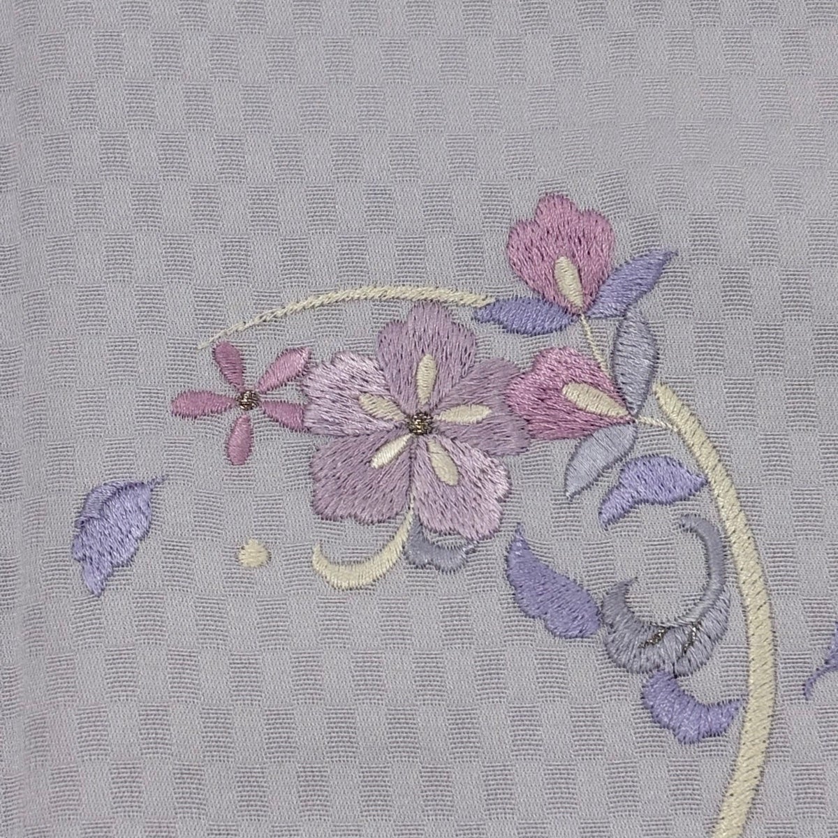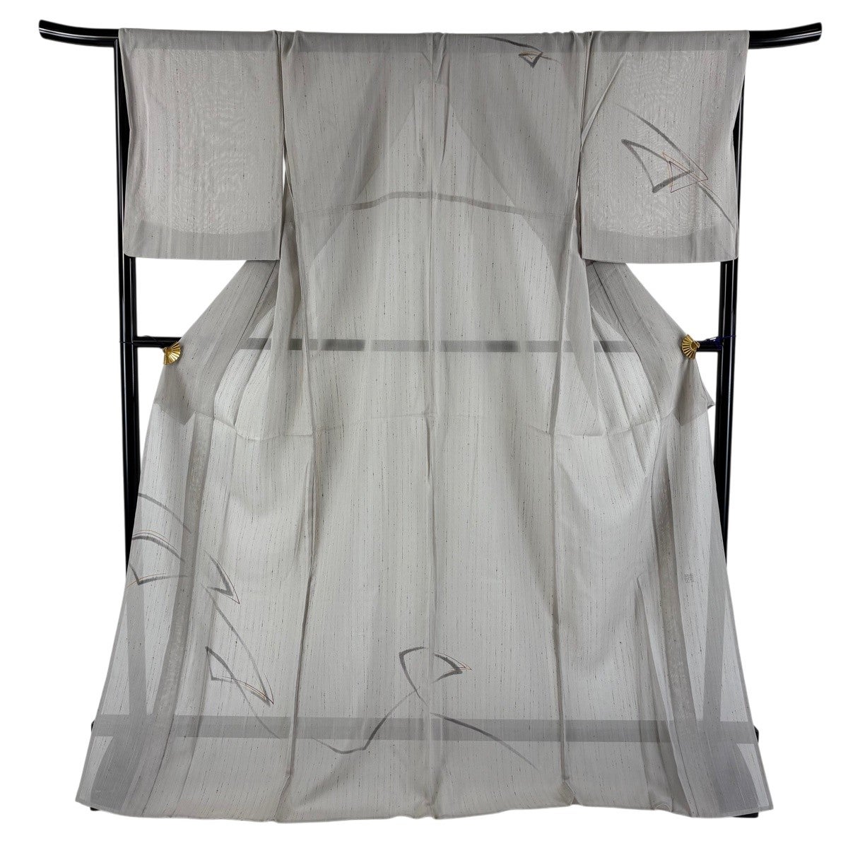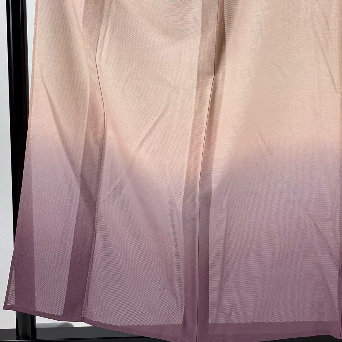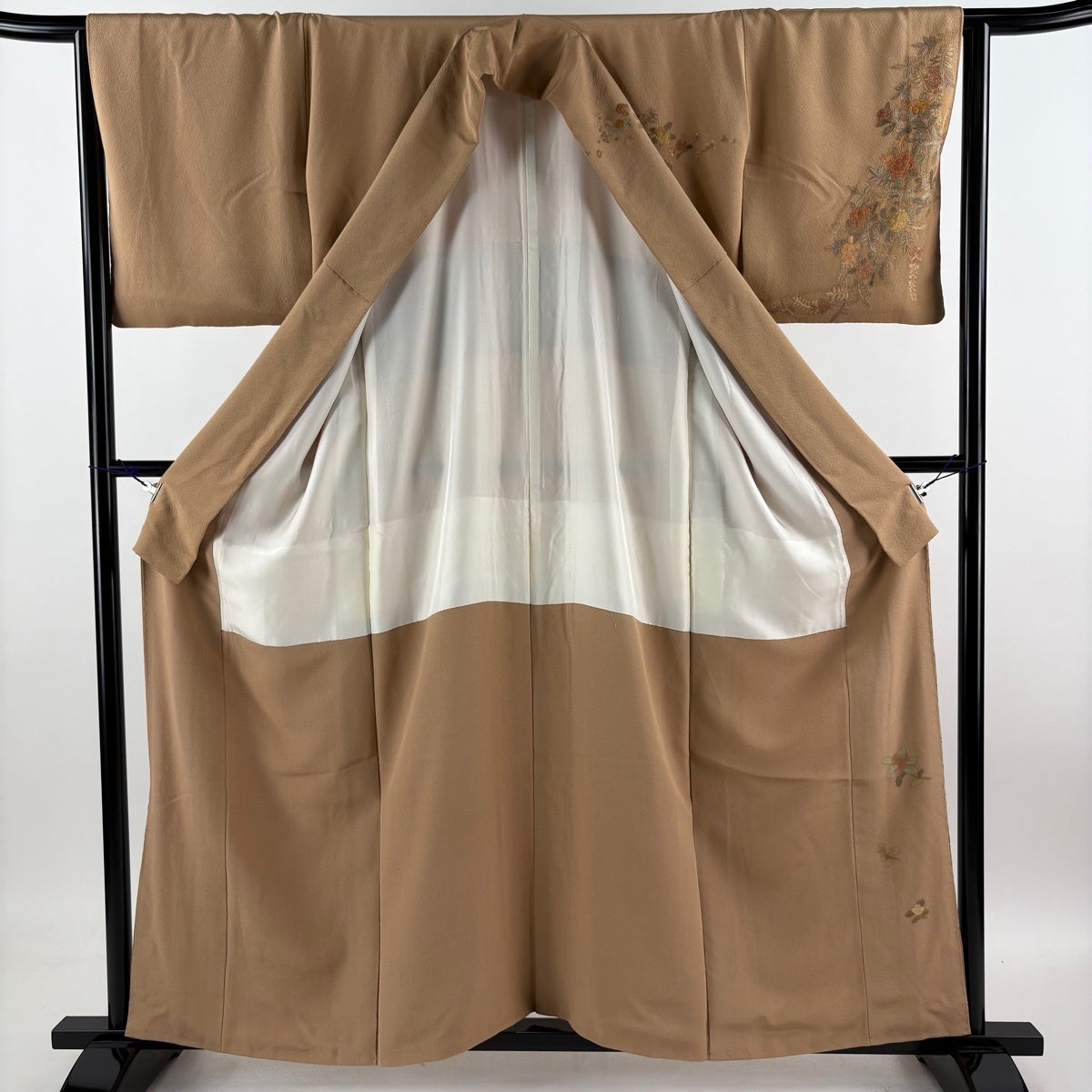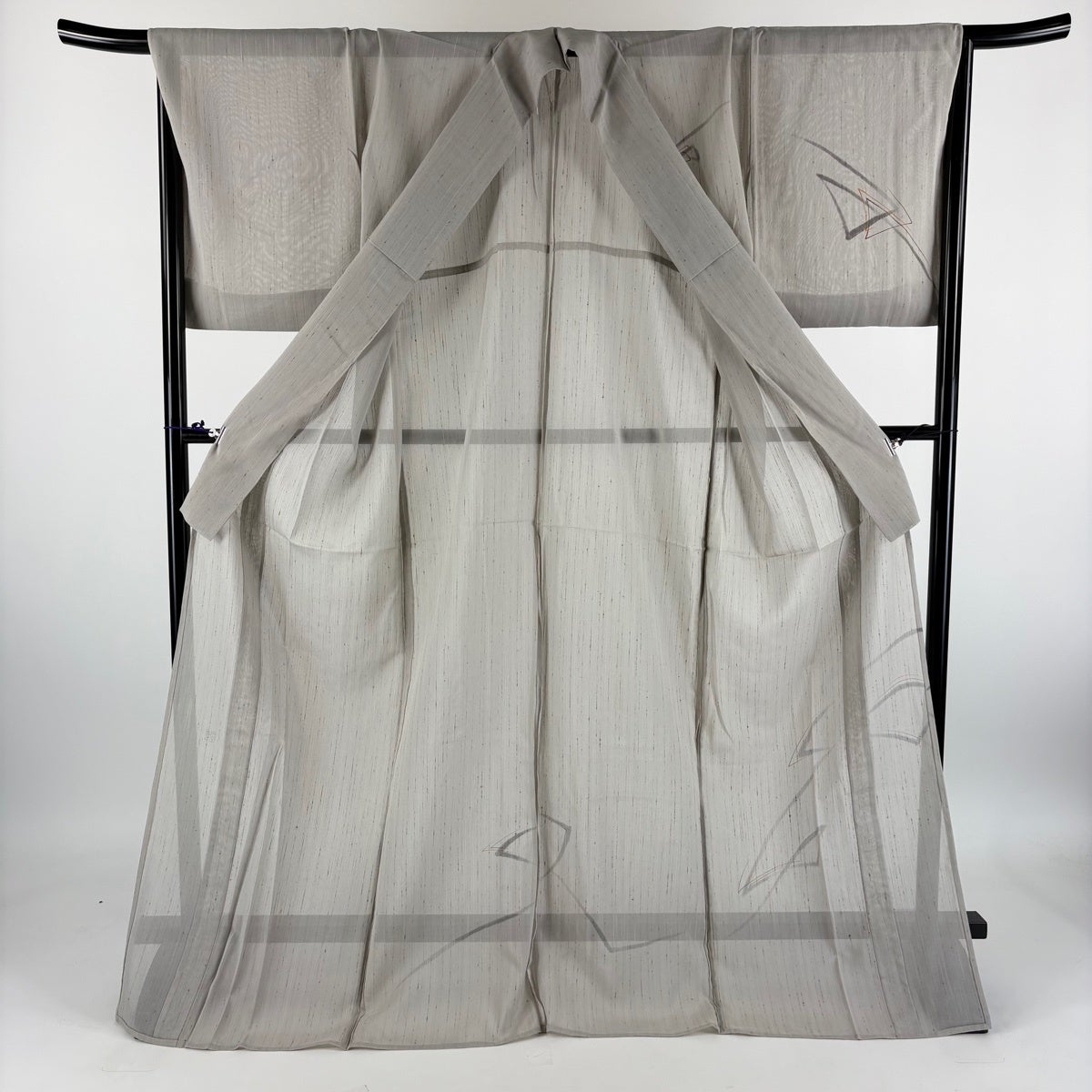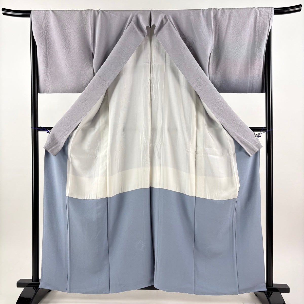 付け下げは訪問着を簡略化した訪問着より格が低くで小紋より格の高いの着物です。 特徴としては仕立て方の違いから訪問着などの一度真っさらな反物を着物の形に仮仕立てした後に柄付けをする絵羽模様とは違い、反物の状態で着用した時に柄付けが全て上を向くように書く事により左右の身頃や肩から袖にかけての模様が繋がっていない事です。 付け下げの歴史は他の着物に比べ浅く、戦時下に華美な訪問着が禁止された事で生まれた着物で、その後訪問着に比べ比較的安価で、それでいて着用シーンも訪問着とほぼ変わらないため大変好評になり、付け下げ訪問着と呼ばれる華やかな柄付けのものも考案された事により普及していきました。