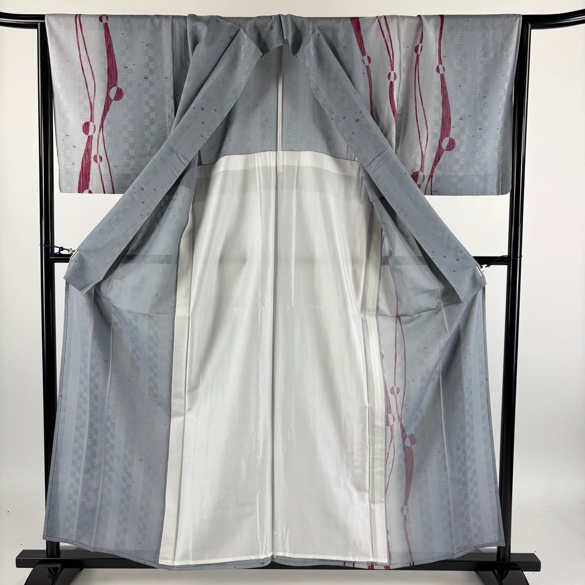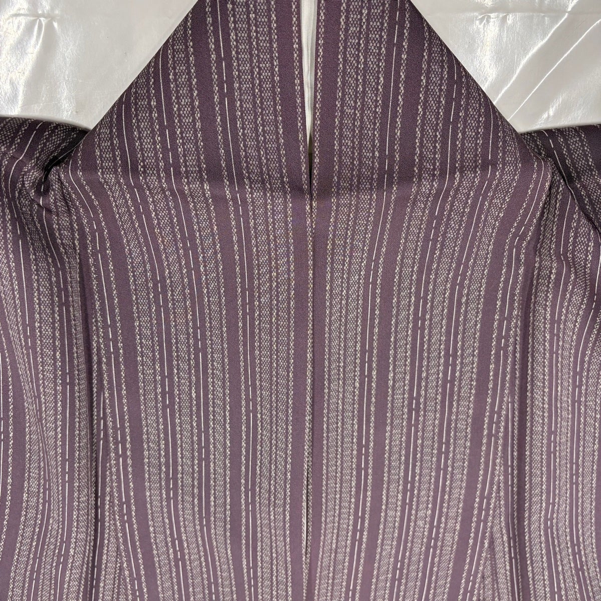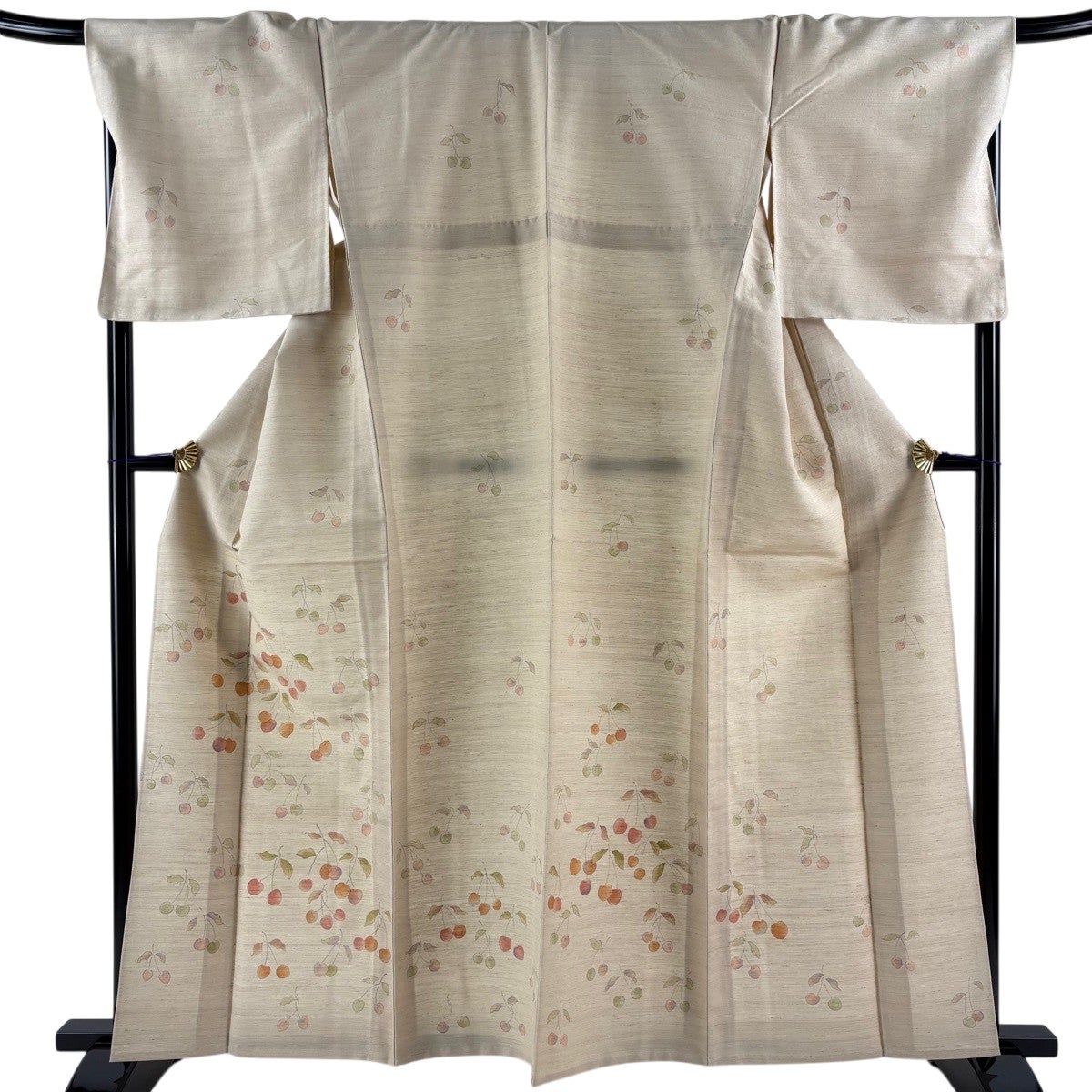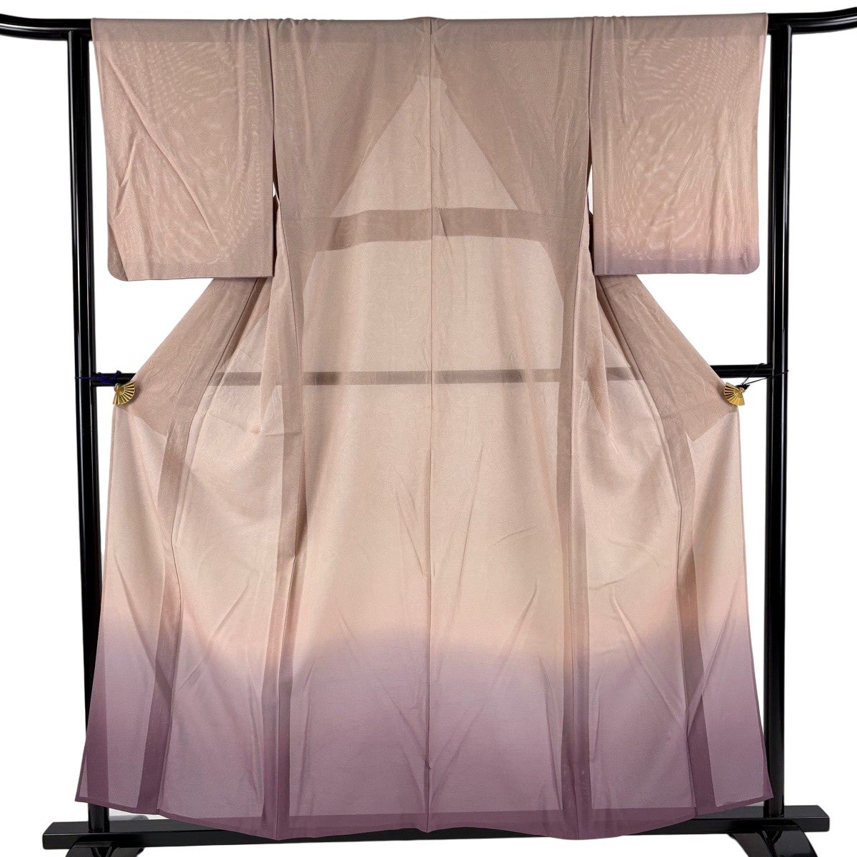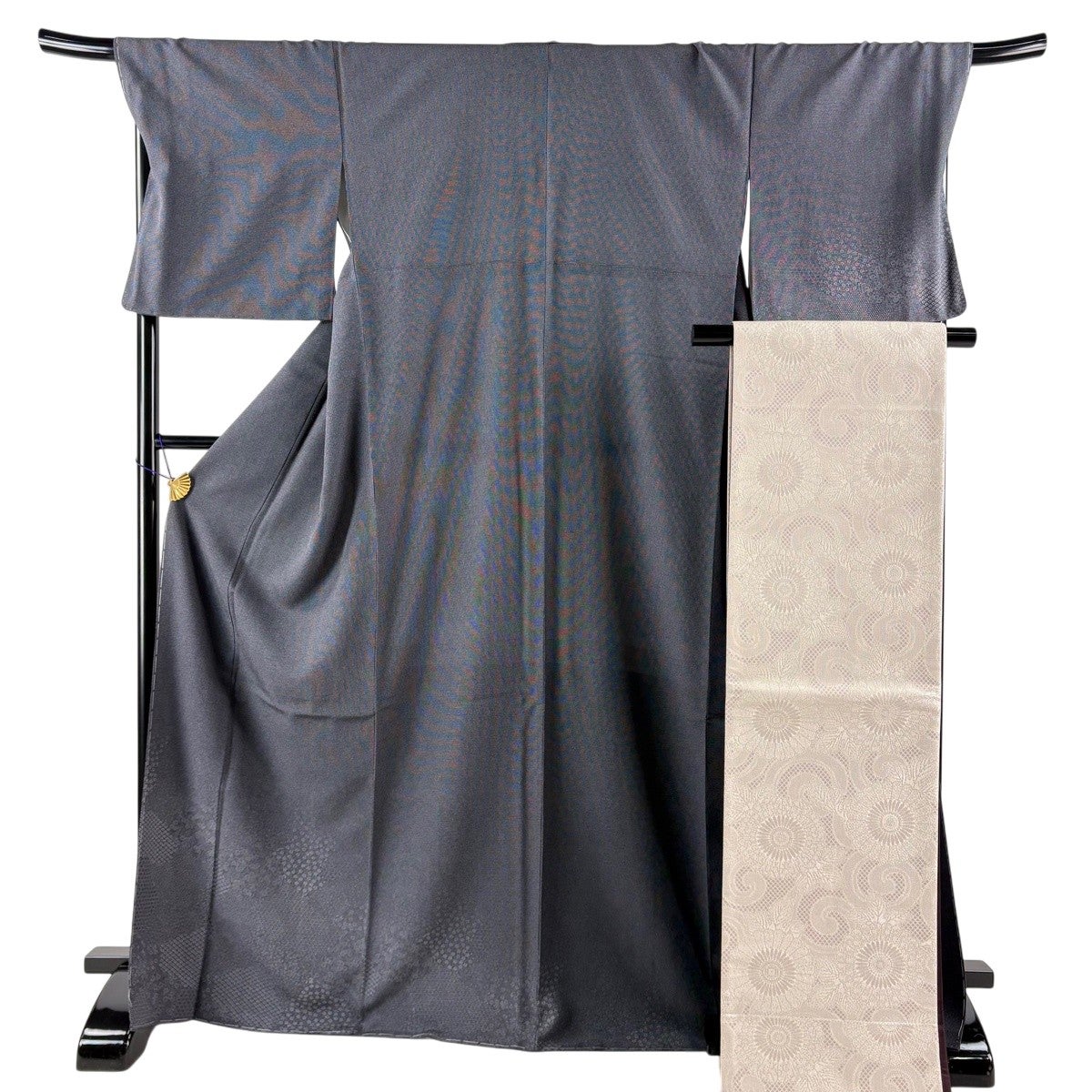 付け下げは訪問着を簡略化した訪問着より格が低くで小紋より格の高いの着物です。 特徴としては仕立て方の違いから訪問着などの一度真っさらな反物を着物の形に仮仕立てした後に柄付けをする絵羽模様とは違い、反物の状態で着用した時に柄付けが全て上を向くように書く事により左右の身頃や肩から袖にかけての模様が繋がっていない事です。 付け下げの歴史は他の着物に比べ浅く、戦時下に華美な訪問着が禁止された事で生まれた着物で、その後訪問着に比べ比較的安価で、それでいて着用シーンも訪問着とほぼ変わらないため大変好評になり、付け下げ訪問着と呼ばれる華やかな柄付けのものも考案された事により普及していきました。