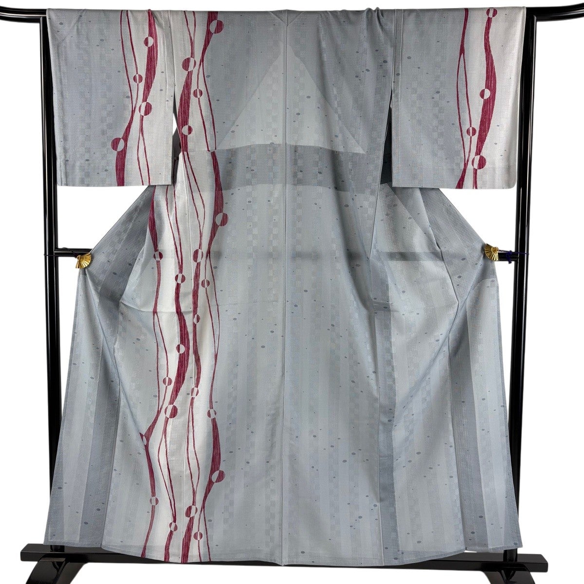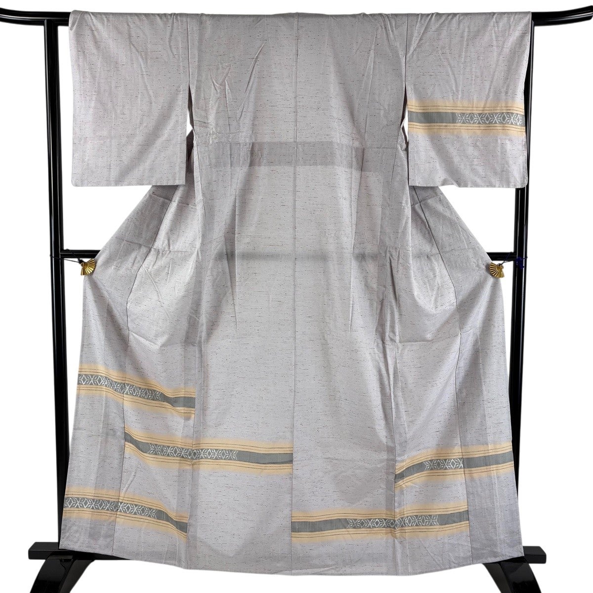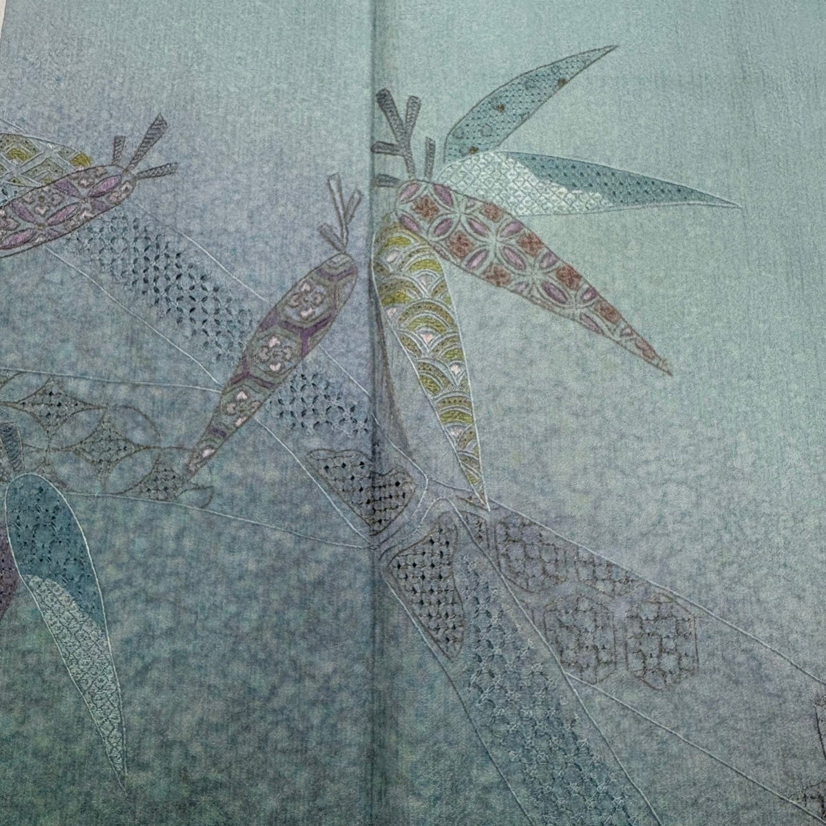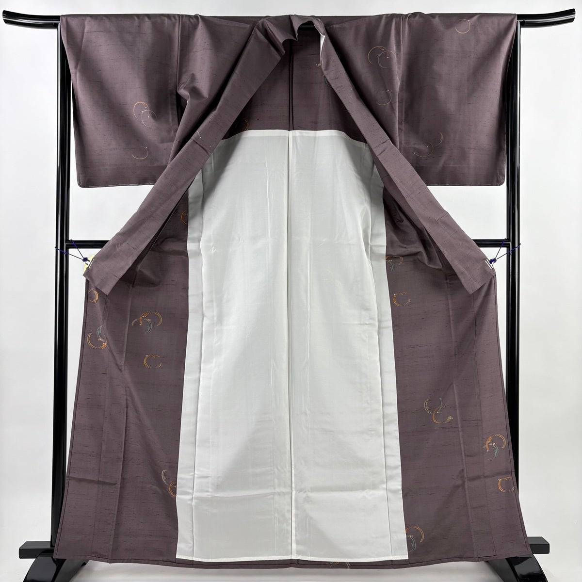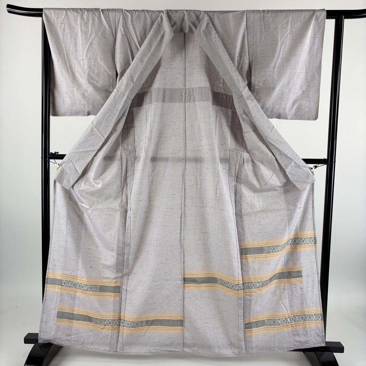 付け下げは訪問着を簡略化した訪問着より格が低くで小紋より格の高いの着物です。 特徴としては仕立て方の違いから訪問着などの一度真っさらな反物を着物の形に仮仕立てした後に柄付けをする絵羽模様とは違い、反物の状態で着用した時に柄付けが全て上を向くように書く事により左右の身頃や肩から袖にかけての模様が繋がっていない事です。 付け下げの歴史は他の着物に比べ浅く、戦時下に華美な訪問着が禁止された事で生まれた着物で、その後訪問着に比べ比較的安価で、それでいて着用シーンも訪問着とほぼ変わらないため大変好評になり、付け下げ訪問着と呼ばれる華やかな柄付けのものも考案された事により普及していきました。