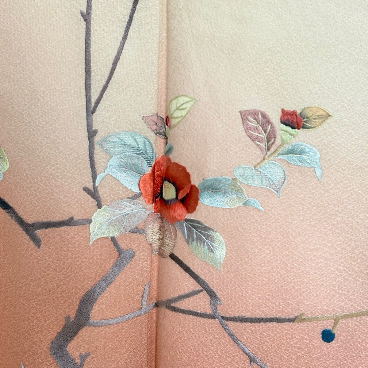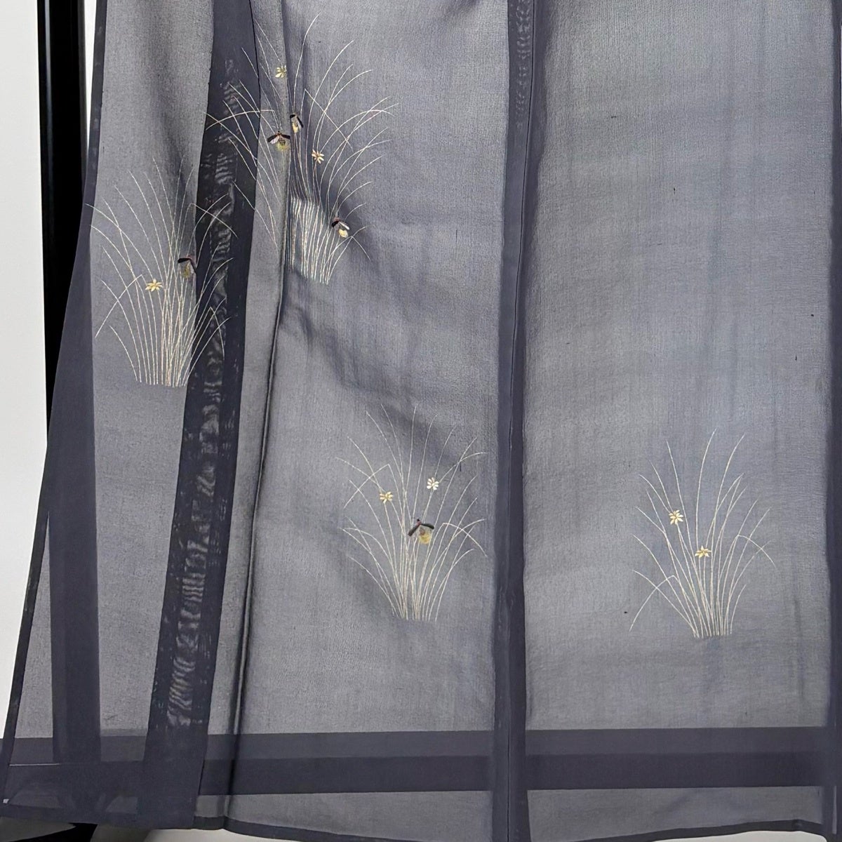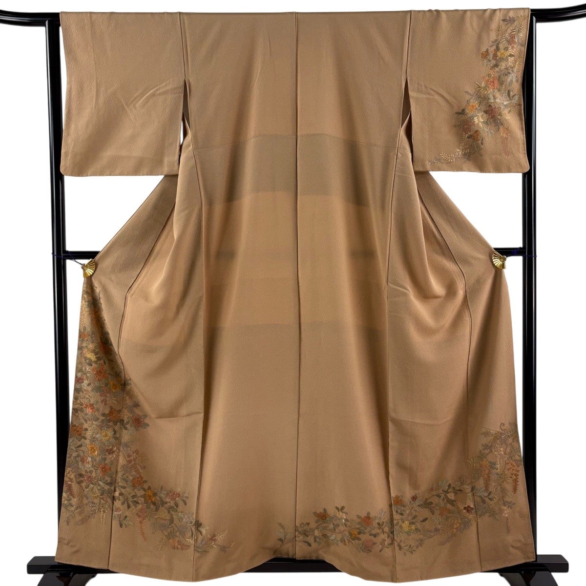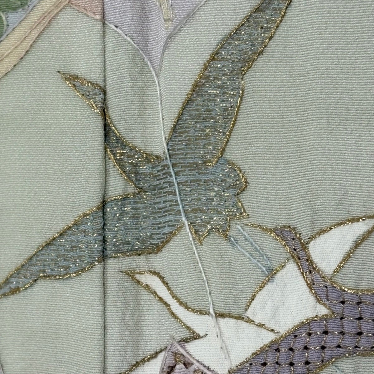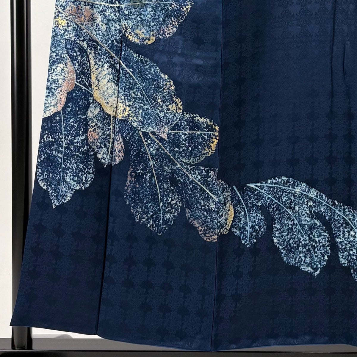 付け下げは訪問着を簡略化した訪問着より格が低くで小紋より格の高いの着物です。 特徴としては仕立て方の違いから訪問着などの一度真っさらな反物を着物の形に仮仕立てした後に柄付けをする絵羽模様とは違い、反物の状態で着用した時に柄付けが全て上を向くように書く事により左右の身頃や肩から袖にかけての模様が繋がっていない事です。 付け下げの歴史は他の着物に比べ浅く、戦時下に華美な訪問着が禁止された事で生まれた着物で、その後訪問着に比べ比較的安価で、それでいて着用シーンも訪問着とほぼ変わらないため大変好評になり、付け下げ訪問着と呼ばれる華やかな柄付けのものも考案された事により普及していきました。
