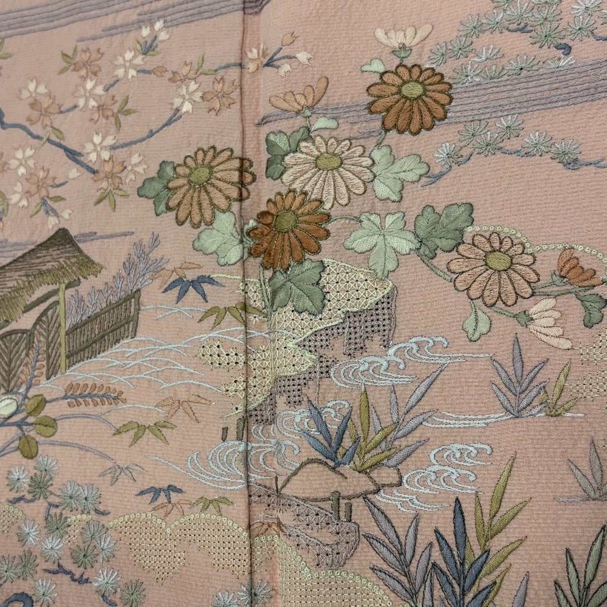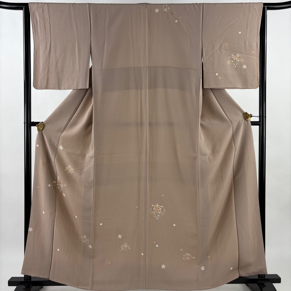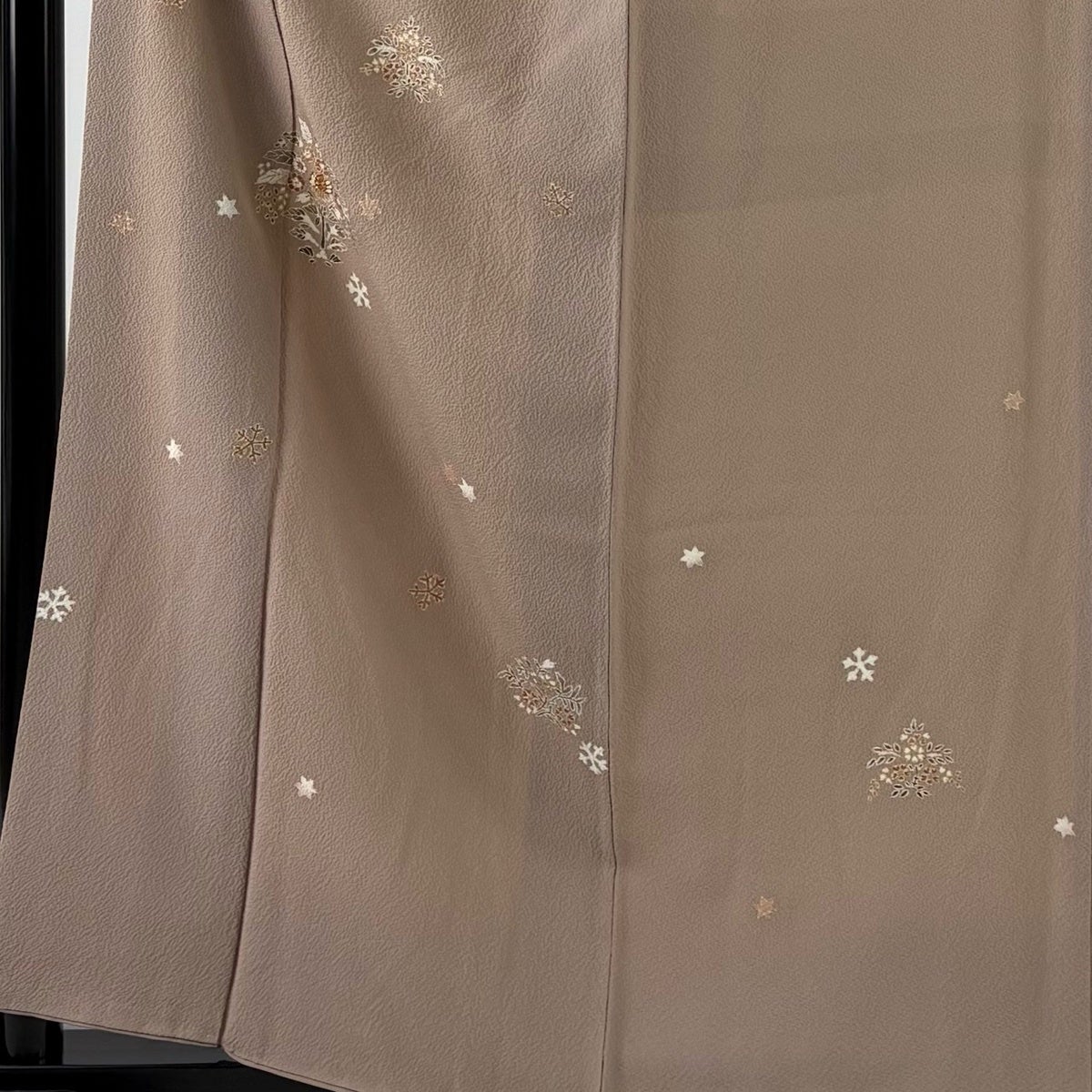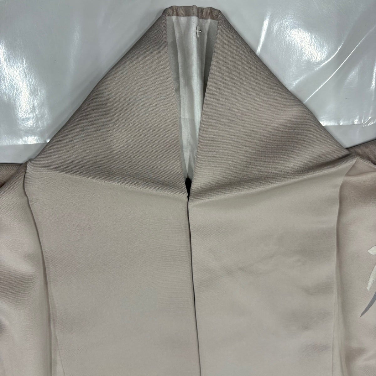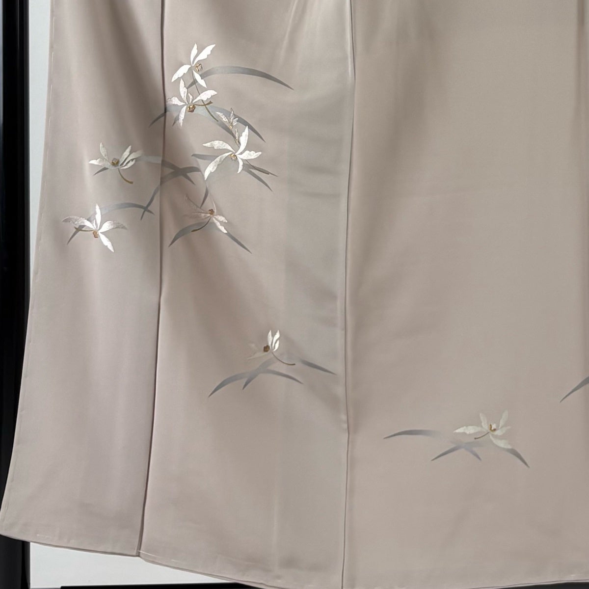 付け下げは訪問着を簡略化した訪問着より格が低くで小紋より格の高いの着物です。 特徴としては仕立て方の違いから訪問着などの一度真っさらな反物を着物の形に仮仕立てした後に柄付けをする絵羽模様とは違い、反物の状態で着用した時に柄付けが全て上を向くように書く事により左右の身頃や肩から袖にかけての模様が繋がっていない事です。 付け下げの歴史は他の着物に比べ浅く、戦時下に華美な訪問着が禁止された事で生まれた着物で、その後訪問着に比べ比較的安価で、それでいて着用シーンも訪問着とほぼ変わらないため大変好評になり、付け下げ訪問着と呼ばれる華やかな柄付けのものも考案された事により普及していきました。