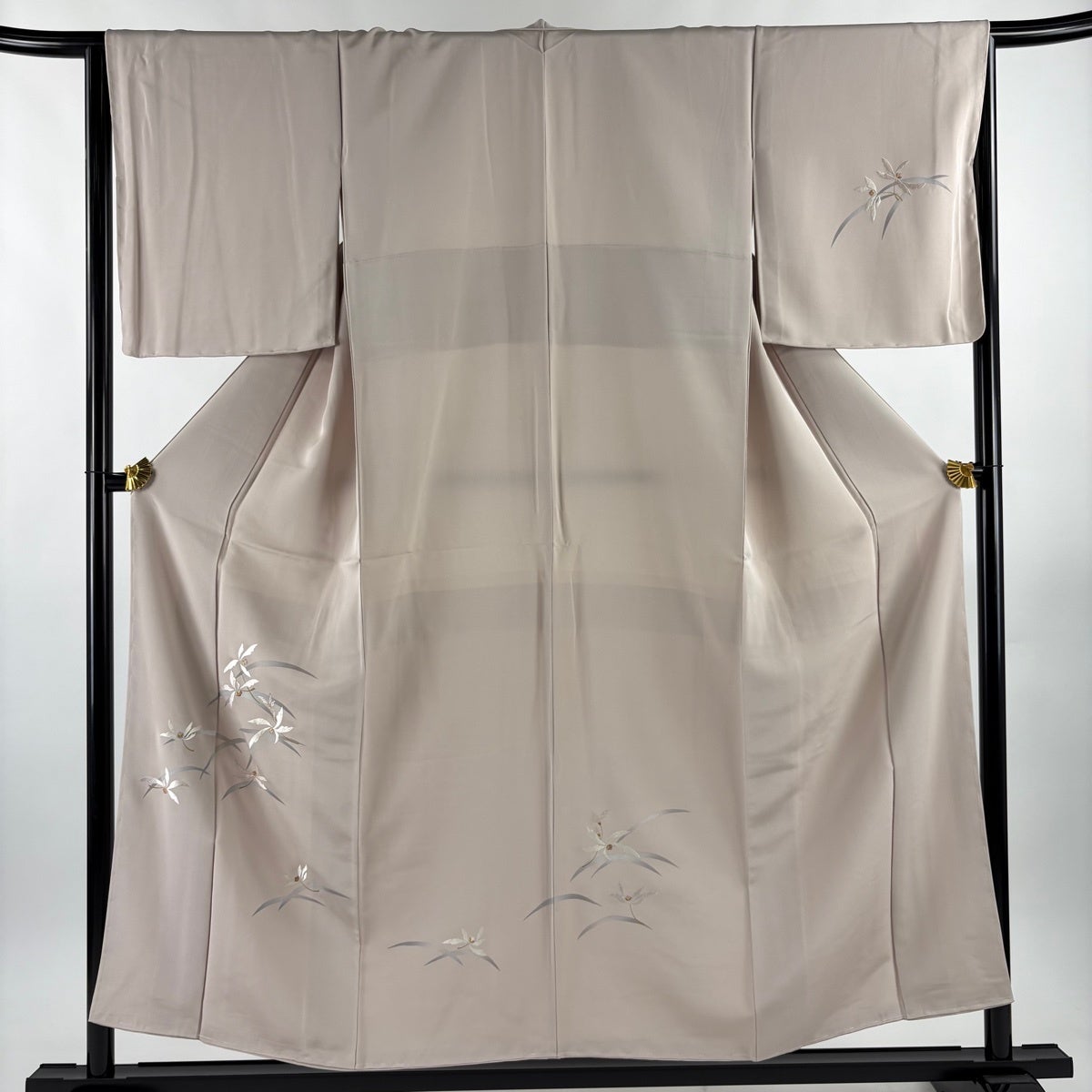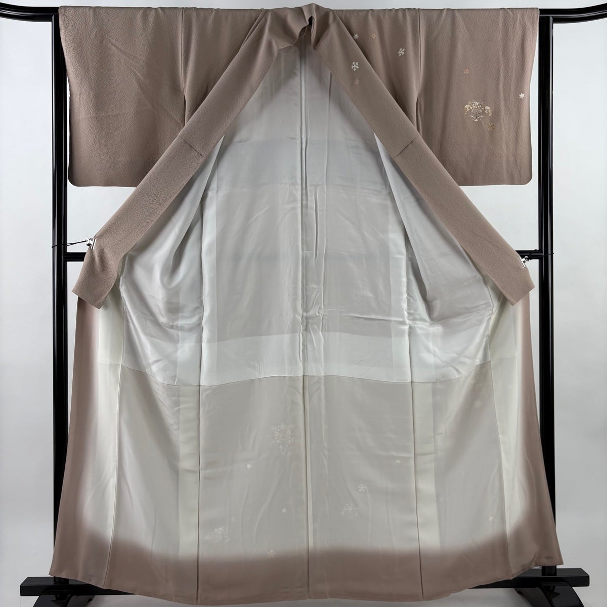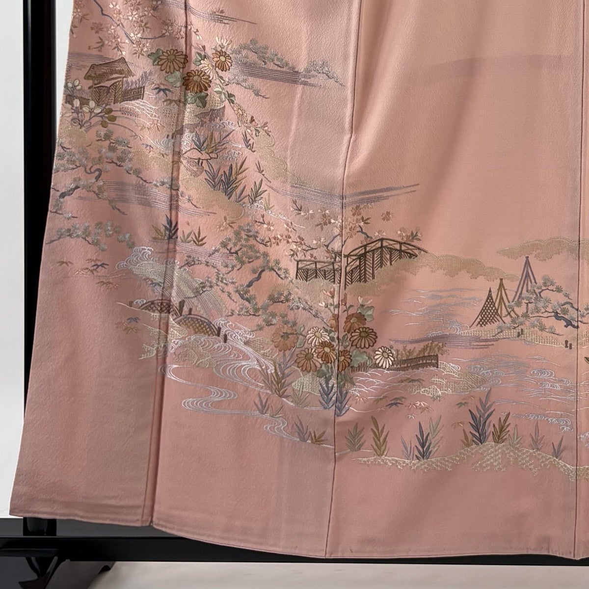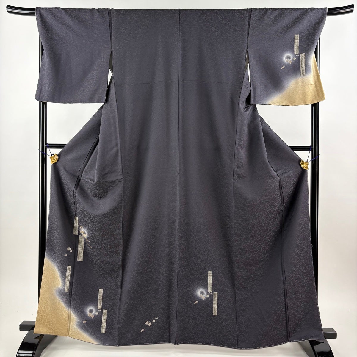 付け下げは訪問着を簡略化した訪問着より格が低くで小紋より格の高いの着物です。 特徴としては仕立て方の違いから訪問着などの一度真っさらな反物を着物の形に仮仕立てした後に柄付けをする絵羽模様とは違い、反物の状態で着用した時に柄付けが全て上を向くように書く事により左右の身頃や肩から袖にかけての模様が繋がっていない事です。 付け下げの歴史は他の着物に比べ浅く、戦時下に華美な訪問着が禁止された事で生まれた着物で、その後訪問着に比べ比較的安価で、それでいて着用シーンも訪問着とほぼ変わらないため大変好評になり、付け下げ訪問着と呼ばれる華やかな柄付けのものも考案された事により普及していきました。