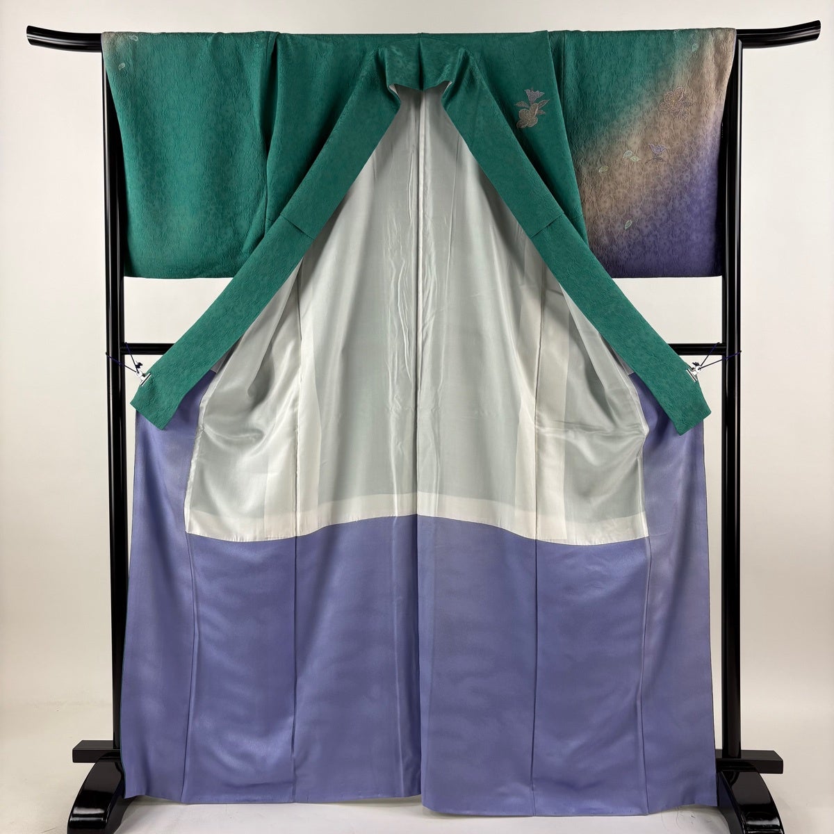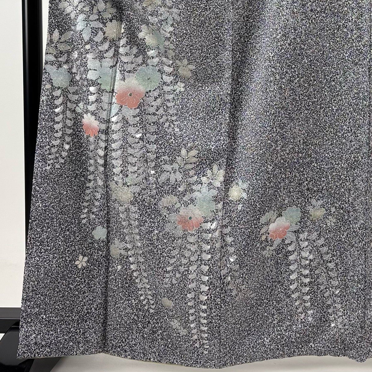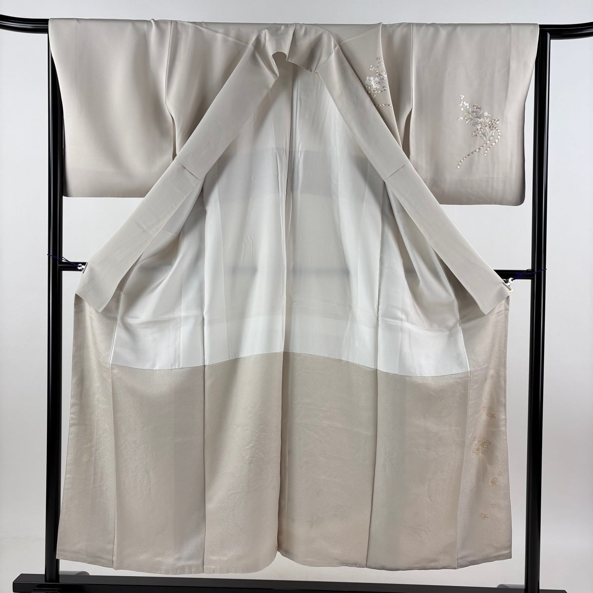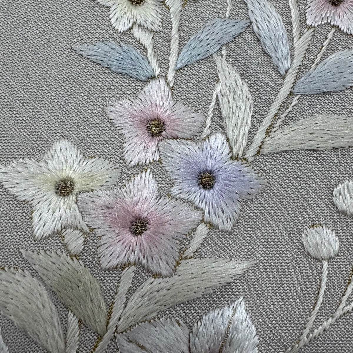 付け下げは訪問着を簡略化した訪問着より格が低くで小紋より格の高いの着物です。 特徴としては仕立て方の違いから訪問着などの一度真っさらな反物を着物の形に仮仕立てした後に柄付けをする絵羽模様とは違い、反物の状態で着用した時に柄付けが全て上を向くように書く事により左右の身頃や肩から袖にかけての模様が繋がっていない事です。 付け下げの歴史は他の着物に比べ浅く、戦時下に華美な訪問着が禁止された事で生まれた着物で、その後訪問着に比べ比較的安価で、それでいて着用シーンも訪問着とほぼ変わらないため大変好評になり、付け下げ訪問着と呼ばれる華やかな柄付けのものも考案された事により普及していきました。