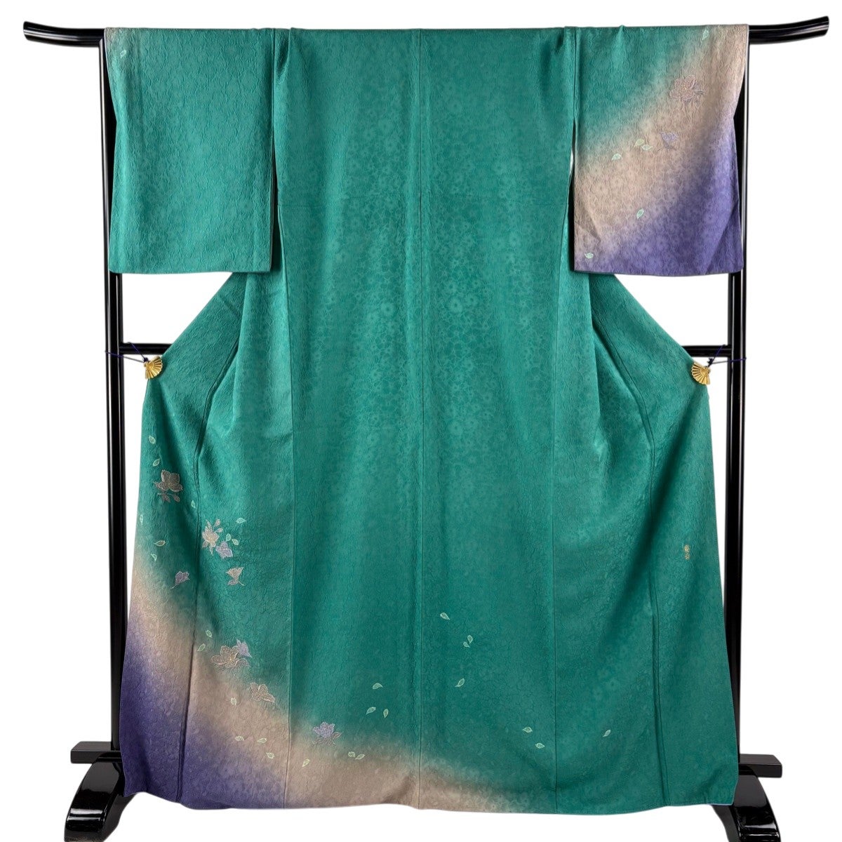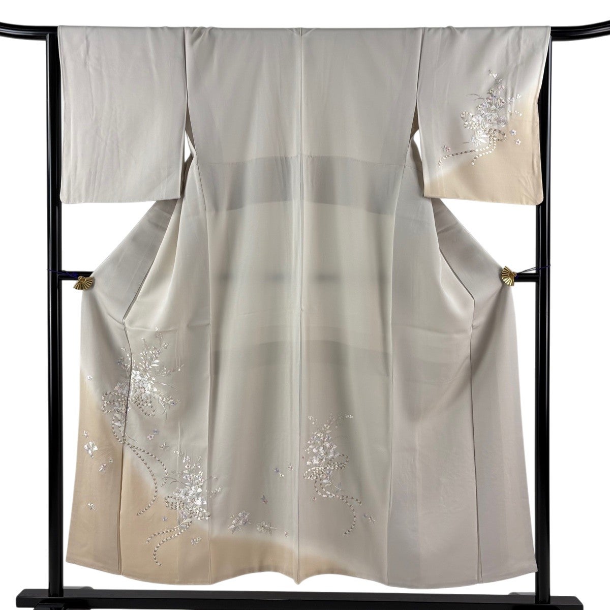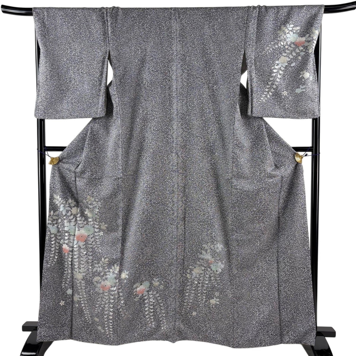 付け下げは訪問着を簡略化した訪問着より格が低くで小紋より格の高いの着物です。 特徴としては仕立て方の違いから訪問着などの一度真っさらな反物を着物の形に仮仕立てした後に柄付けをする絵羽模様とは違い、反物の状態で着用した時に柄付けが全て上を向くように書く事により左右の身頃や肩から袖にかけての模様が繋がっていない事です。 付け下げの歴史は他の着物に比べ浅く、戦時下に華美な訪問着が禁止された事で生まれた着物で、その後訪問着に比べ比較的安価で、それでいて着用シーンも訪問着とほぼ変わらないため大変好評になり、付け下げ訪問着と呼ばれる華やかな柄付けのものも考案された事により普及していきました。