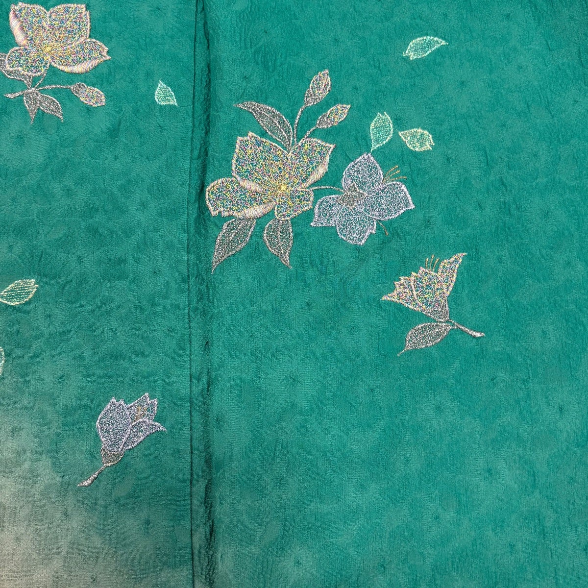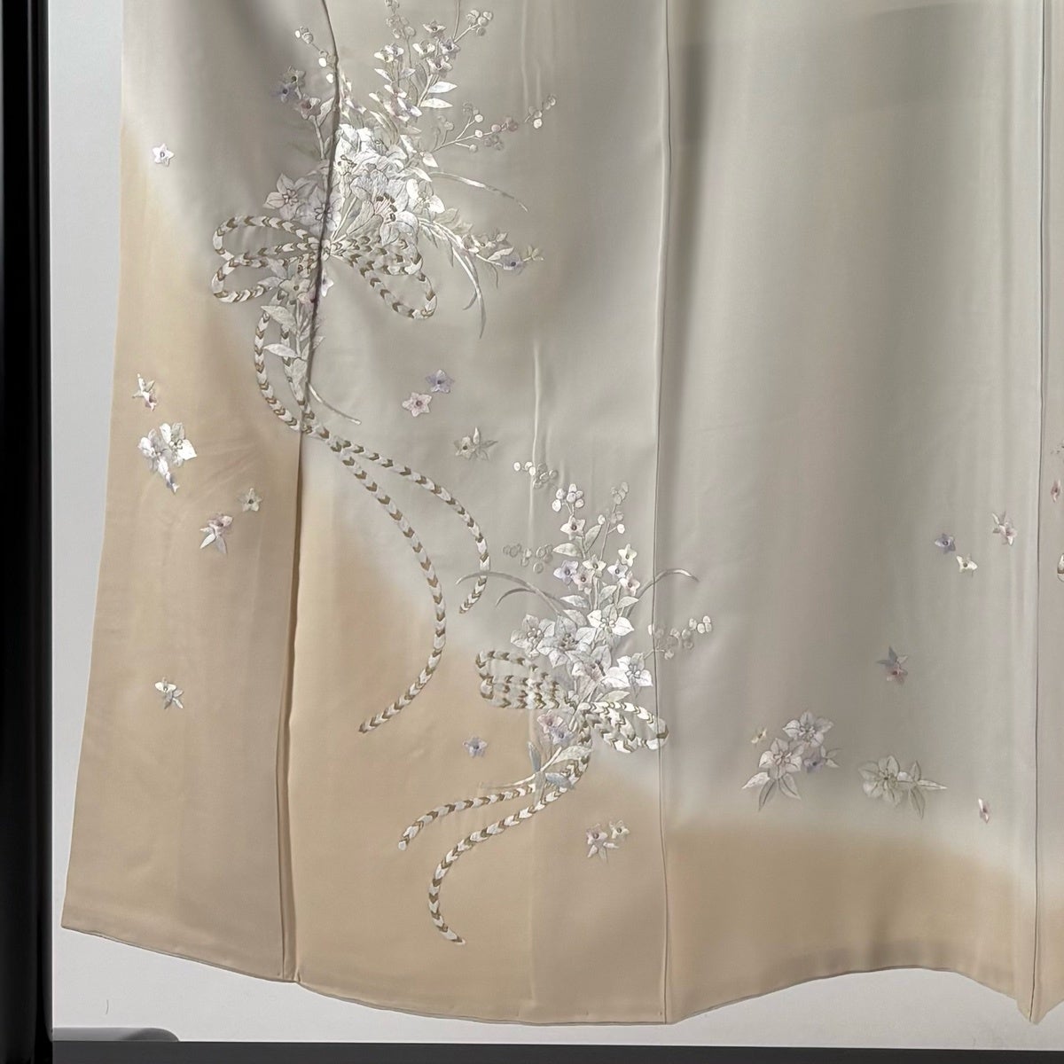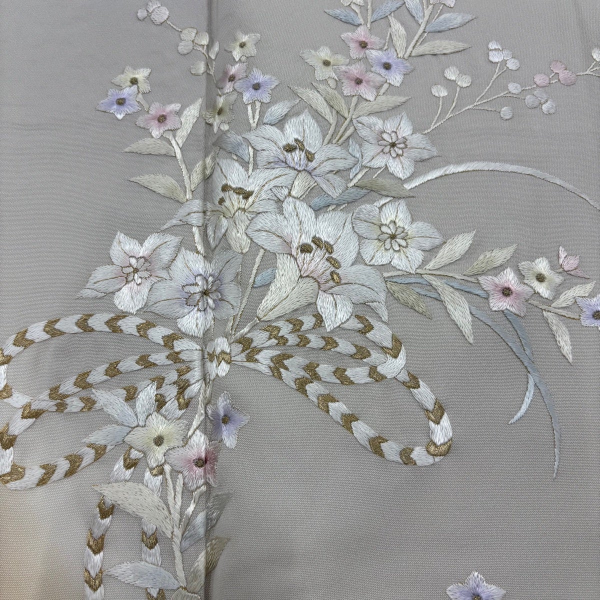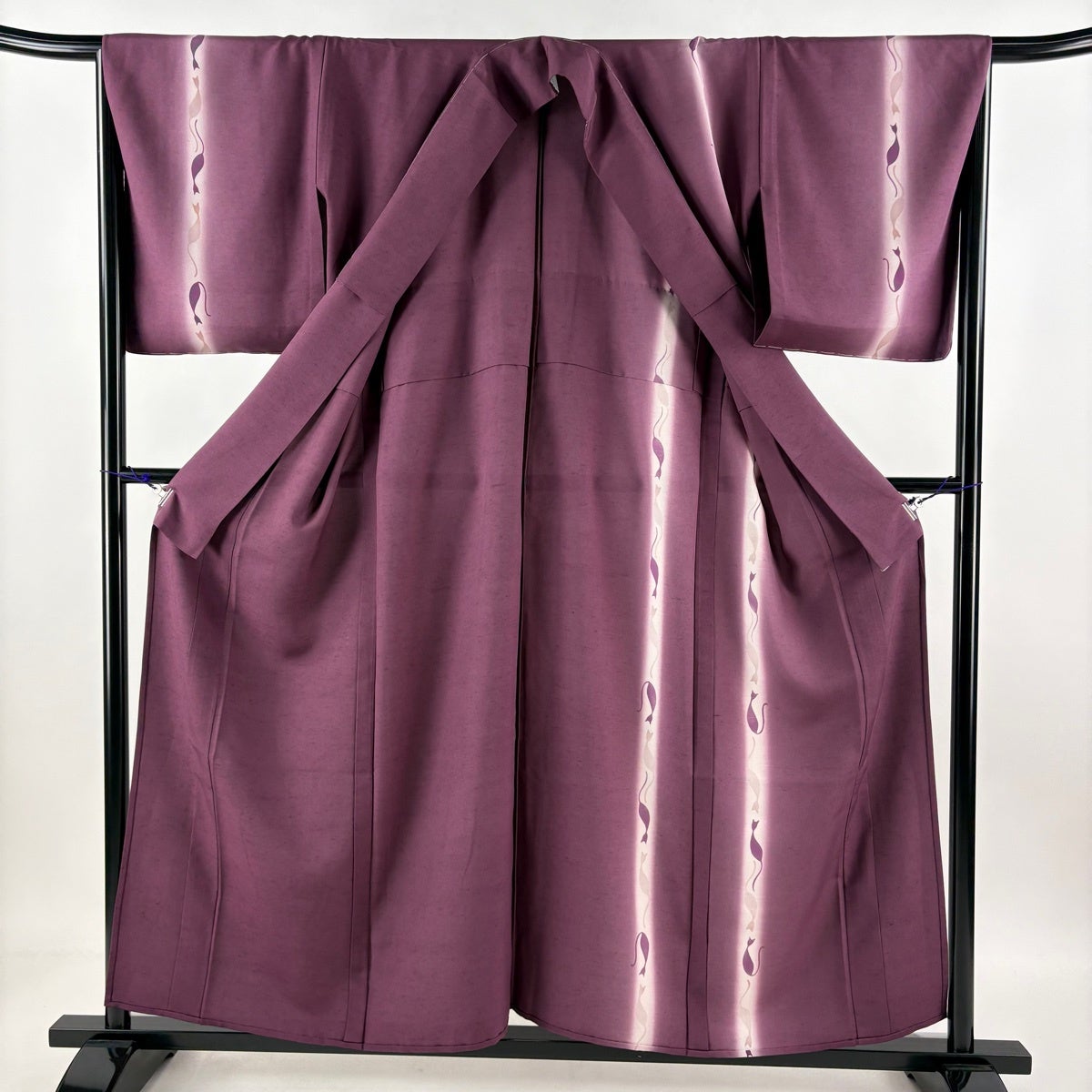 付け下げは訪問着を簡略化した訪問着より格が低くで小紋より格の高いの着物です。 特徴としては仕立て方の違いから訪問着などの一度真っさらな反物を着物の形に仮仕立てした後に柄付けをする絵羽模様とは違い、反物の状態で着用した時に柄付けが全て上を向くように書く事により左右の身頃や肩から袖にかけての模様が繋がっていない事です。 付け下げの歴史は他の着物に比べ浅く、戦時下に華美な訪問着が禁止された事で生まれた着物で、その後訪問着に比べ比較的安価で、それでいて着用シーンも訪問着とほぼ変わらないため大変好評になり、付け下げ訪問着と呼ばれる華やかな柄付けのものも考案された事により普及していきました。