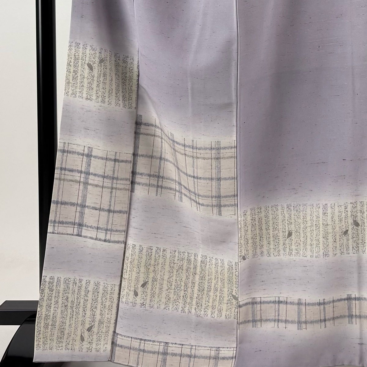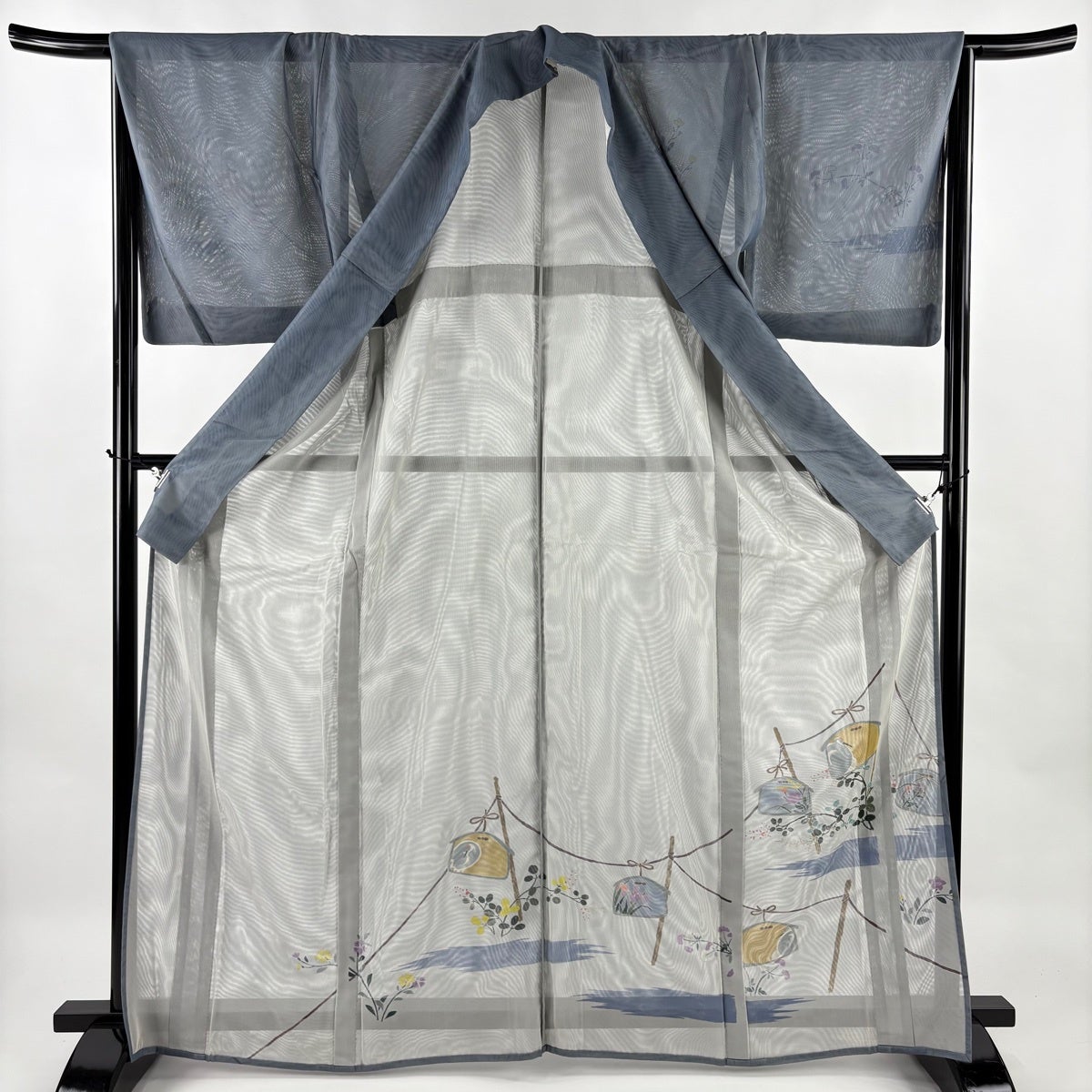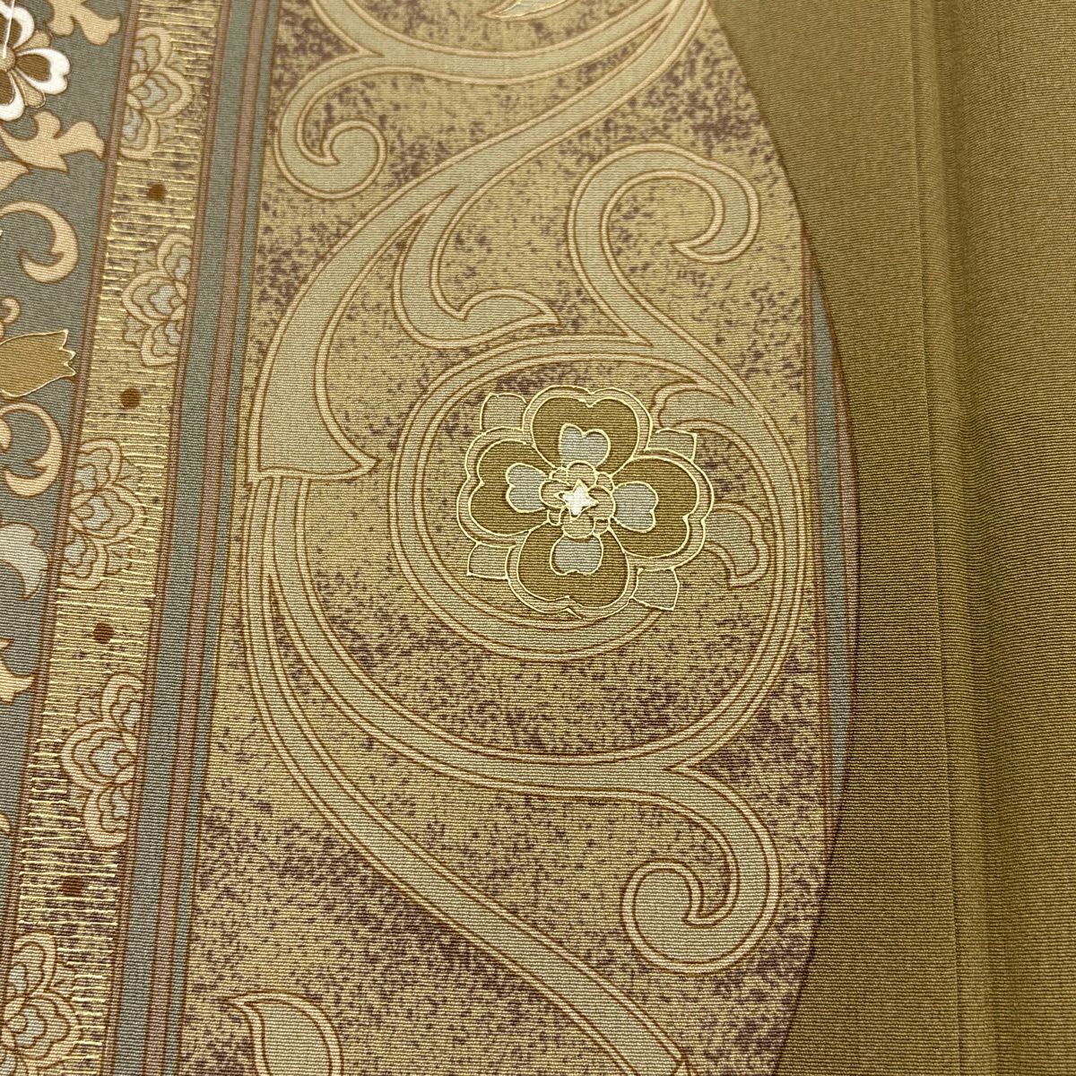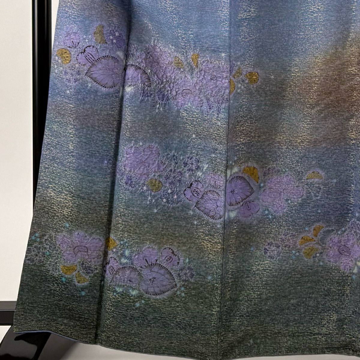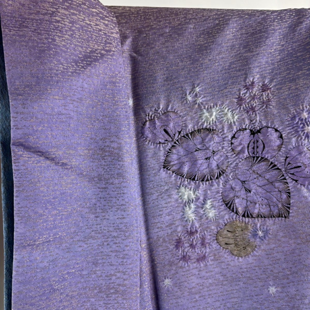 付け下げは訪問着を簡略化した訪問着より格が低くで小紋より格の高いの着物です。 特徴としては仕立て方の違いから訪問着などの一度真っさらな反物を着物の形に仮仕立てした後に柄付けをする絵羽模様とは違い、反物の状態で着用した時に柄付けが全て上を向くように書く事により左右の身頃や肩から袖にかけての模様が繋がっていない事です。 付け下げの歴史は他の着物に比べ浅く、戦時下に華美な訪問着が禁止された事で生まれた着物で、その後訪問着に比べ比較的安価で、それでいて着用シーンも訪問着とほぼ変わらないため大変好評になり、付け下げ訪問着と呼ばれる華やかな柄付けのものも考案された事により普及していきました。