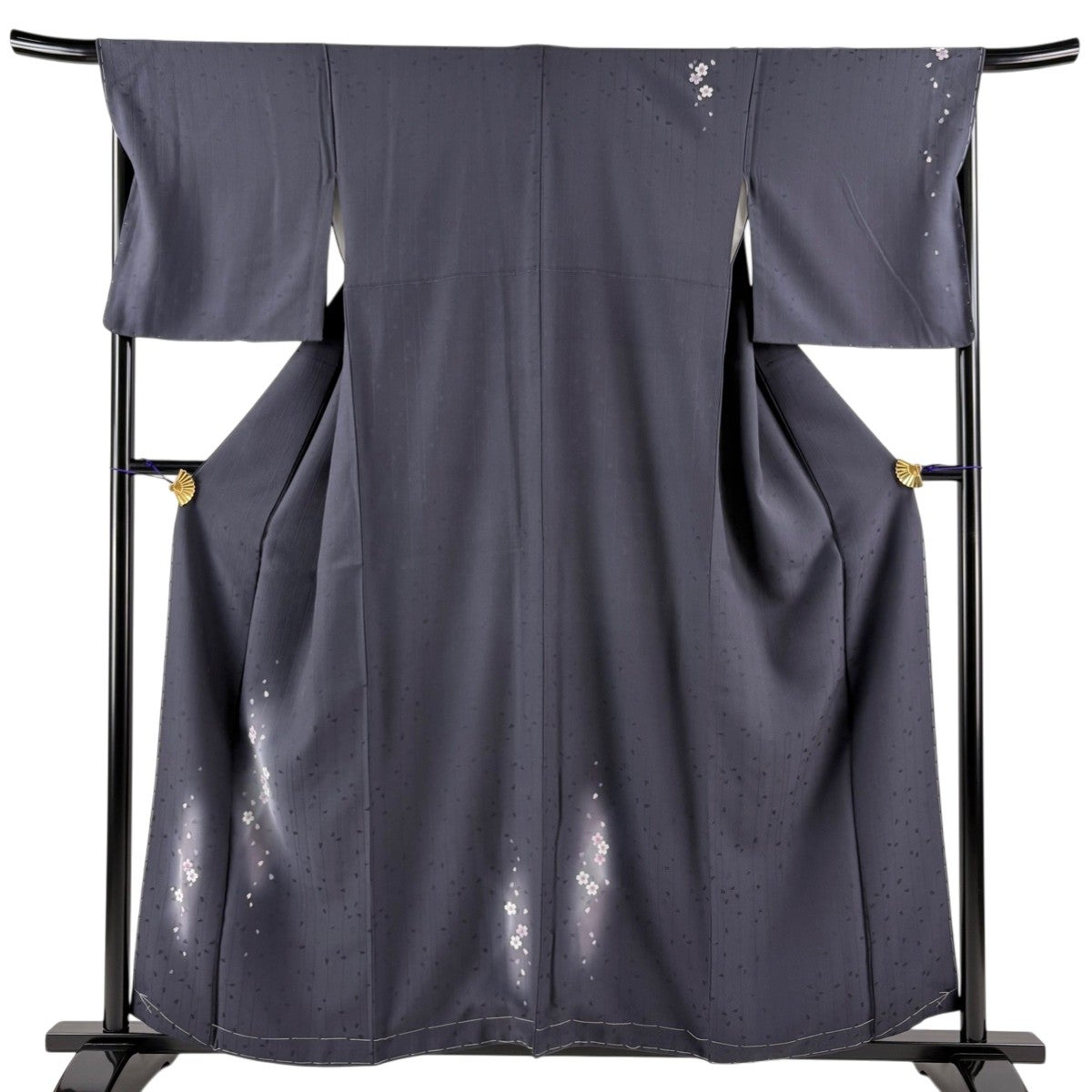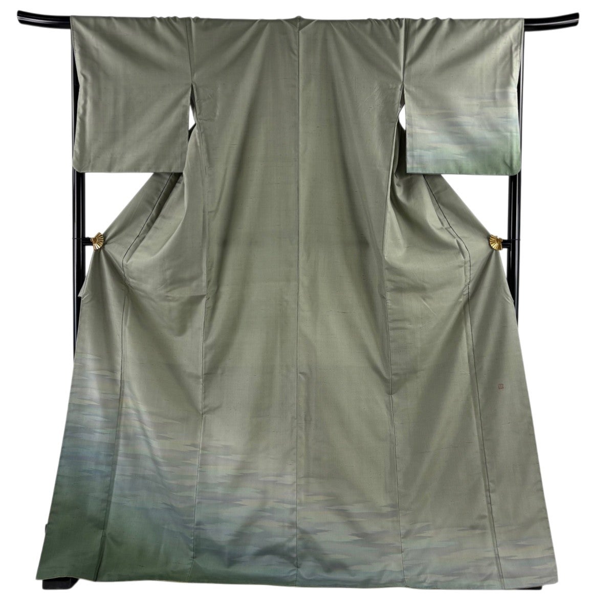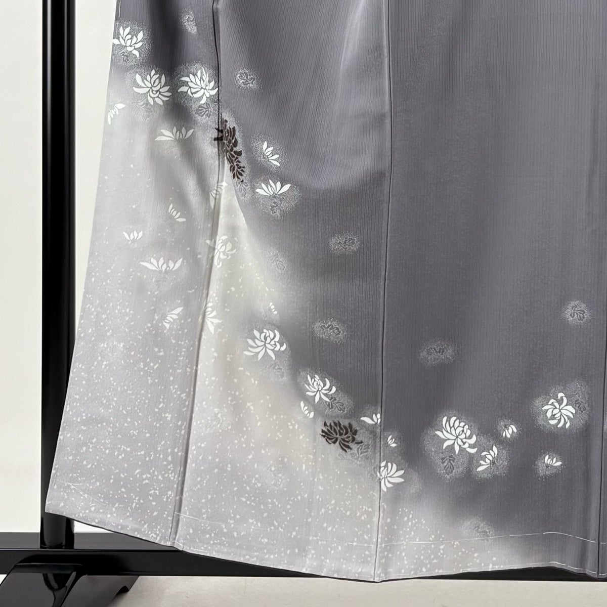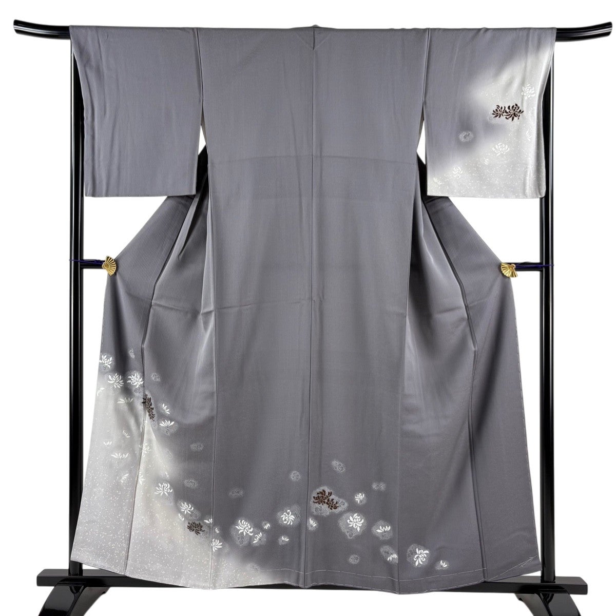 付け下げは訪問着を簡略化した訪問着より格が低くで小紋より格の高いの着物です。 特徴としては仕立て方の違いから訪問着などの一度真っさらな反物を着物の形に仮仕立てした後に柄付けをする絵羽模様とは違い、反物の状態で着用した時に柄付けが全て上を向くように書く事により左右の身頃や肩から袖にかけての模様が繋がっていない事です。 付け下げの歴史は他の着物に比べ浅く、戦時下に華美な訪問着が禁止された事で生まれた着物で、その後訪問着に比べ比較的安価で、それでいて着用シーンも訪問着とほぼ変わらないため大変好評になり、付け下げ訪問着と呼ばれる華やかな柄付けのものも考案された事により普及していきました。