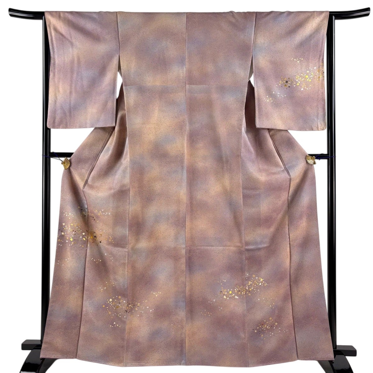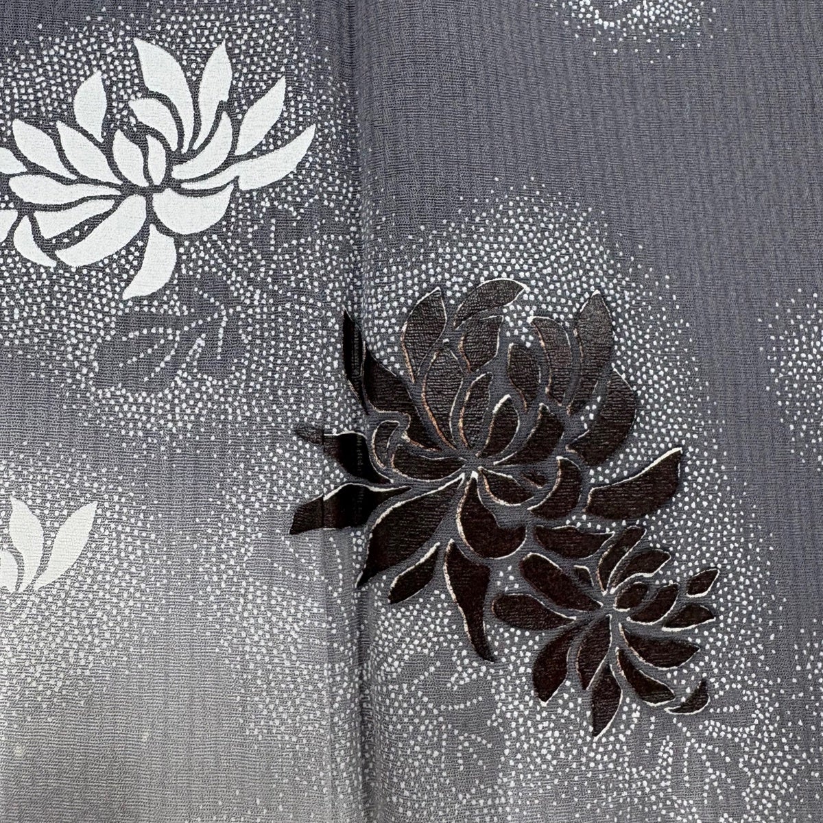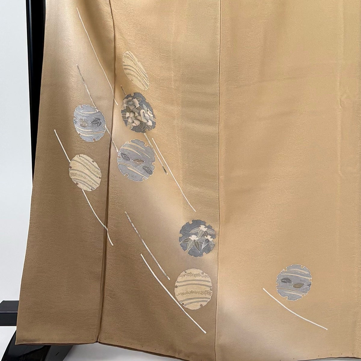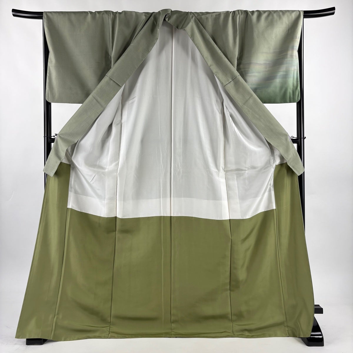 付け下げは訪問着を簡略化した訪問着より格が低くで小紋より格の高いの着物です。 特徴としては仕立て方の違いから訪問着などの一度真っさらな反物を着物の形に仮仕立てした後に柄付けをする絵羽模様とは違い、反物の状態で着用した時に柄付けが全て上を向くように書く事により左右の身頃や肩から袖にかけての模様が繋がっていない事です。 付け下げの歴史は他の着物に比べ浅く、戦時下に華美な訪問着が禁止された事で生まれた着物で、その後訪問着に比べ比較的安価で、それでいて着用シーンも訪問着とほぼ変わらないため大変好評になり、付け下げ訪問着と呼ばれる華やかな柄付けのものも考案された事により普及していきました。