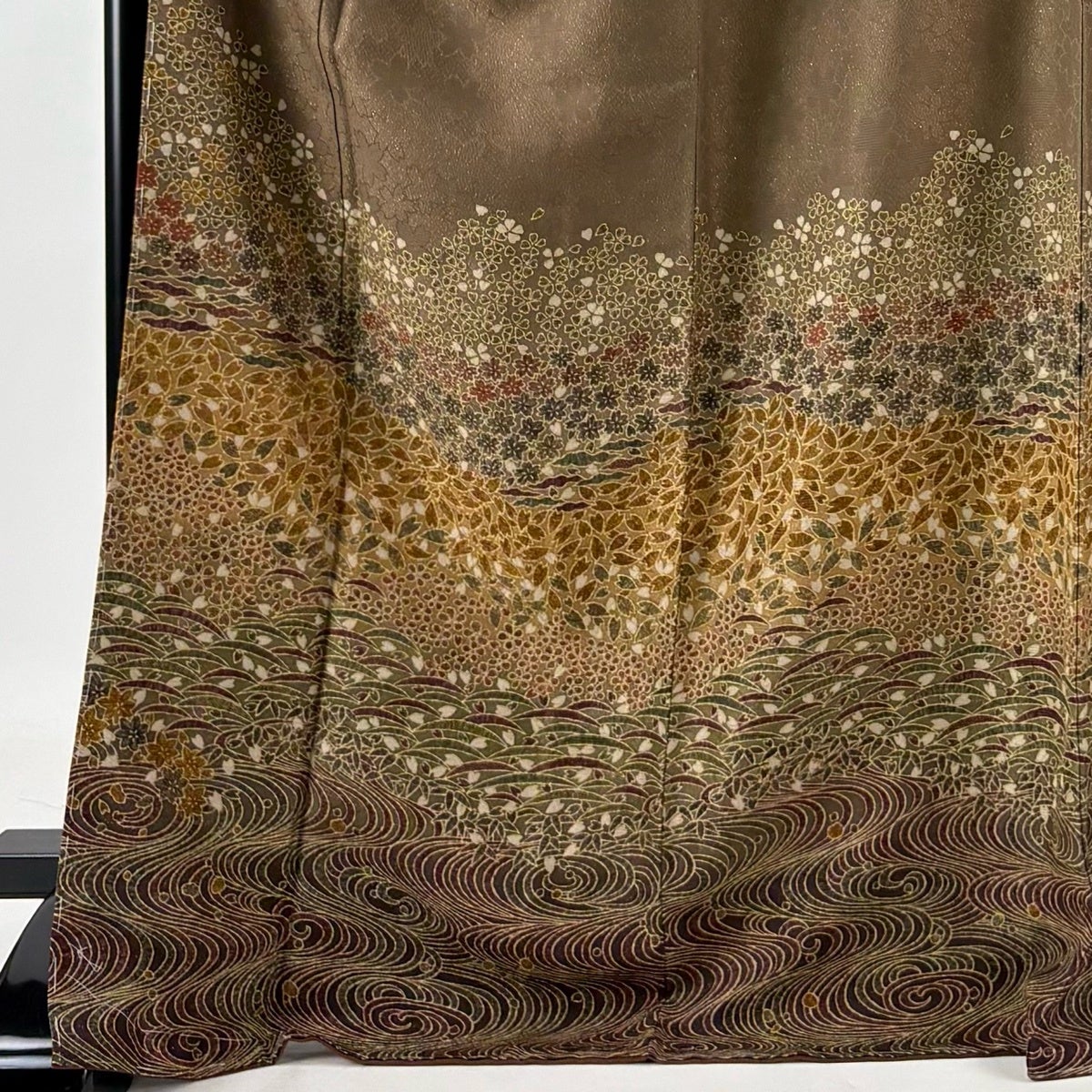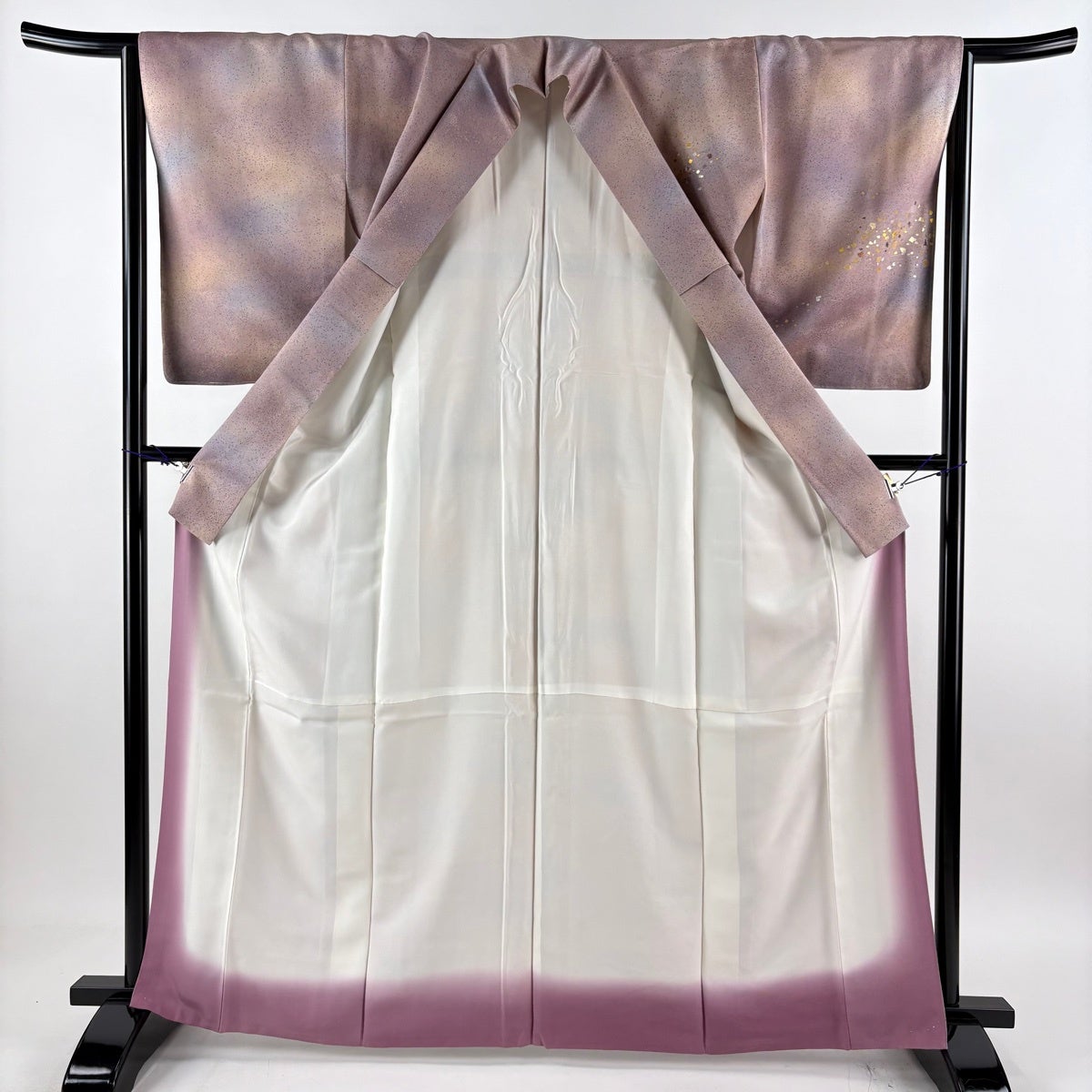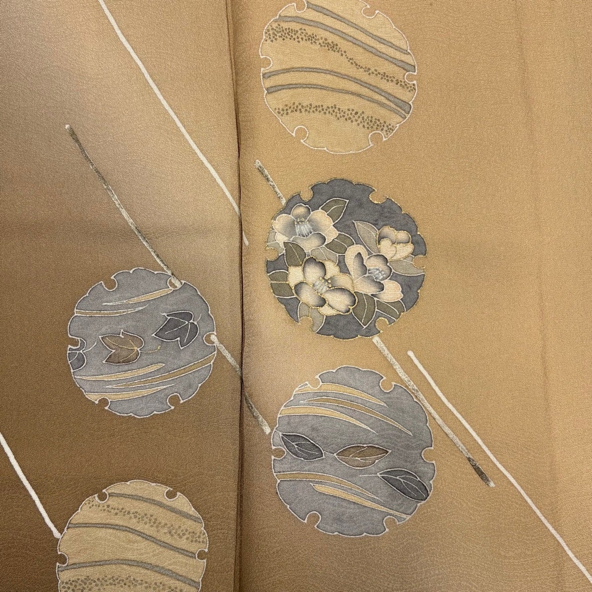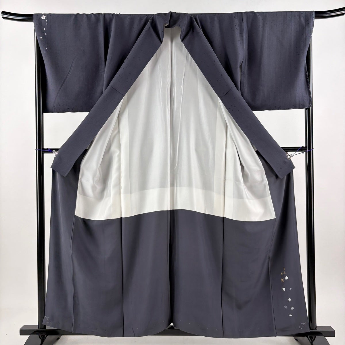 付け下げは訪問着を簡略化した訪問着より格が低くで小紋より格の高いの着物です。 特徴としては仕立て方の違いから訪問着などの一度真っさらな反物を着物の形に仮仕立てした後に柄付けをする絵羽模様とは違い、反物の状態で着用した時に柄付けが全て上を向くように書く事により左右の身頃や肩から袖にかけての模様が繋がっていない事です。 付け下げの歴史は他の着物に比べ浅く、戦時下に華美な訪問着が禁止された事で生まれた着物で、その後訪問着に比べ比較的安価で、それでいて着用シーンも訪問着とほぼ変わらないため大変好評になり、付け下げ訪問着と呼ばれる華やかな柄付けのものも考案された事により普及していきました。