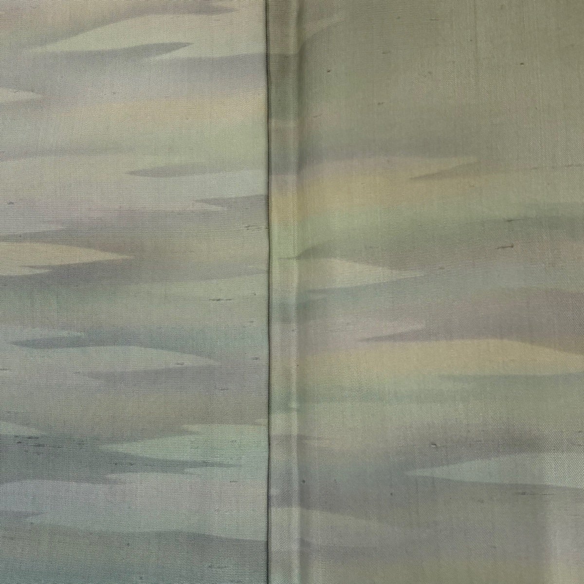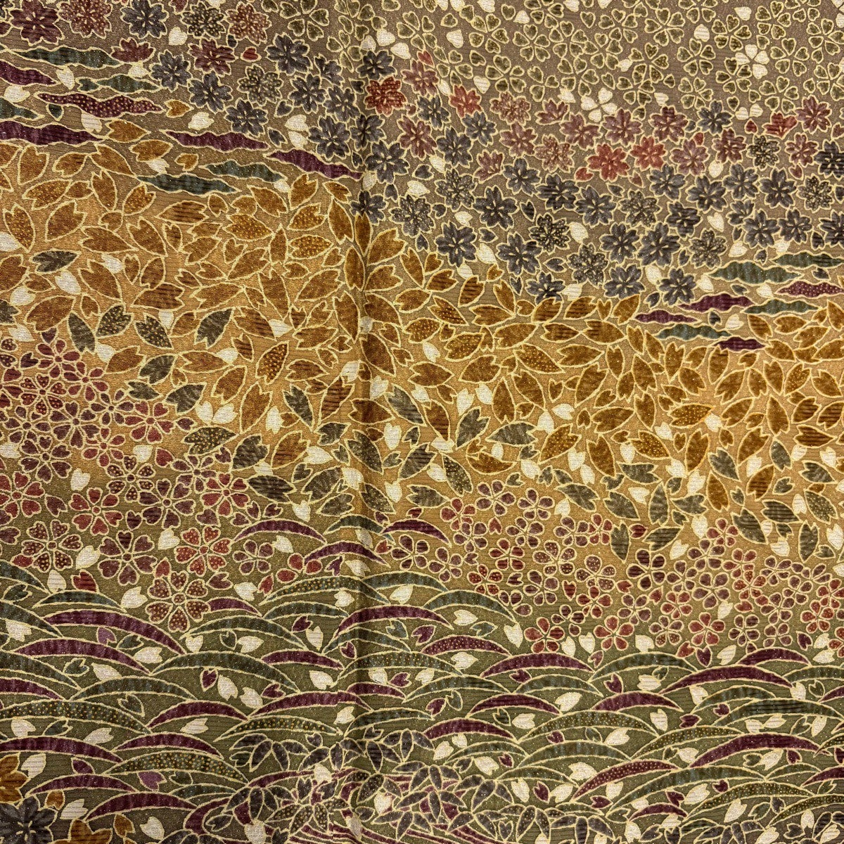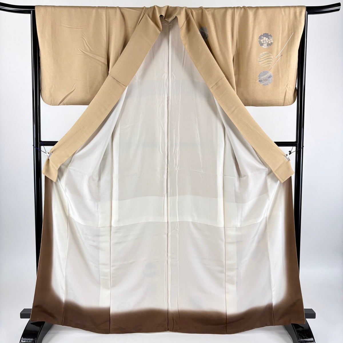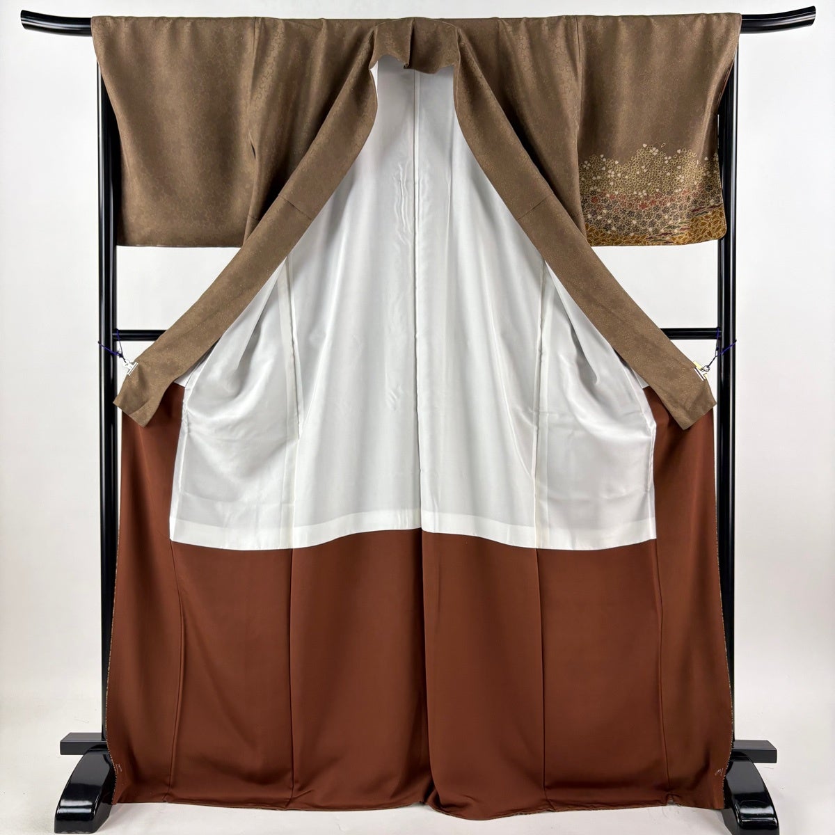 付け下げは訪問着を簡略化した訪問着より格が低くで小紋より格の高いの着物です。 特徴としては仕立て方の違いから訪問着などの一度真っさらな反物を着物の形に仮仕立てした後に柄付けをする絵羽模様とは違い、反物の状態で着用した時に柄付けが全て上を向くように書く事により左右の身頃や肩から袖にかけての模様が繋がっていない事です。 付け下げの歴史は他の着物に比べ浅く、戦時下に華美な訪問着が禁止された事で生まれた着物で、その後訪問着に比べ比較的安価で、それでいて着用シーンも訪問着とほぼ変わらないため大変好評になり、付け下げ訪問着と呼ばれる華やかな柄付けのものも考案された事により普及していきました。