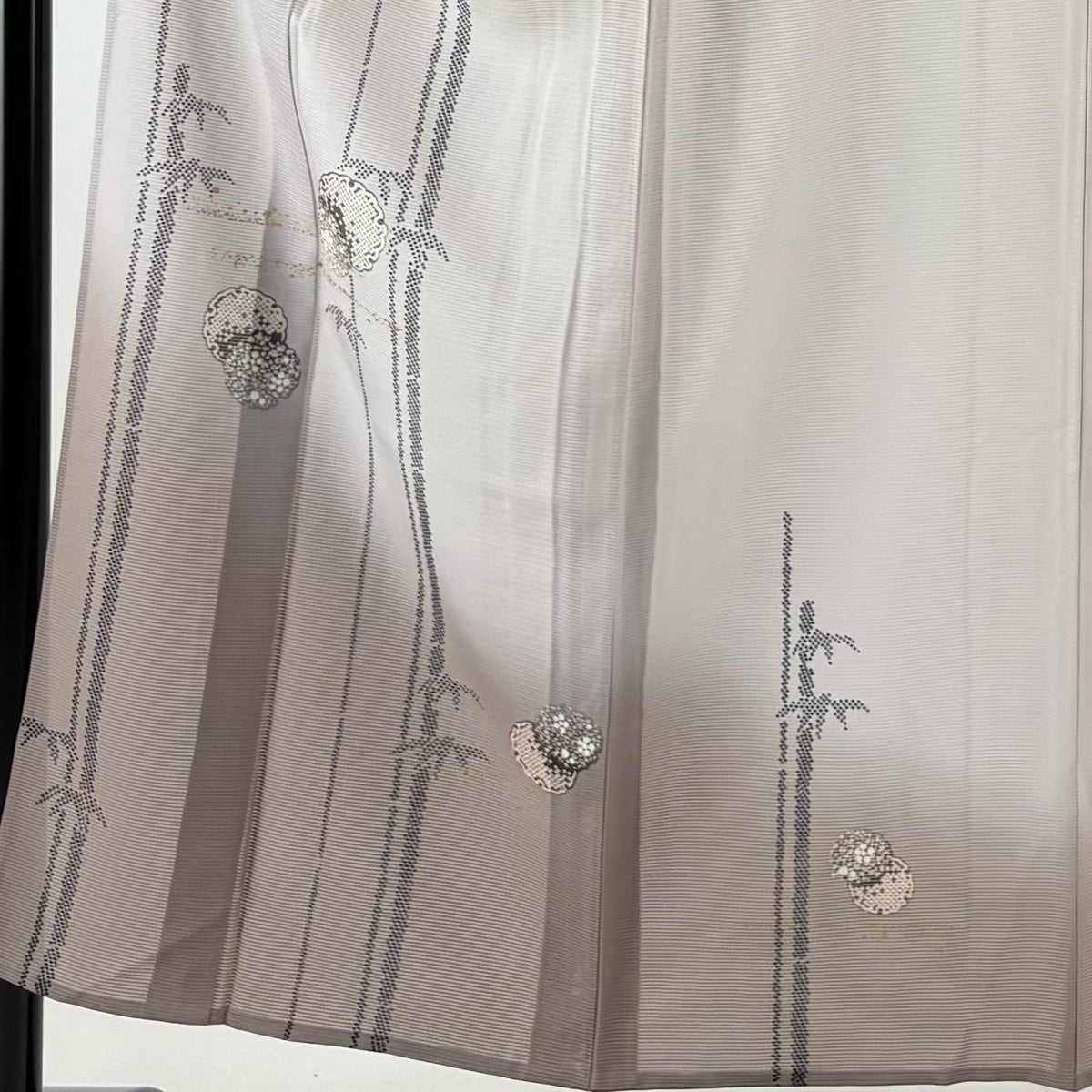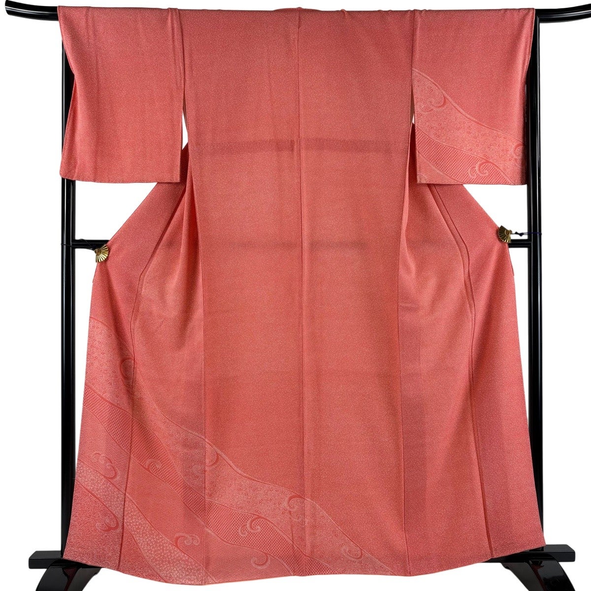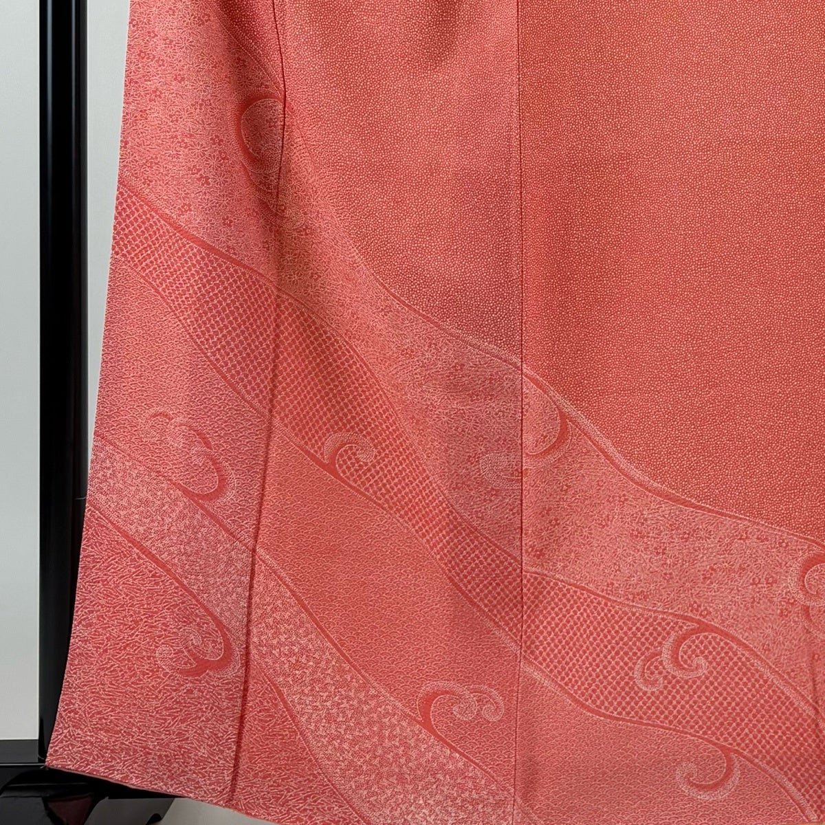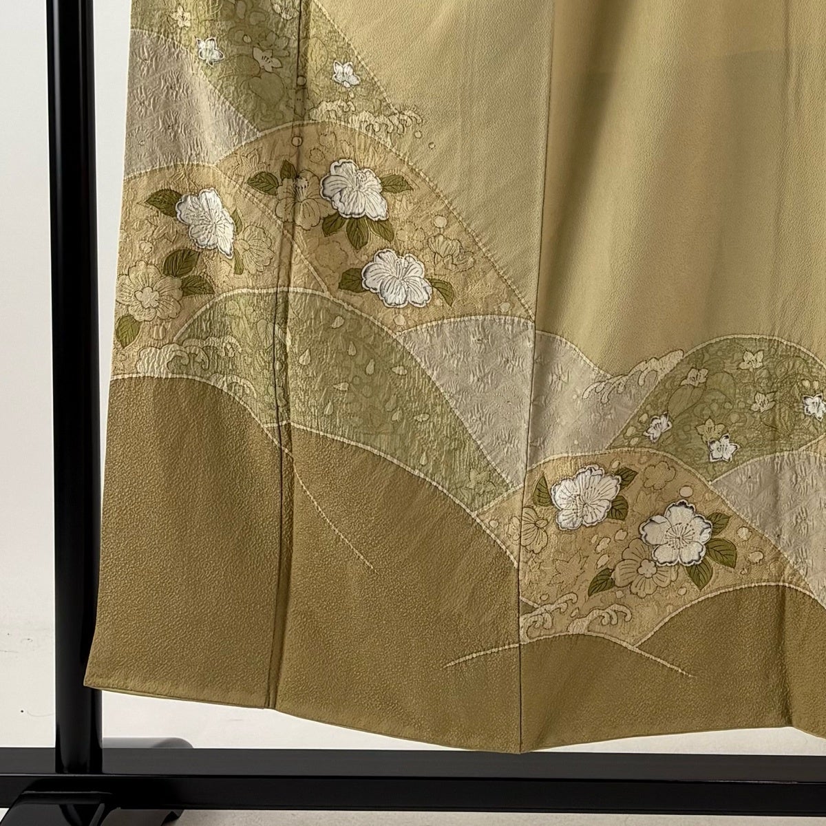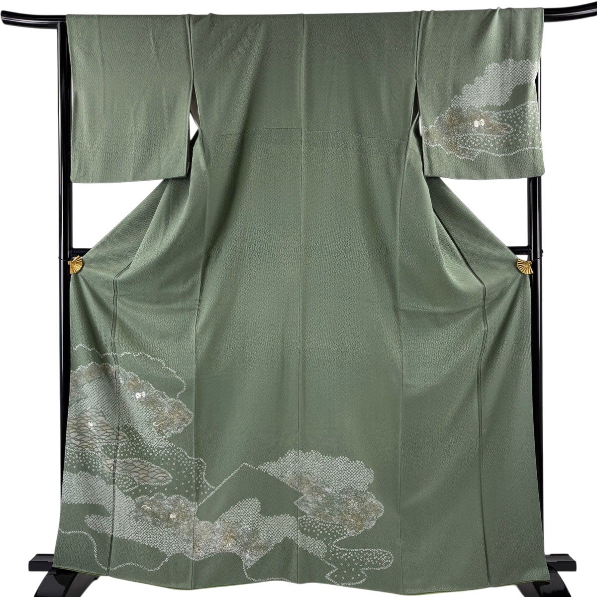 付け下げは訪問着を簡略化した訪問着より格が低くで小紋より格の高いの着物です。 特徴としては仕立て方の違いから訪問着などの一度真っさらな反物を着物の形に仮仕立てした後に柄付けをする絵羽模様とは違い、反物の状態で着用した時に柄付けが全て上を向くように書く事により左右の身頃や肩から袖にかけての模様が繋がっていない事です。 付け下げの歴史は他の着物に比べ浅く、戦時下に華美な訪問着が禁止された事で生まれた着物で、その後訪問着に比べ比較的安価で、それでいて着用シーンも訪問着とほぼ変わらないため大変好評になり、付け下げ訪問着と呼ばれる華やかな柄付けのものも考案された事により普及していきました。